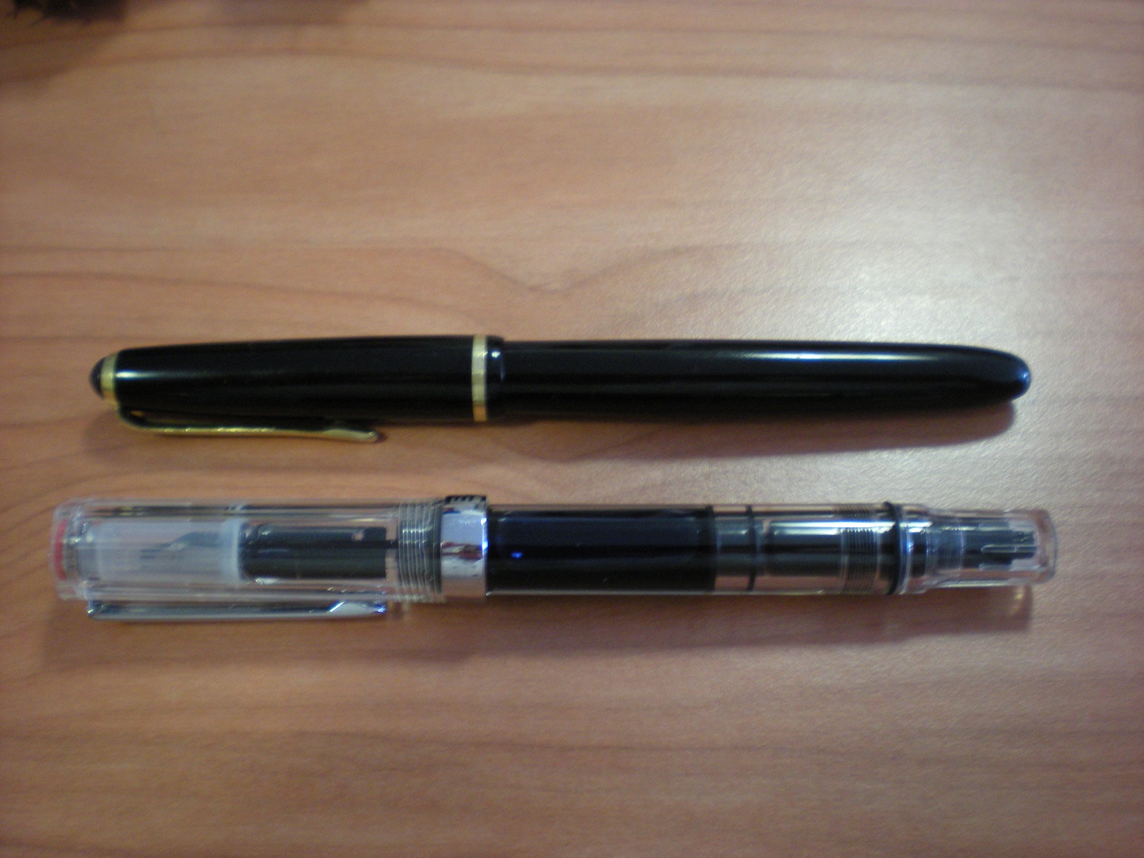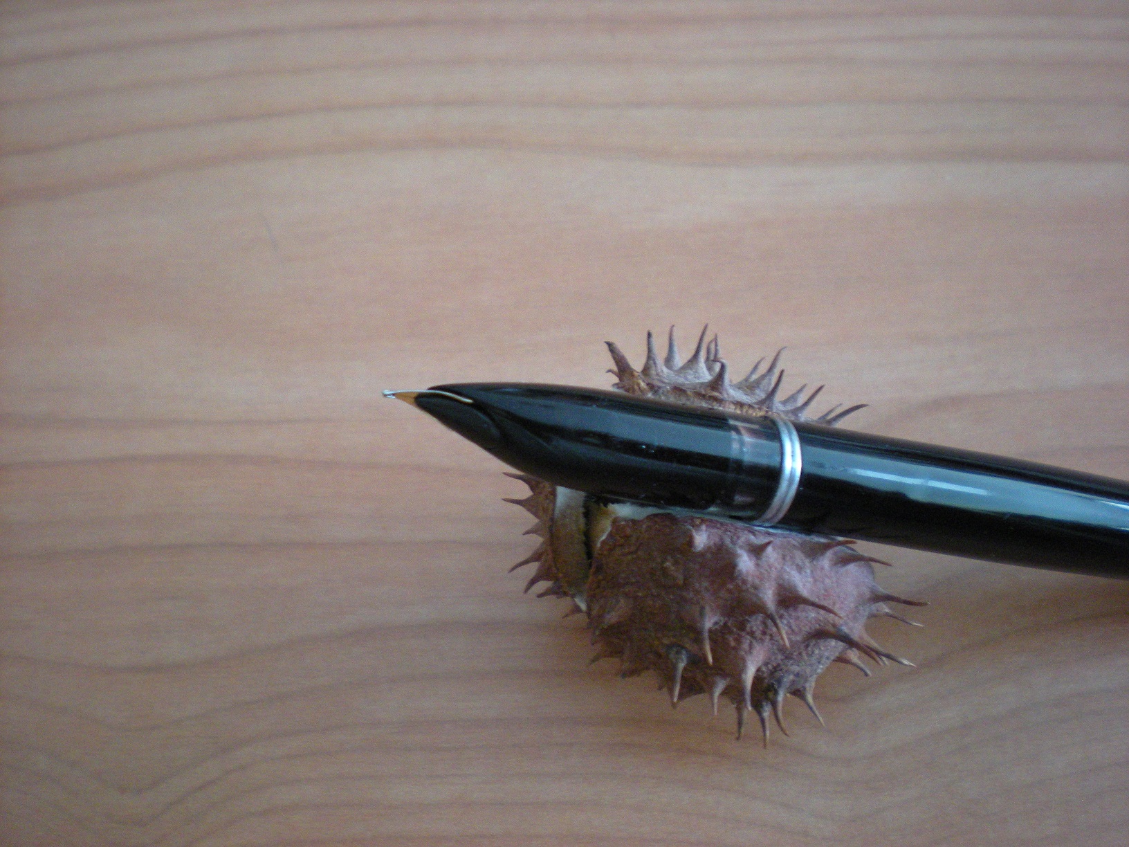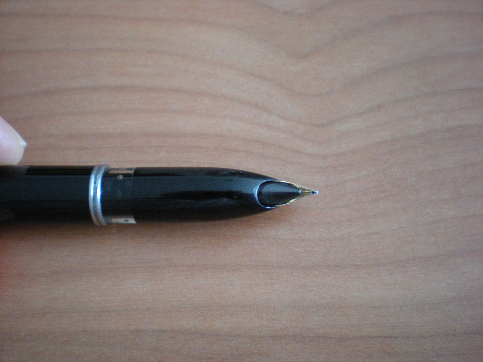 Salve a tutti,questa penna era stata gettata nel cestino della carta da un mio conoscente, l'ho recuperata e rimessa in carreggiata. Aveva il serbatoio con due crepe longitudinali che ho sigillato con l' Attack e poi levigato. Ho sigillato anche la crepa sul fusto ripassando con un incisore per modellismo la filettatura interna. Lavata e lucidata un po' non mi sembra male. Sul fusto a stento si leggono, su tre righe sovrapposte, le parole: V...... - AUTOVAC - MADE IN ITALY. Sul Wiki,alla lettera V, non ho trovato niente di simile. Lo stile ricorda la Parker e l'Aurora. Il sistema di caricamento è a siringa e la guarnizione di testa tiene ancora bene. Penso che la penna sia stata un modello economico per via della fattura del pennino, in acciaio dorato, con la punta ottenuta per stampaggio.