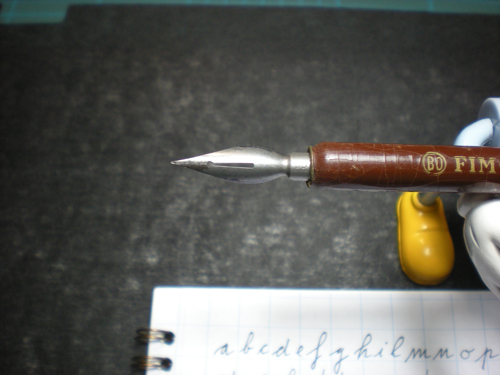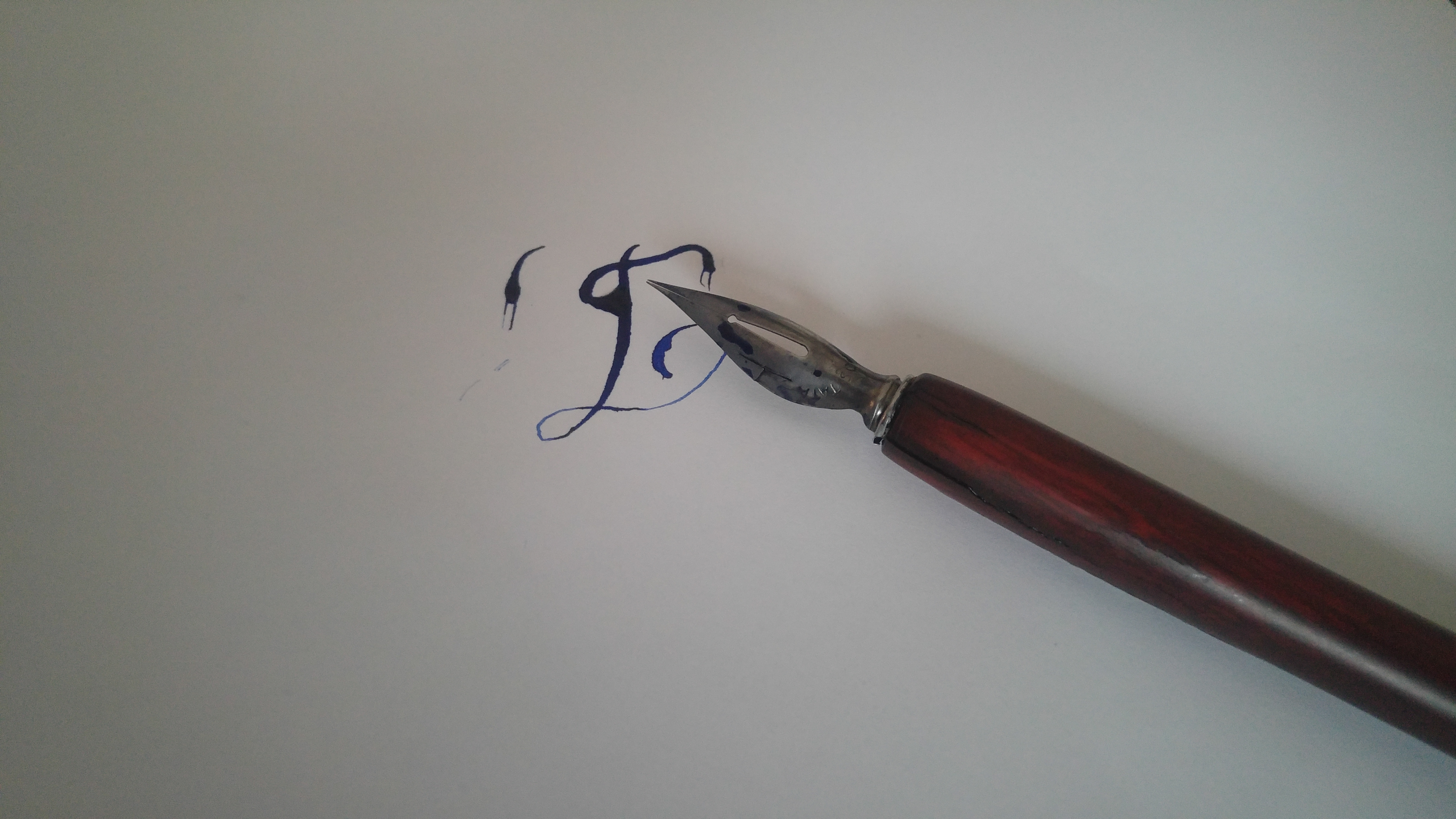 Salve, bagnarlo con la saliva oppure una passata sulla fiamma di un accendino e/o candela (più vintage). A parte questo mi sembra che il tuo pennino abbia le punte troppo aperte, allego due foto volanti (scusate per la qualità) di un pennino simile con qualche lettera altrettanto volante. Ho perso un po' la mano con questi pennini che sono stati compagni di scuola per i cinque anni delle elementari.