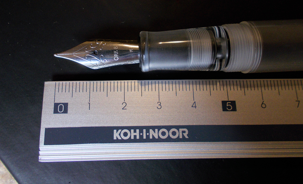 Il caricamento a contagocce è un salto nel passato, e il fatto che Opus 88 lo abbia saputo interpretare in chiave moderna eliminandone i difetti, integrandolo in una penna stilografica dalla splendida estetica minimalista e molto ben realizzata, rendono la “Koloro” un ottimo acquisto. Chi non ama le penne “demonstrator” potrà orientarsi su una delle tante varianti colorate o uno degli altri modelli della casa, che hanno in comune il caricamento a contagocce. Il flusso davvero abbondante, che comunque ha i suoi estimatori, rappresenta per me un problema, dal momento che ho una grafia minuta. Se dovessi prendere in considerazione l’acquisto, sceglierei un pennino fine, più adatto alle mie esigenze, come ho fatto con le mie Pelikan. Ciononostante è con un po’ di nostalgia che mi appresto a rimettere la penna nella sua scatola, dopo averla pulita a fondo (nessun problema di residui di inchiostro) per restituirla al negozio che cortesemente l’ha messa a disposizione. Vorrei passare ancora qualche minuto a rimirarla tra le mani, svitare il tappo e dare un’ultima occhiata al pennino.