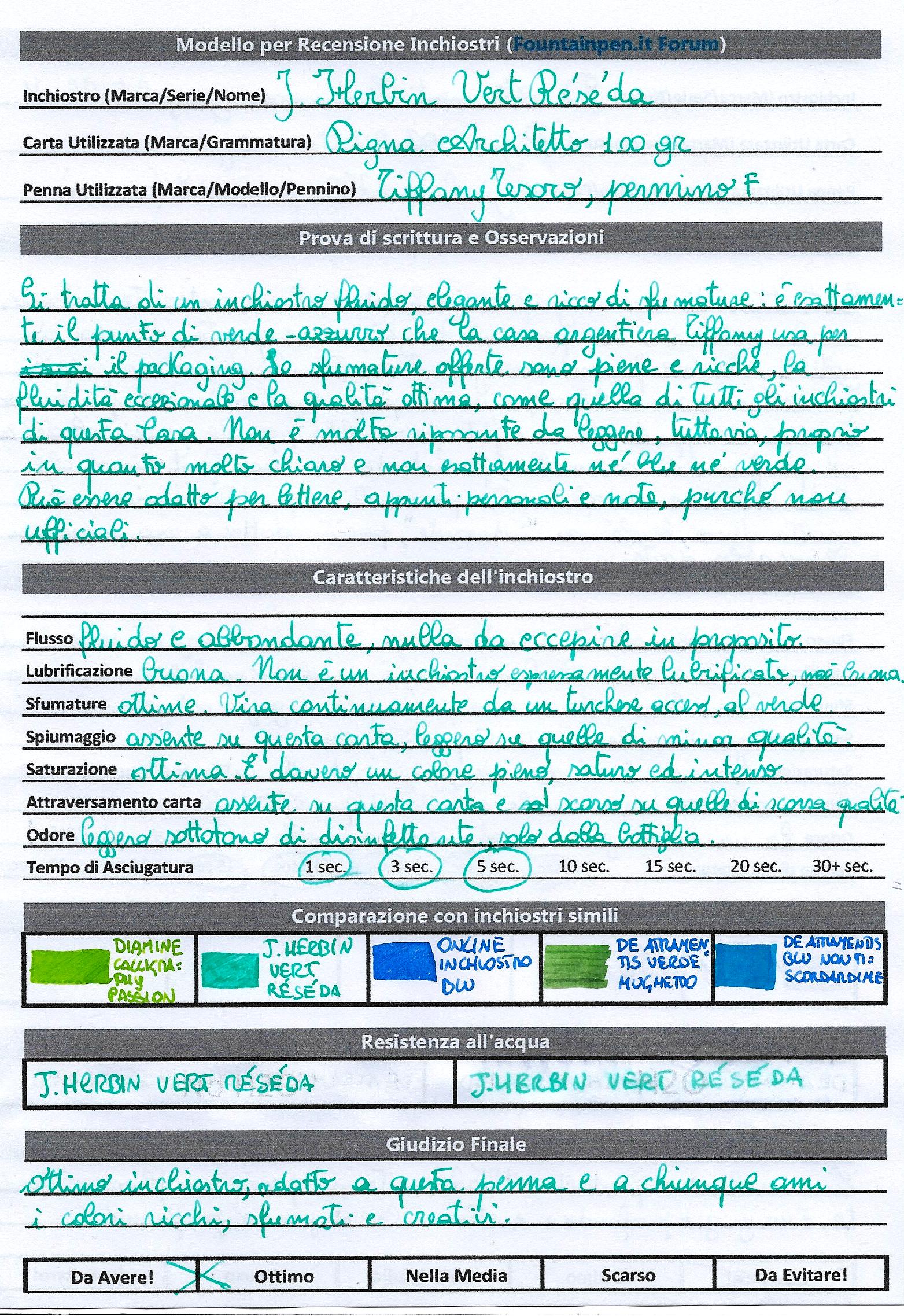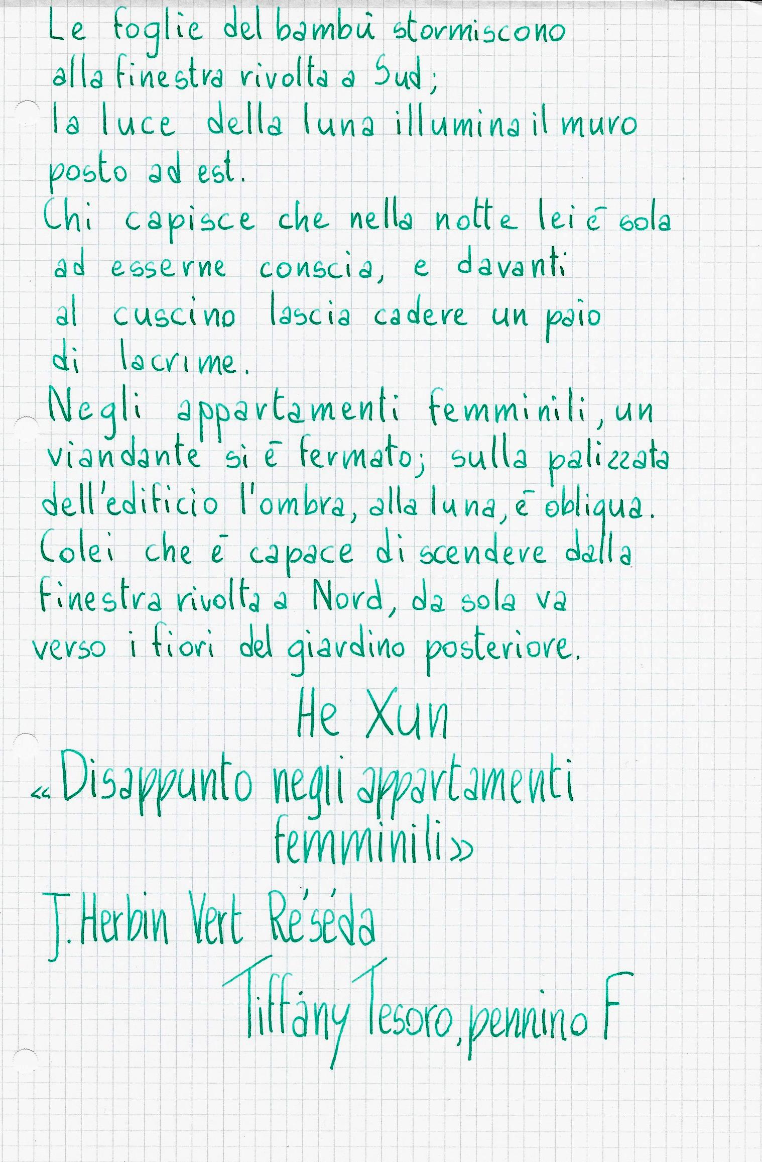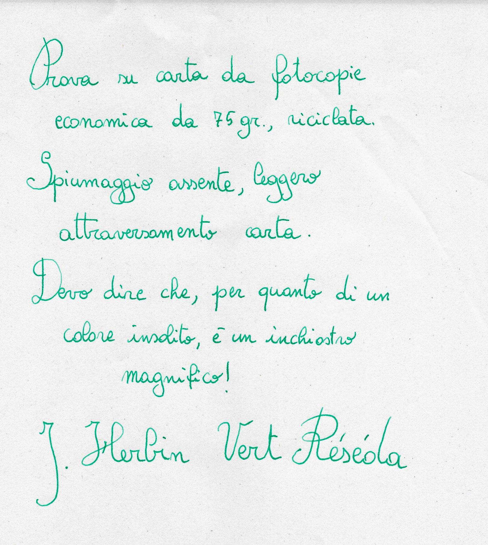 Questa volta, mi dedico a uno dei pochi elementi offerti dalla scala cromatica J. Herbin non ancora recensito su questo forum, il Vert Réséda.