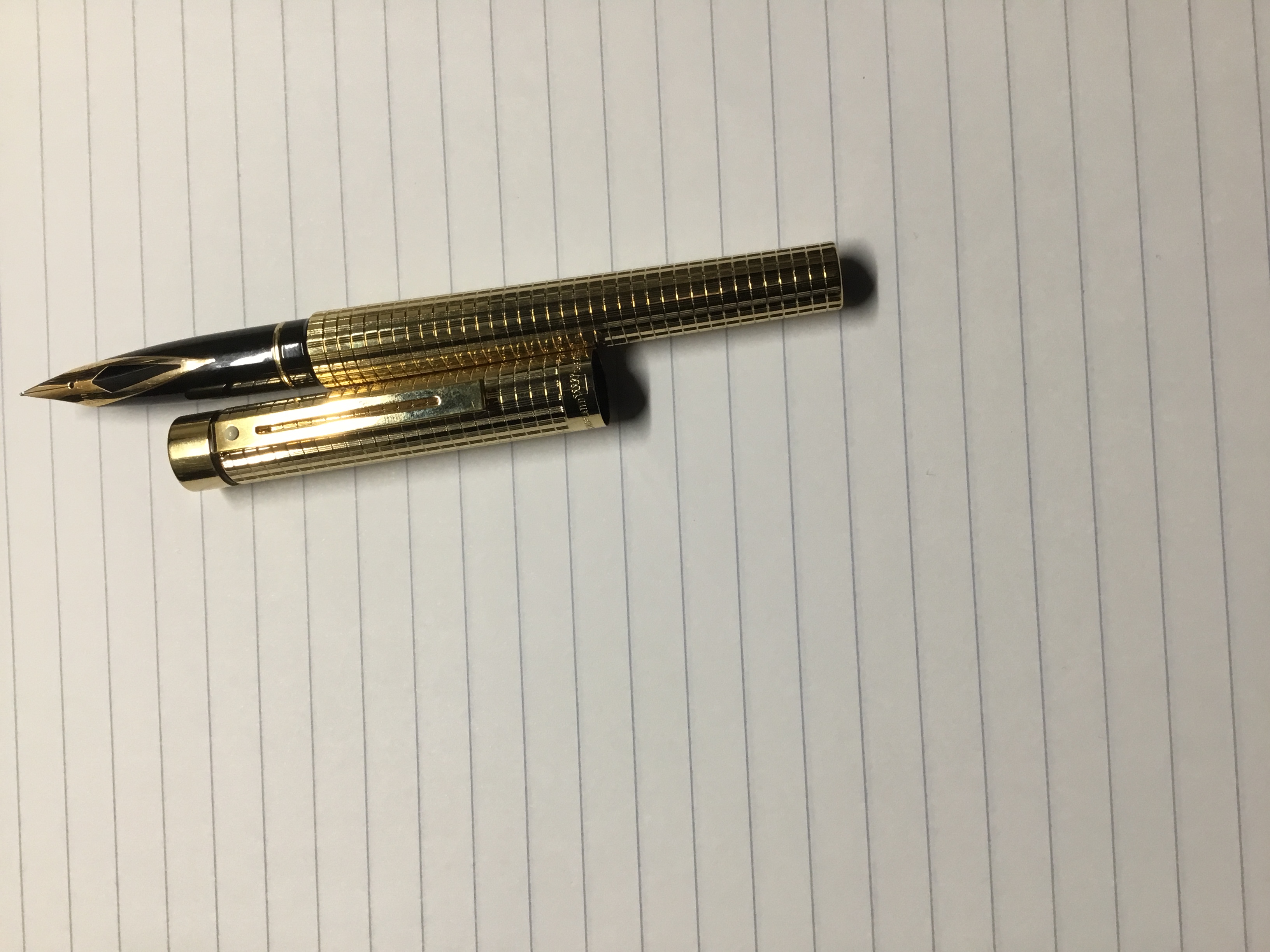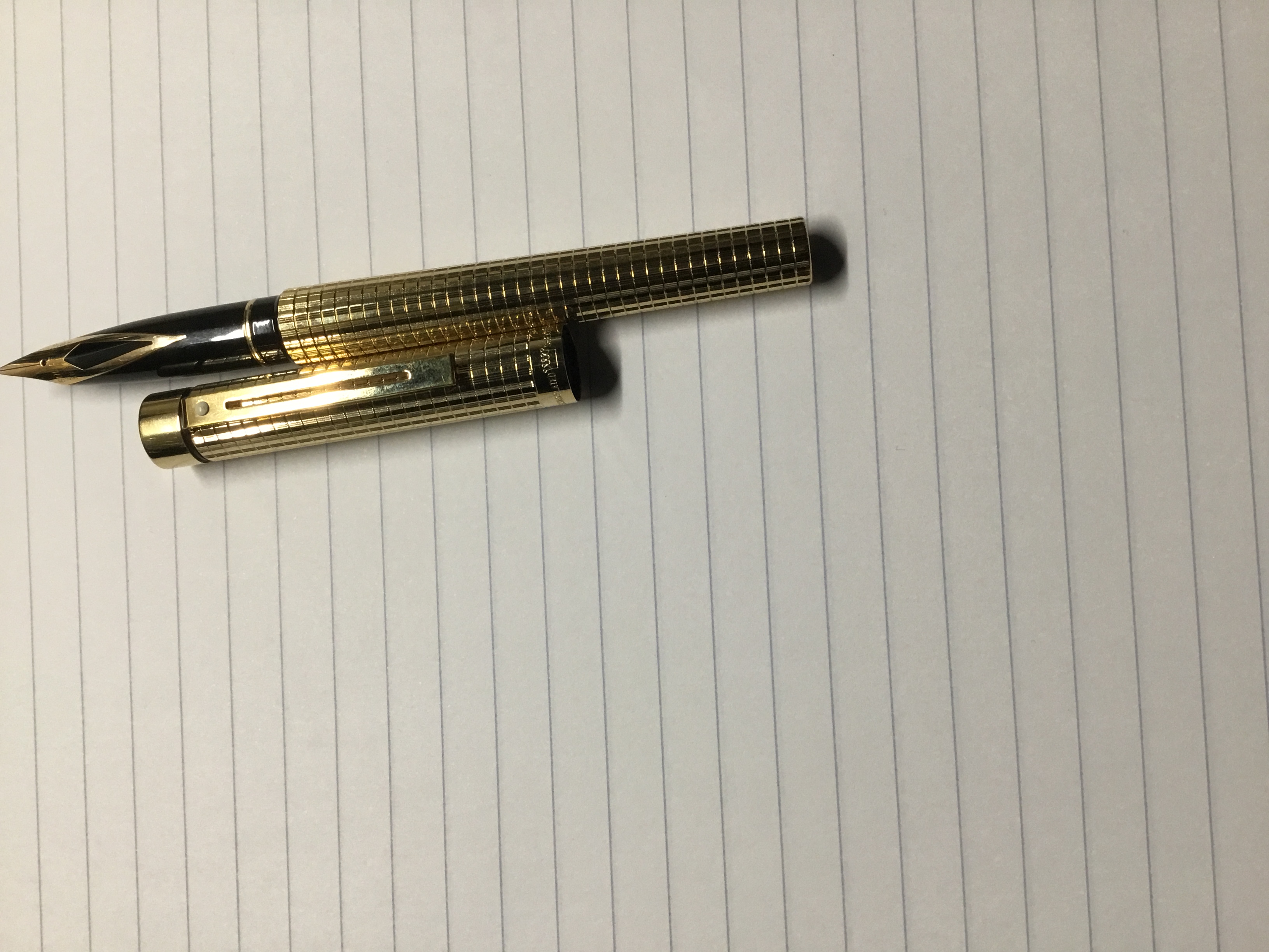 Ragazzi mi piace collezionare Montblanc ma quando ad un mercatino vedo una penna così sconosciuta a chi la vende non resisto per me anche se non è antica continua ad essere un opera d’arte , non so cosa ne pensiate voi ma il pennino realizzato in quel modo per me è fantastico . Poi dorata in questo modo ...un gioiello ... penso sia una shaeffer TARGA ma non ne sono sicuro al 100%.