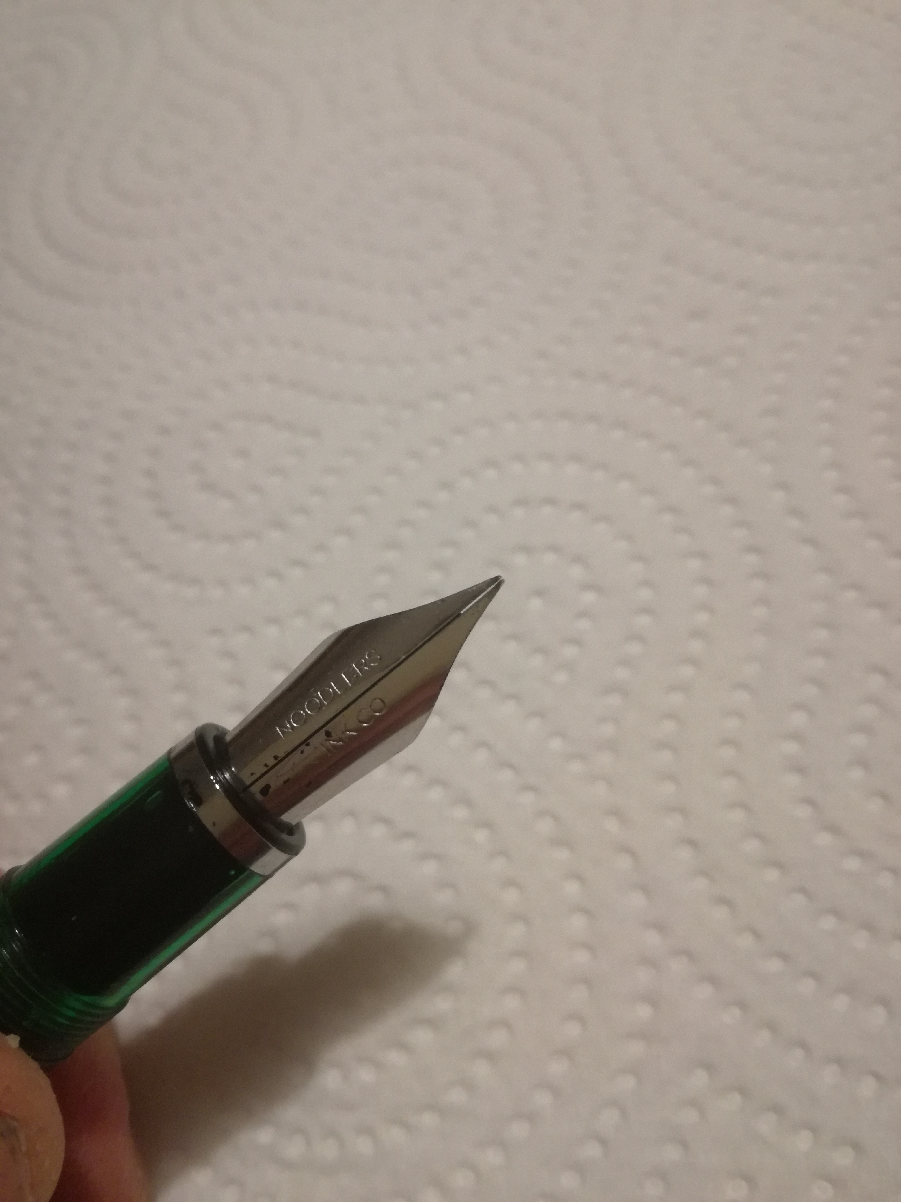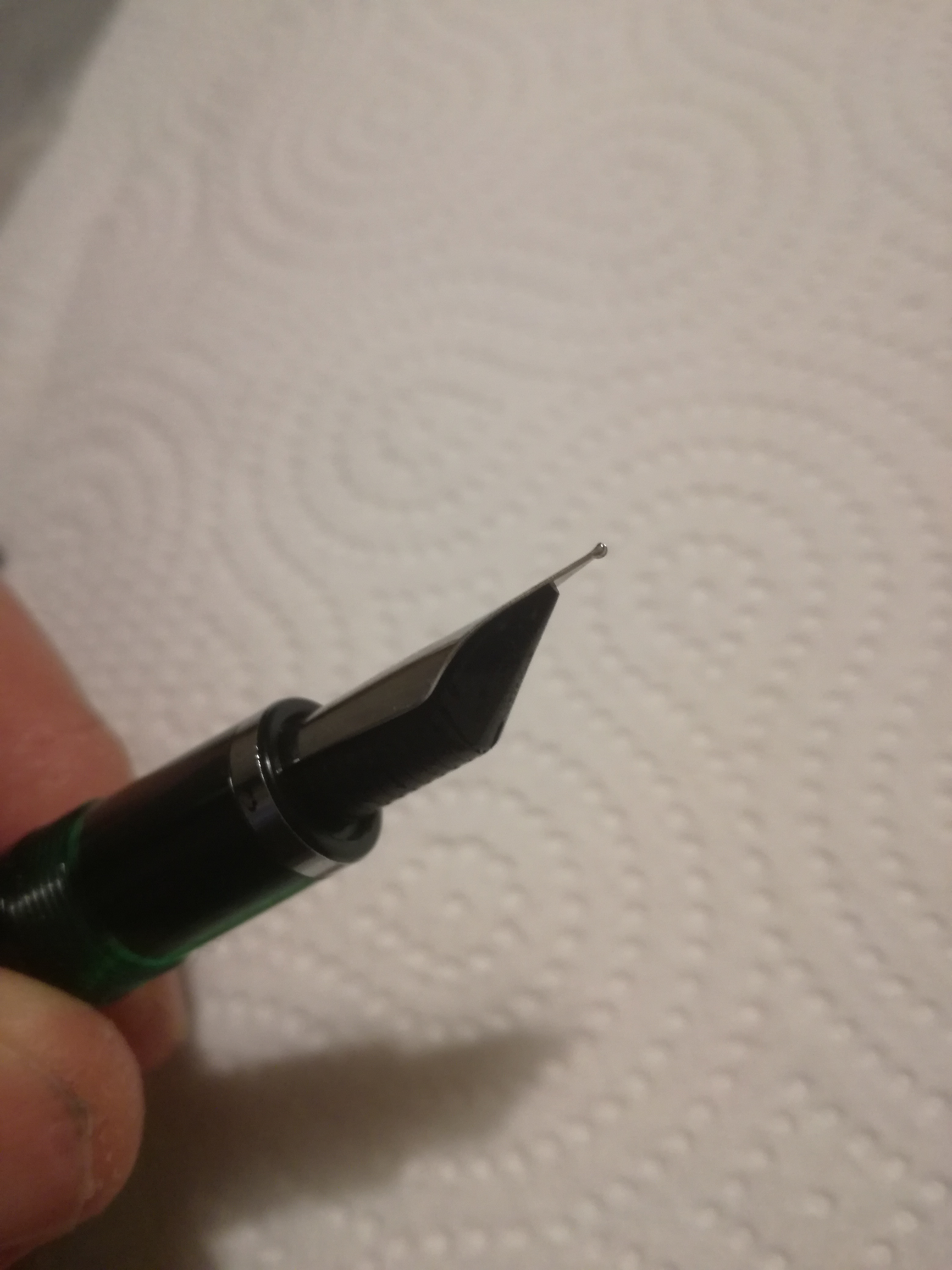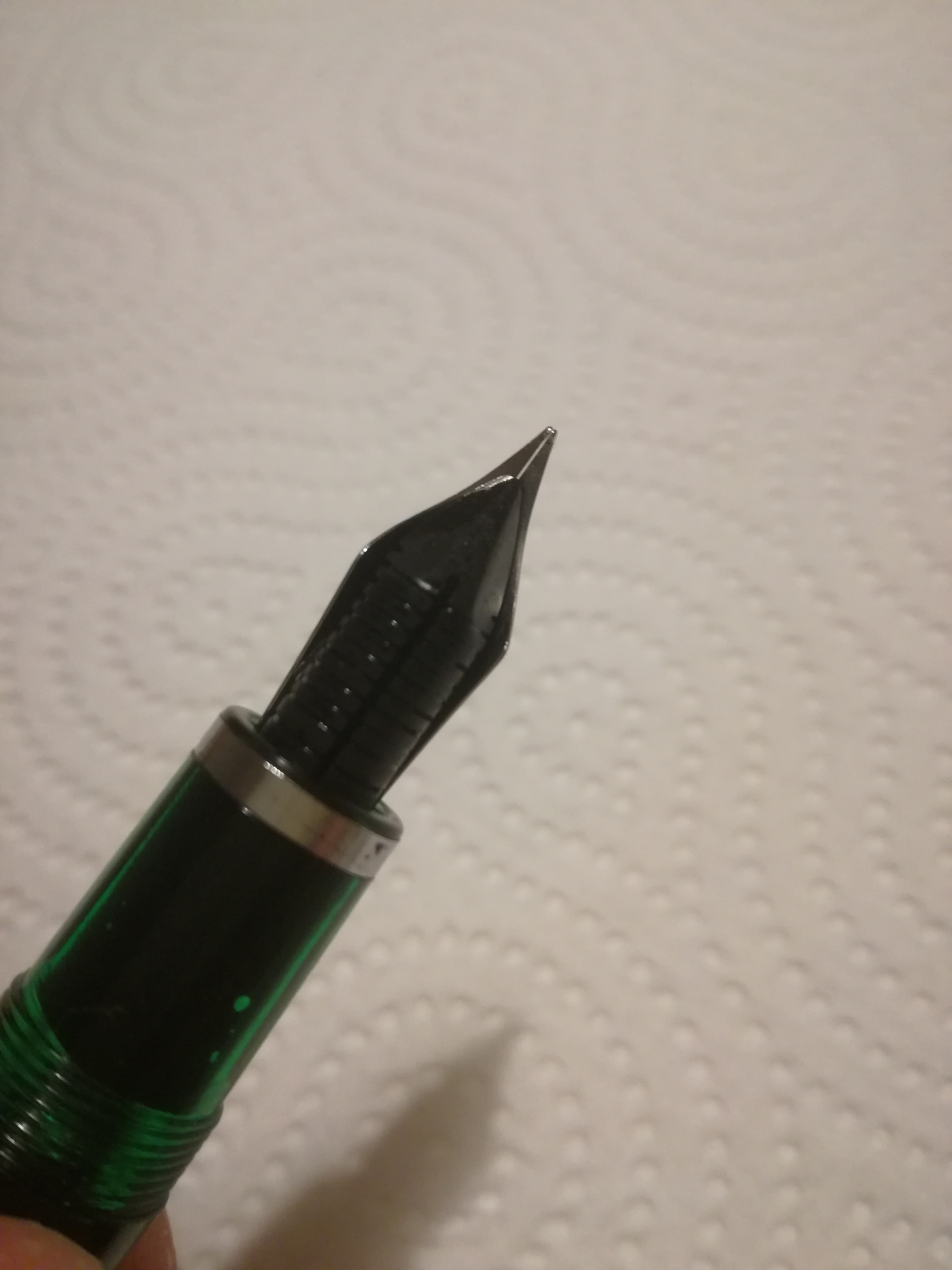 Lavato la penna accuratamente; provato ad aggiustare il posizionamento dell'alimentatore rispetto al pennino (ora è molto fuori, ma non cambia la situazione); caricato e scaricato più volte la penna; ho provato a sistemare alimentatore e pennino come mostrato ovunque, scaldando l'alimentatore in acqua bollente e premendolo col pennino (sarà, ma era durissimo comunque..