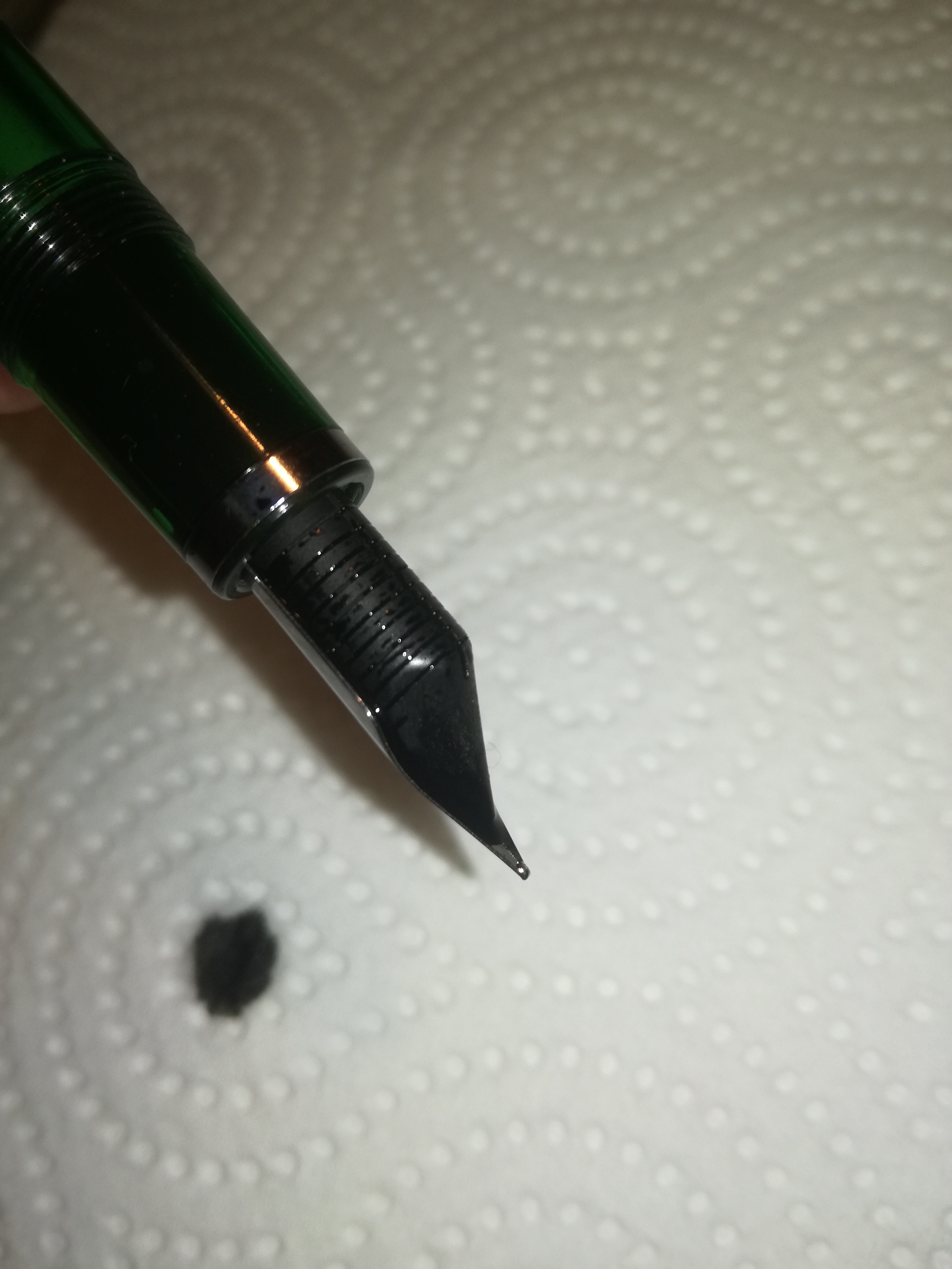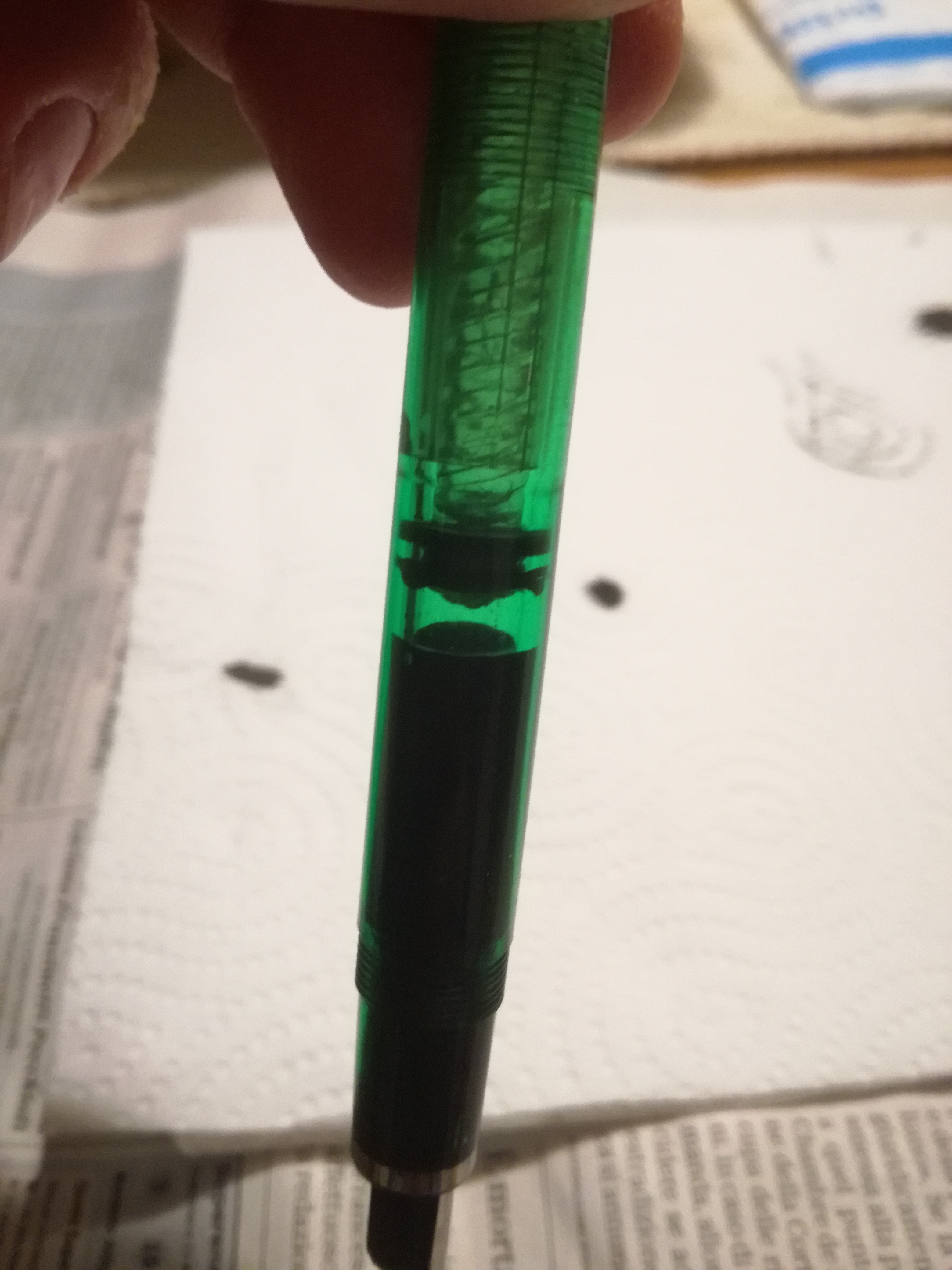 Nella pratica, per scrivere devo spingere il pistone quel tanto che basta a far uscire una goccia di inchiostro. Appena si bagna il pennino, scrive ovviamente. Ma oltre a sporcare ovunque, appena si esaurisce la bolla di inchiostro, torna a secco: non passa dall'alimentatore al pennino (e sono più che aderenti..)! E questo vale anche se lo appoggio su carta assorbente. Se tocco l'alimentatore, invece è bagnato.