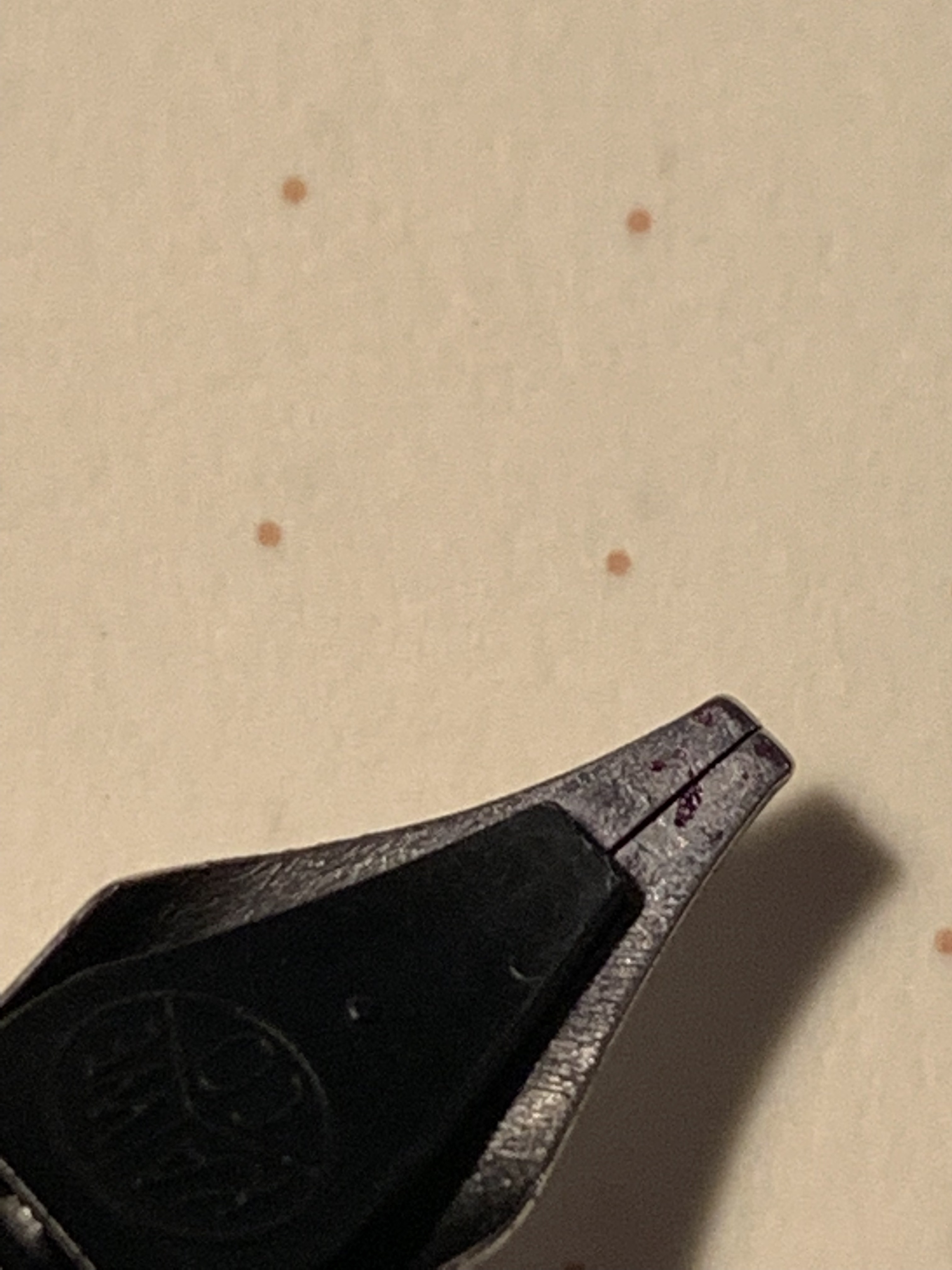 Io inizierei a controllare che tra alimentatore e pennino non ci sia spazio in punta e poi passerei a dare una pulizia approfondita. Con sgrassatore Chantecleir e spazzolino darei una bella pulita all'alimentatore e al pennino senza trascurare l'interno della sezione. Se così non risolvi proverei anche con un risciacquo con acqua e detersivo per piatti.