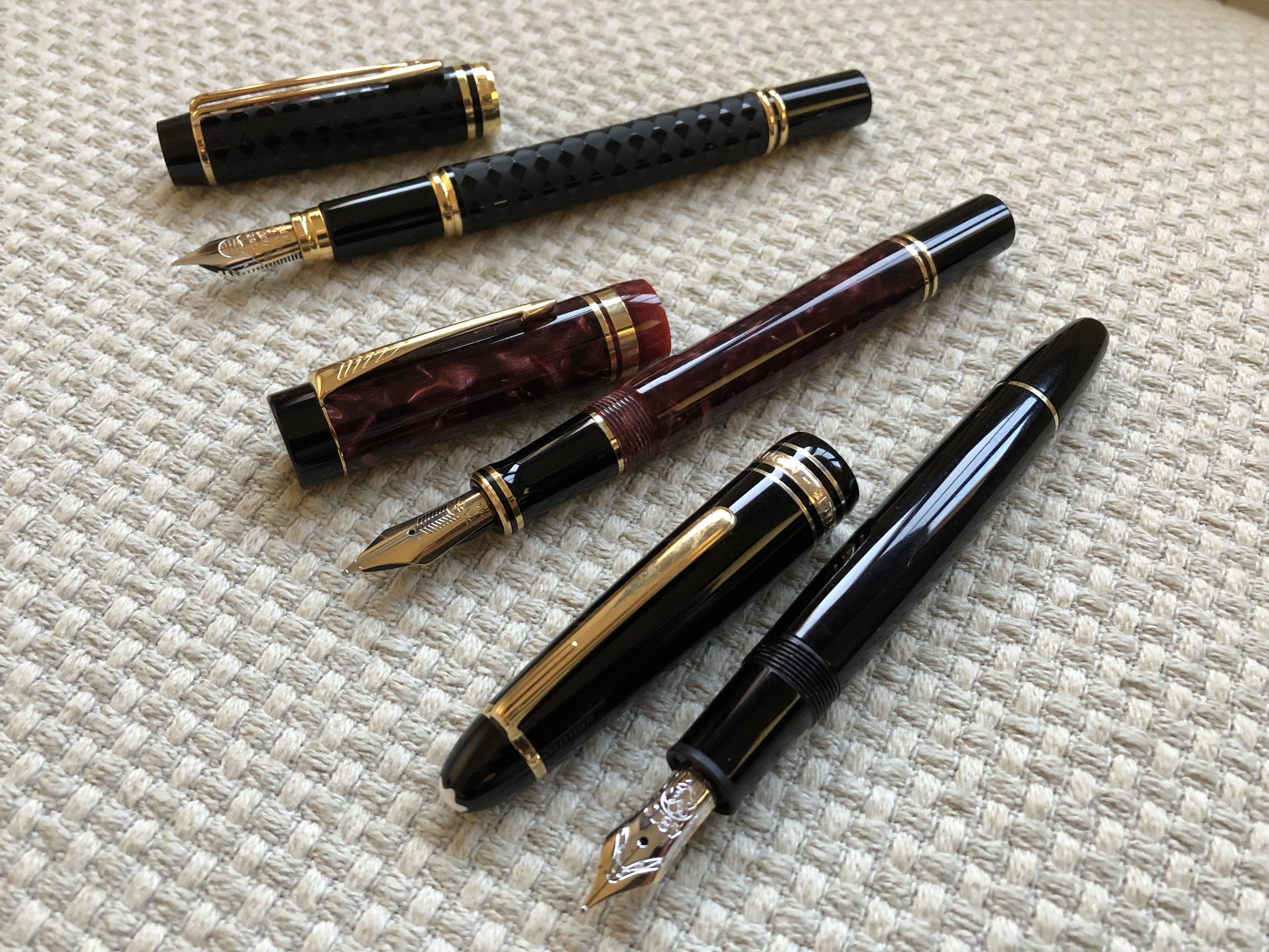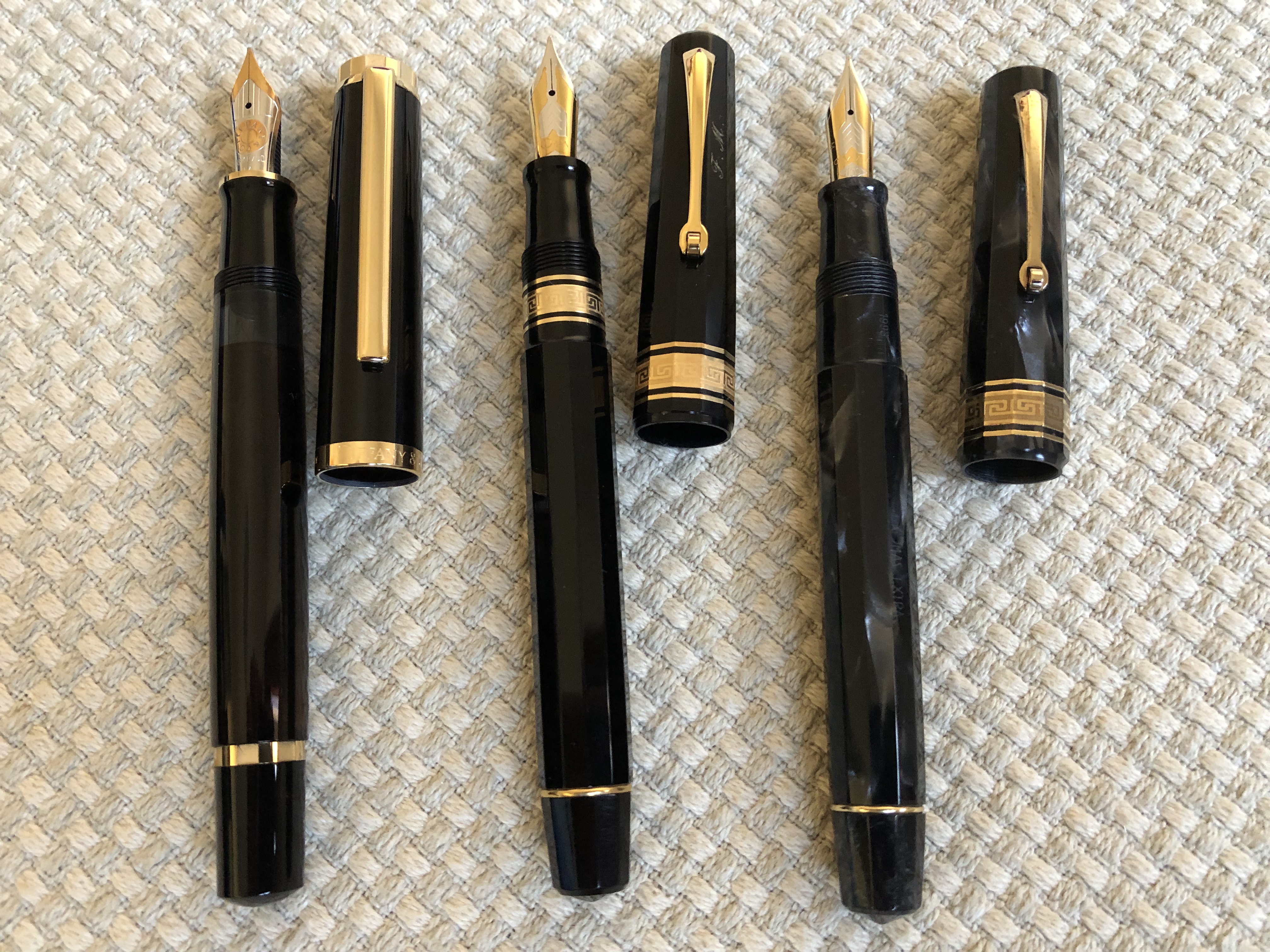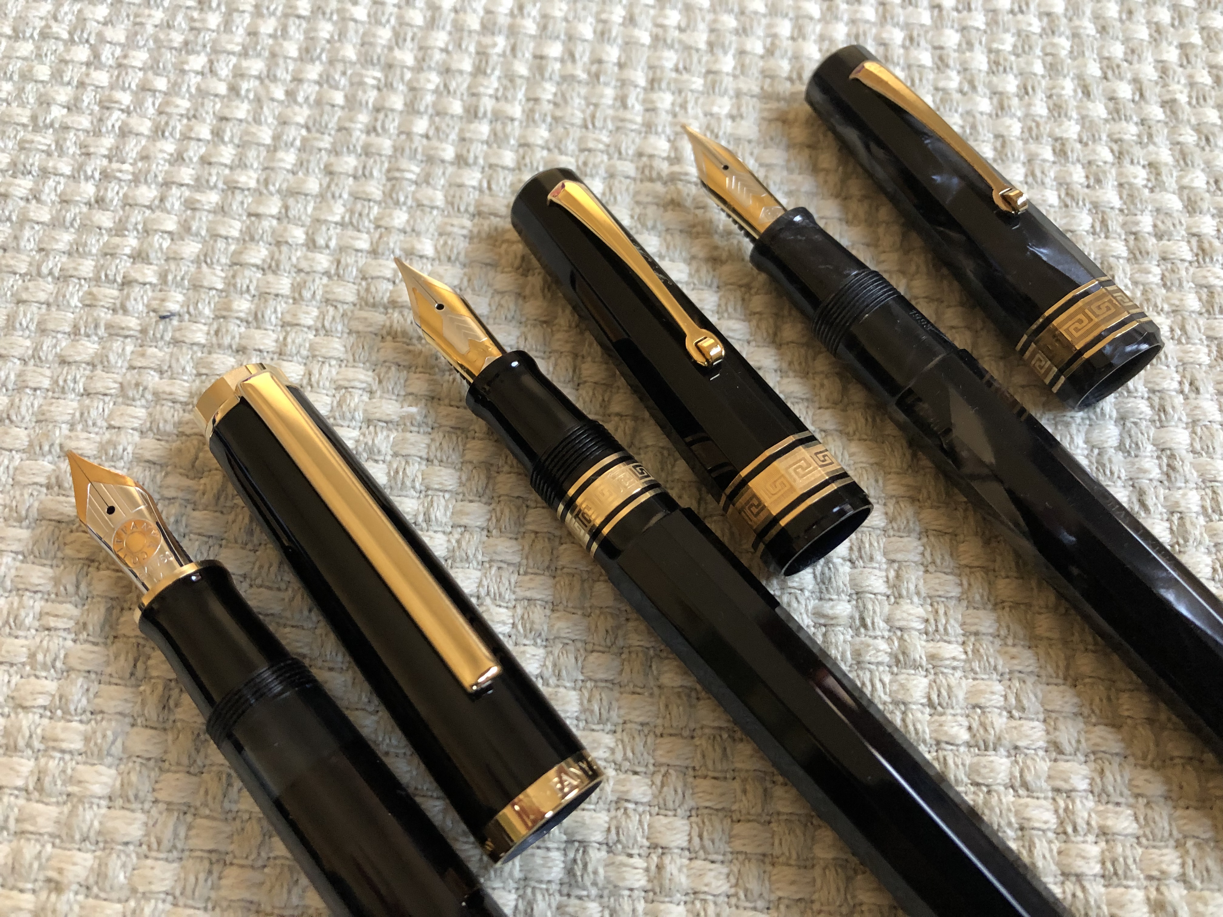 oggi complice il relax domenicale ho fatto qualche foto a delle penne tipiche della produzione anni 80-90, cui sono molto legato e che si ponevano come alternativa alla MB 146 (Man 100, Paragon, Pelikan M800 qui in versione Tiffany Atlas). Alcune penne sono fuori produzione, altre come la Duofold hanno assunto un look più “moderno”. La MB invece é sempre immutabile.