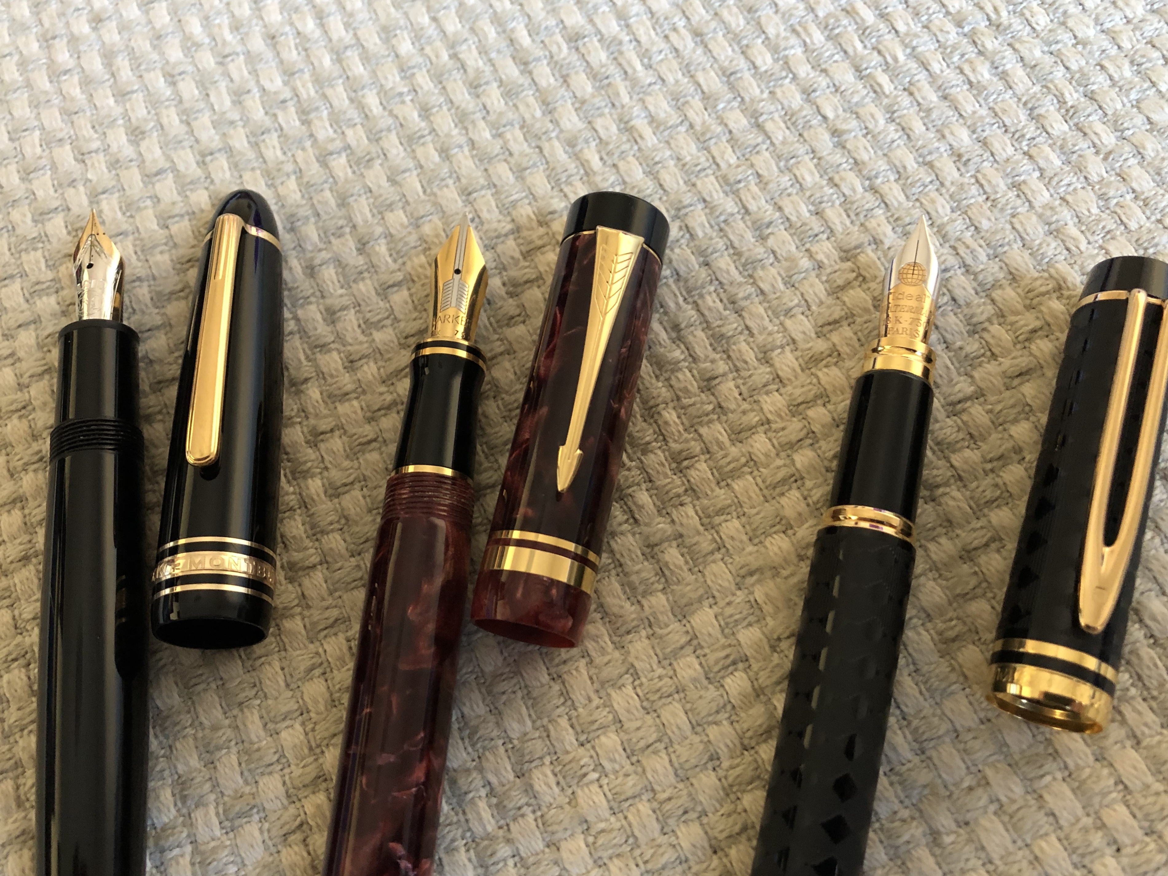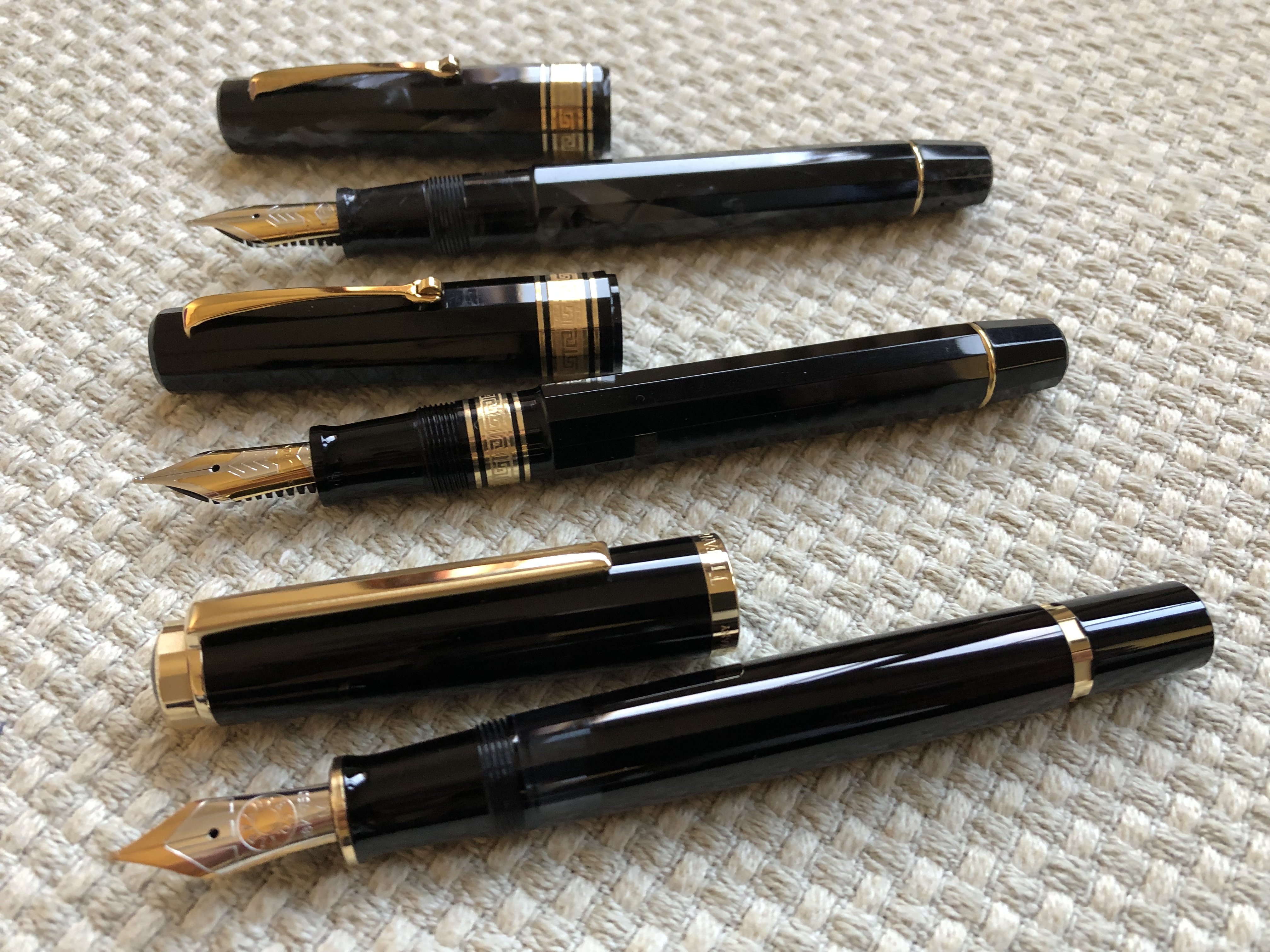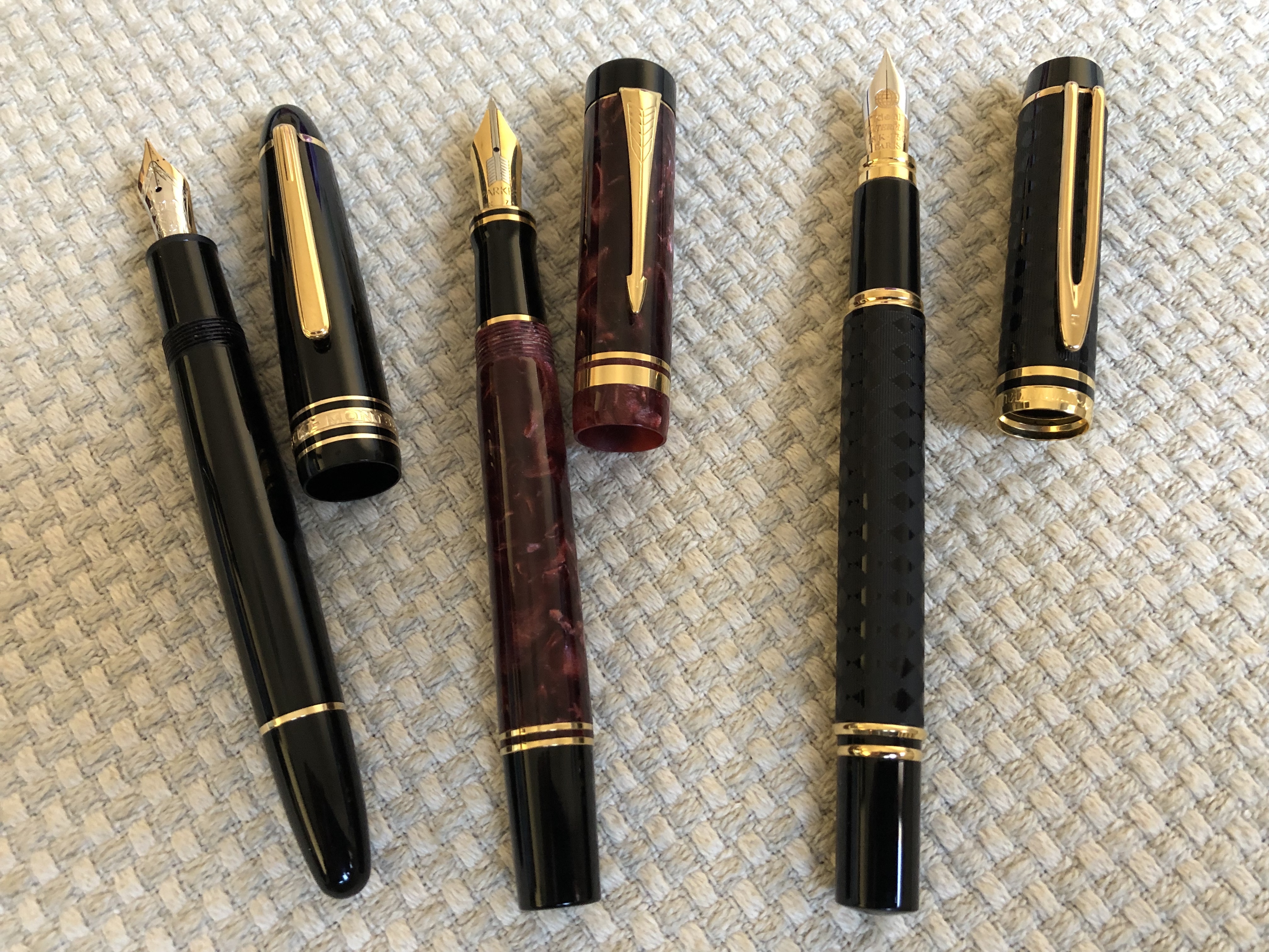 oggi complice il relax domenicale ho fatto qualche foto a delle penne tipiche della produzione anni 80-90, cui sono molto legato e che si ponevano come alternativa alla MB 146 (Man 100, Paragon, Pelikan M800 qui in versione Tiffany Atlas). Alcune penne sono fuori produzione, altre come la Duofold hanno assunto un look più “moderno”. La MB invece é sempre immutabile.