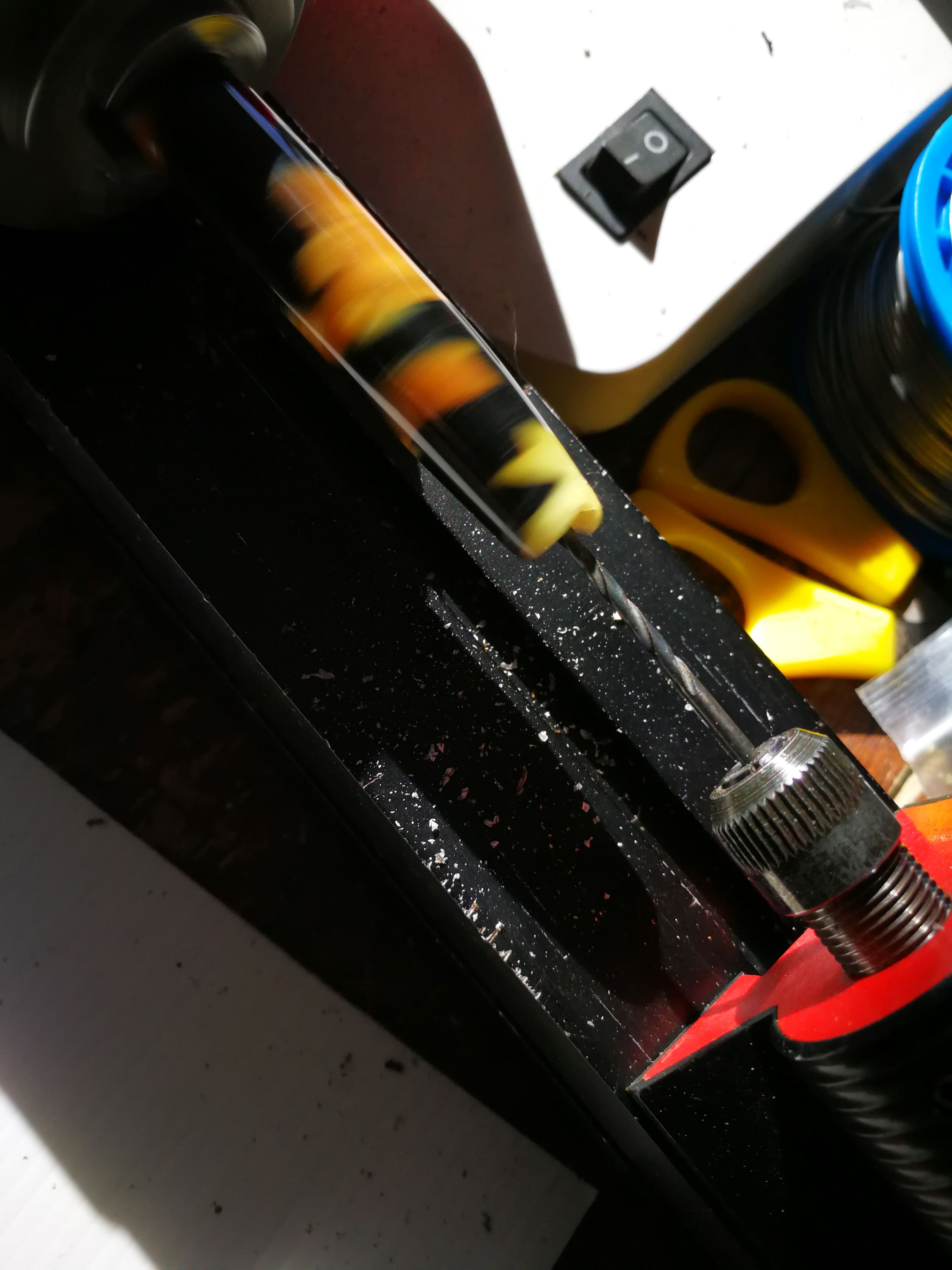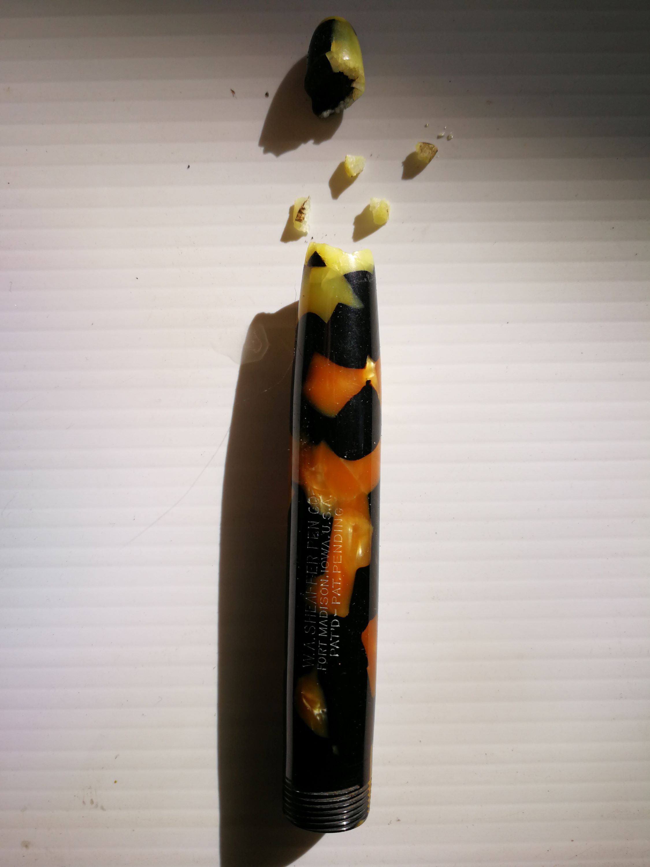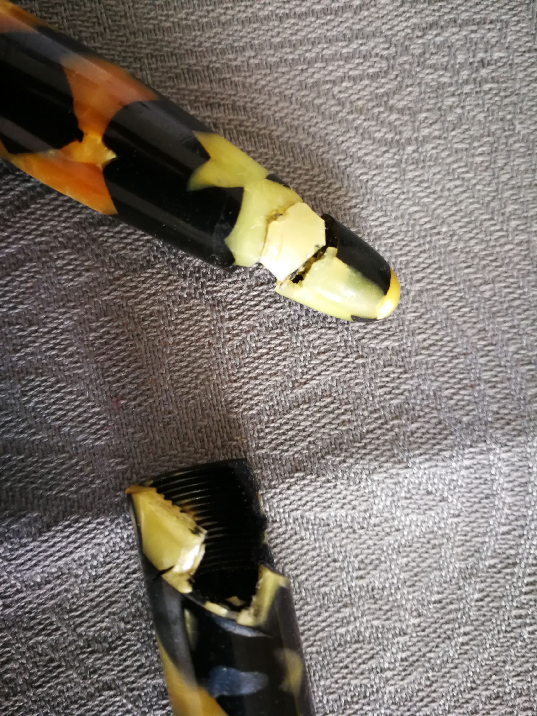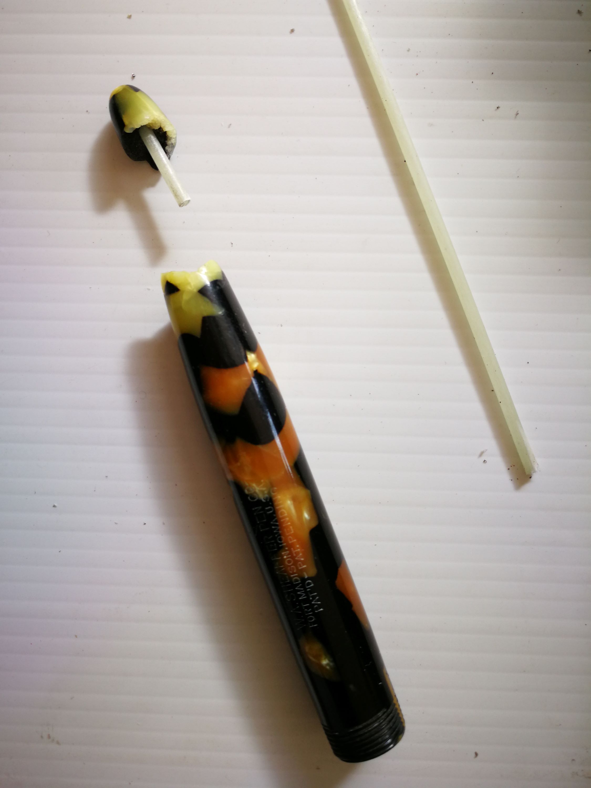 Anche stavolta non si è smentito e mi ha affidato una Sheaffer Balance Black & Pearl che il cancro della cristallizzazione ha ridotto come potete vedere nella seguente foto. Inutilmente ieri abbiamo cercato per il penshow milanese un rottame di quel colore dal quale prelevare e trapiantare una parte, così decido di sperimentare una via alternativa. Decido di posizionare il moncone finale nella sua posizione, praticando nel suddetto e nella parte posteriore del corpo un foro da 2mm nel quale inserisco un bastoncino di fibra di vetro ricavato dalla stecca di un ombrello pieghevole, tagliato della lunghezza opportuna. Colgo l'opportunità per mettere alla prova il BONDIC, che grazie alla possibilità di solidificare quasi istantaneamente con l'esposizione ai raggi UV si rileva particolarmente indicato ed utile.