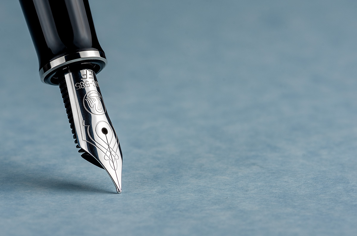 sul pennino in oro 14 carati interamente rodiato, sono incisi il classico decoro pelikan, il logo, i carati dell'oro e la misura del pennino.