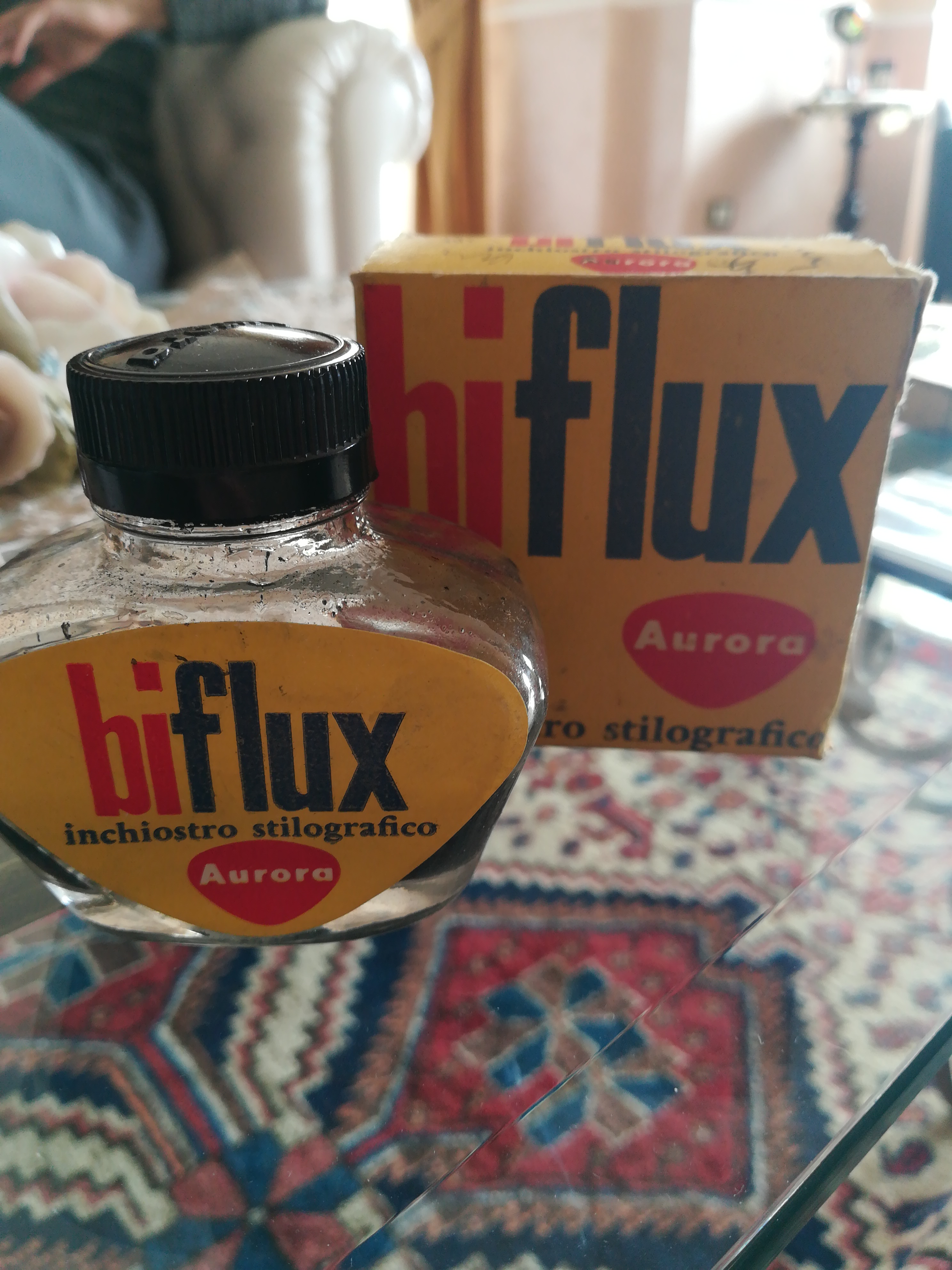 Questo è lo storico blu Aurora (più o meno equivalente al loro attuale blu), era in produzione negli anni '50/'60, sia in boccette che in cartucce (quelle che montavano le Duocart). Mi pare si chiamasse così proprio per la maggiore "fluidità" (paragonata agli inchiostri di allora, ovviamente, che erano più densi di quelli attuali: poi non saprei quanto ci fosse di vero e quanto di commerciale).