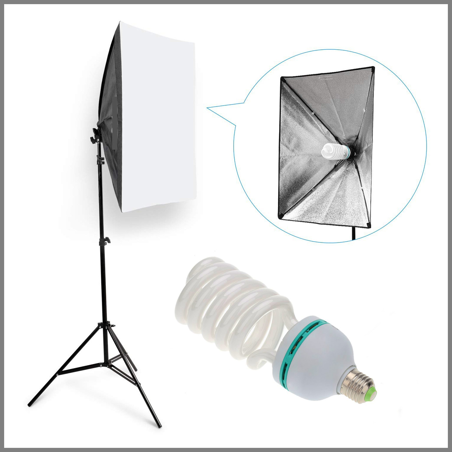 La luce è principale è costituita da un softbox che ha un diametro di 80 cm, la batteria di pannelli è costituita da 4 pezzi, il più grande ha le dimensioni di un foglio A4, uno medio che ha le dimensioni di un foglio A5, uno piccolo quadrato 12x12 cm, e uno rettangolare 30x10 cm.