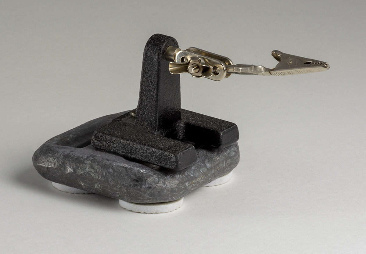 Il piccolo attrezzo, chiamato terza mano, serve da sostegno, ha il difetto di avere una base molto leggera, l'ho resa più stabile con un peso da 1 kg.