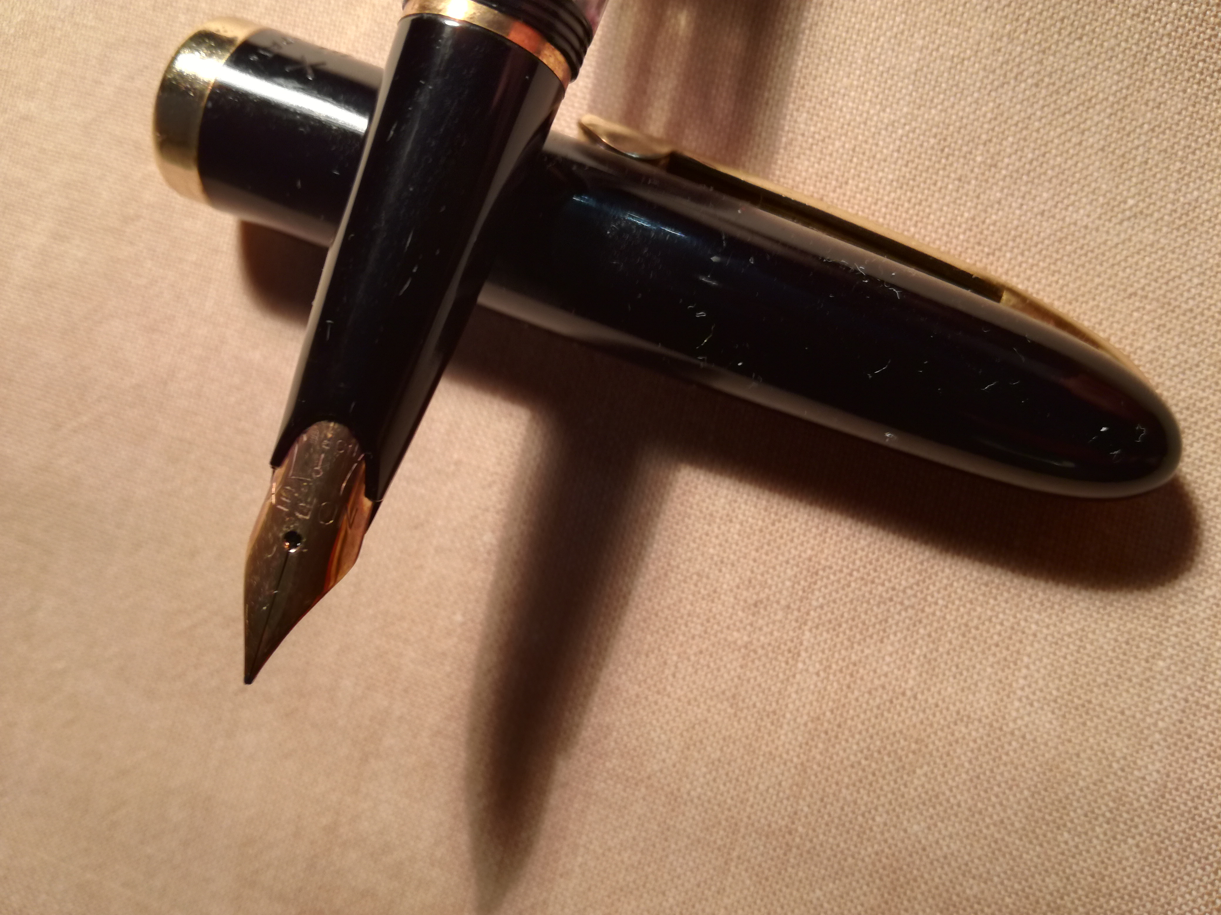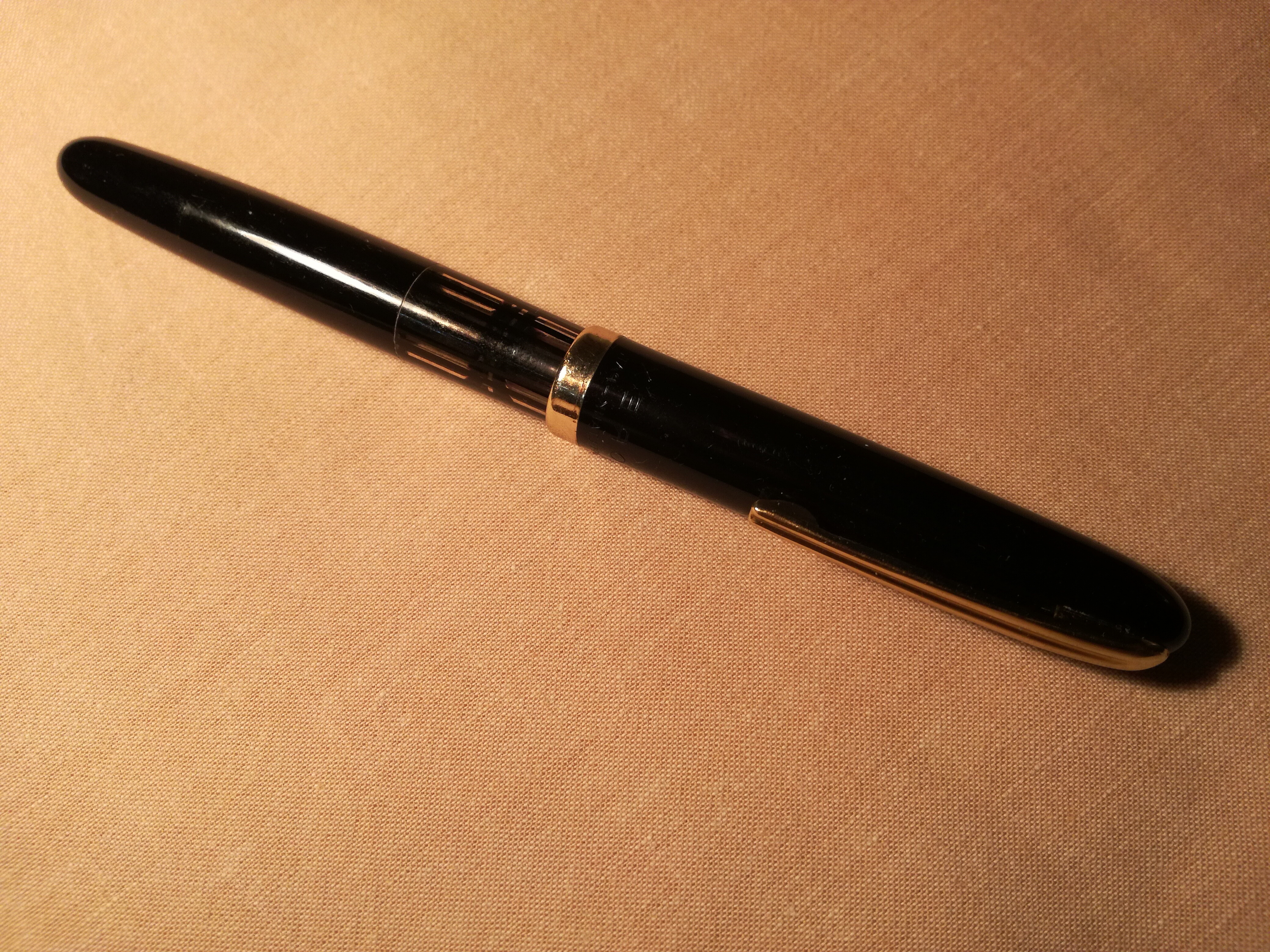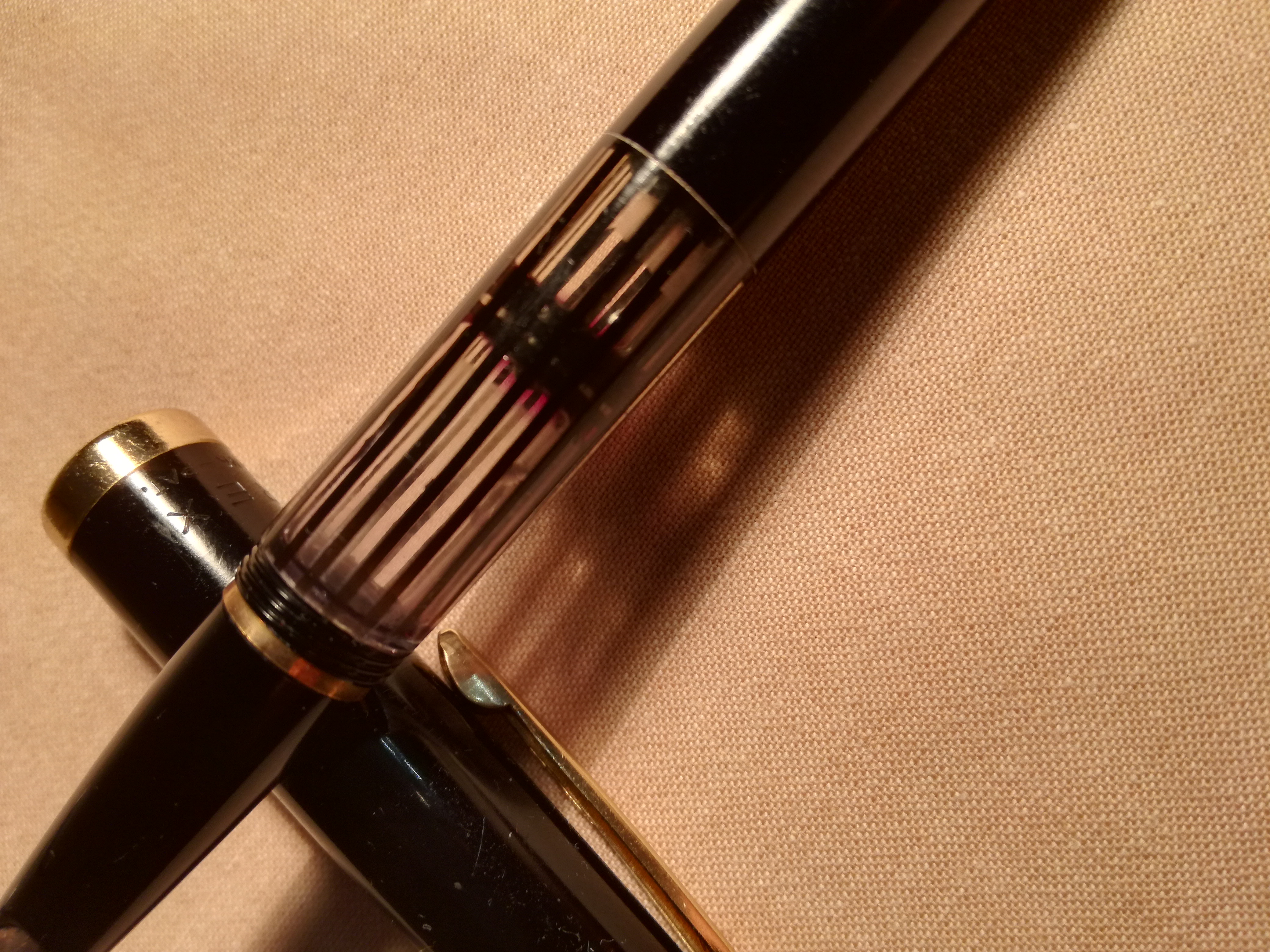È il modello 528 (così è inciso sul fondello). Carica a pistone con il comando coperto appunto da un fondello, in puro stile tedesco (ad esempio la Kaweco). Il pennino è un semi-hooded, non ho ancora capito se oro o placcato. Sul cappuccio è inciso "doppeltank (pat)"