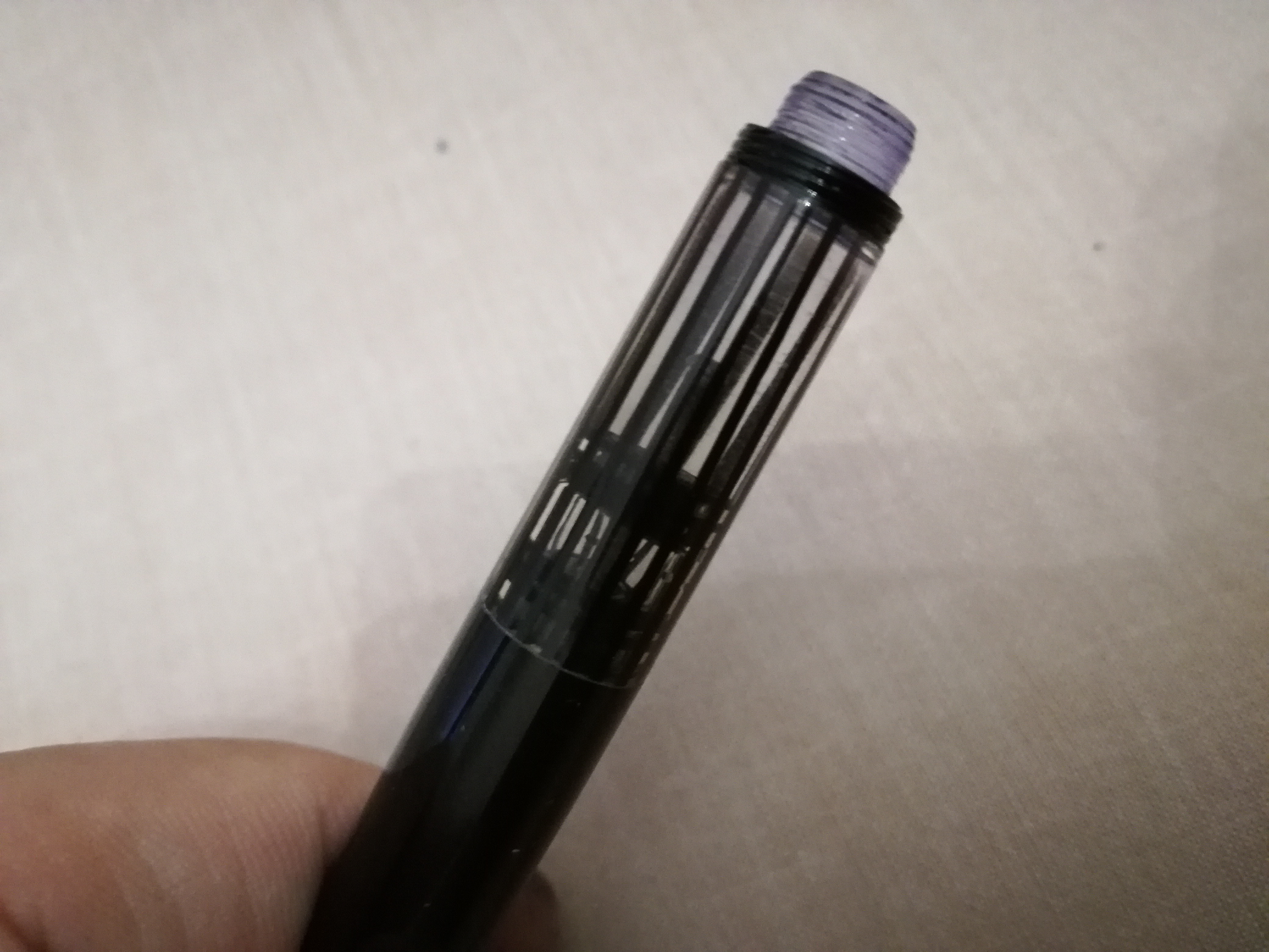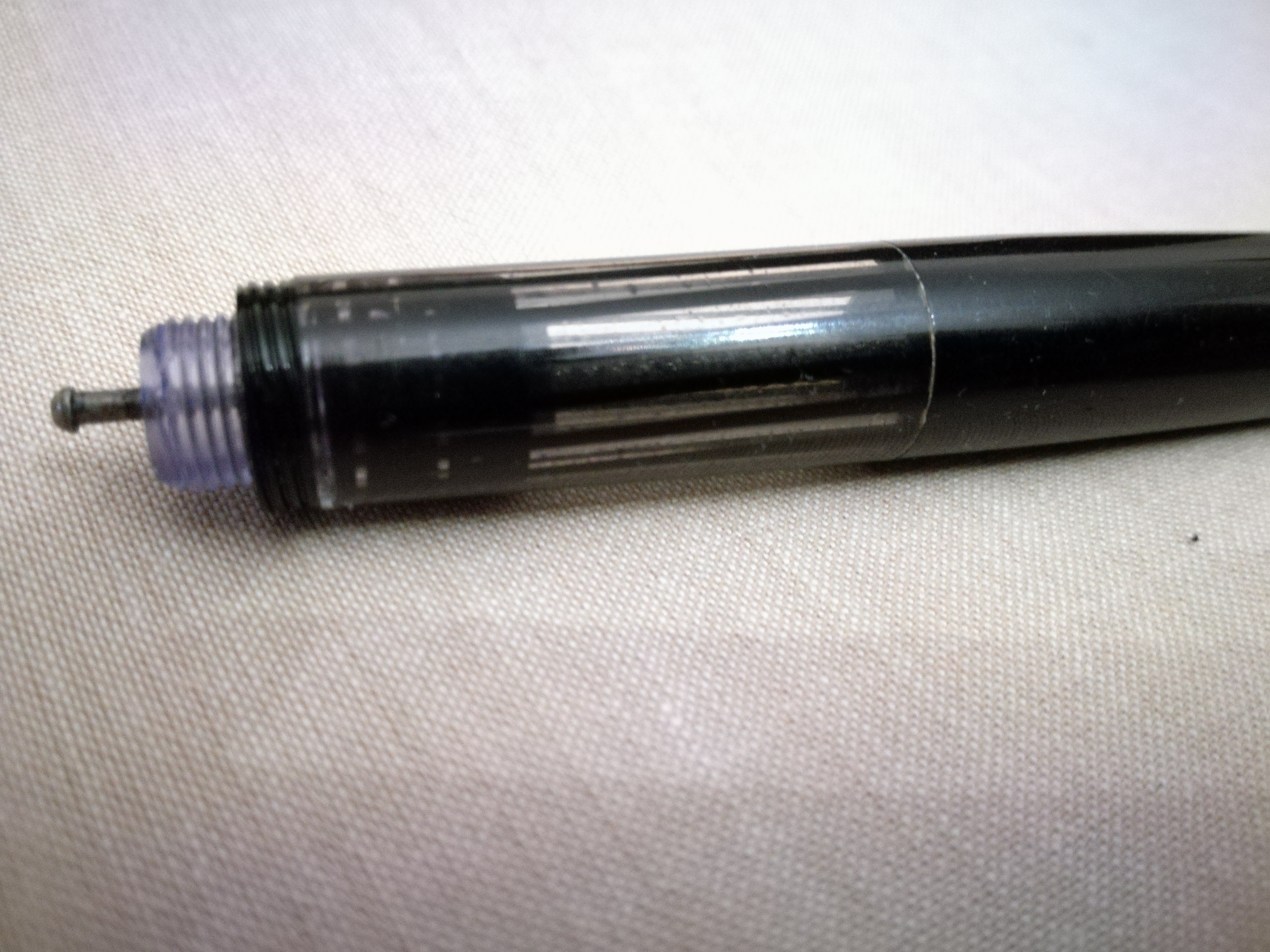 Se si svita la sezione (che sembra fatta apposta per essere svitata...) e si aziona il.pistone, l'alberino scende ben oltre il suo limite, ma resta ben saldo al suo posto. Tutte le guarnizioni sono "impaccate" al fondo del fusto. Se a questo punto si immerge il fusto (senza sezione) e si ricarica, l'inchiostro fluisce per prima cosa oltre la guarnizione di fondo, che al contrario delle altre resta ferma in fondo con l'alberino che le scorre al centro. Quando la testa lievemente ingrossata dell'alberino impegna la guarnizione di fondo, la trascina e inizia a riempire la camera più "bassa". Io qui ho riempito con acqua. Alla fine, tutto lo spazio della finestra è in effetti pien, cosa che se si lascia la sezione non.avviene.