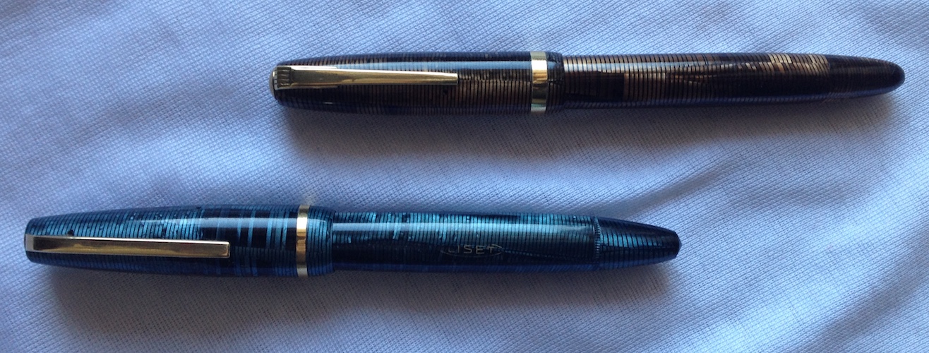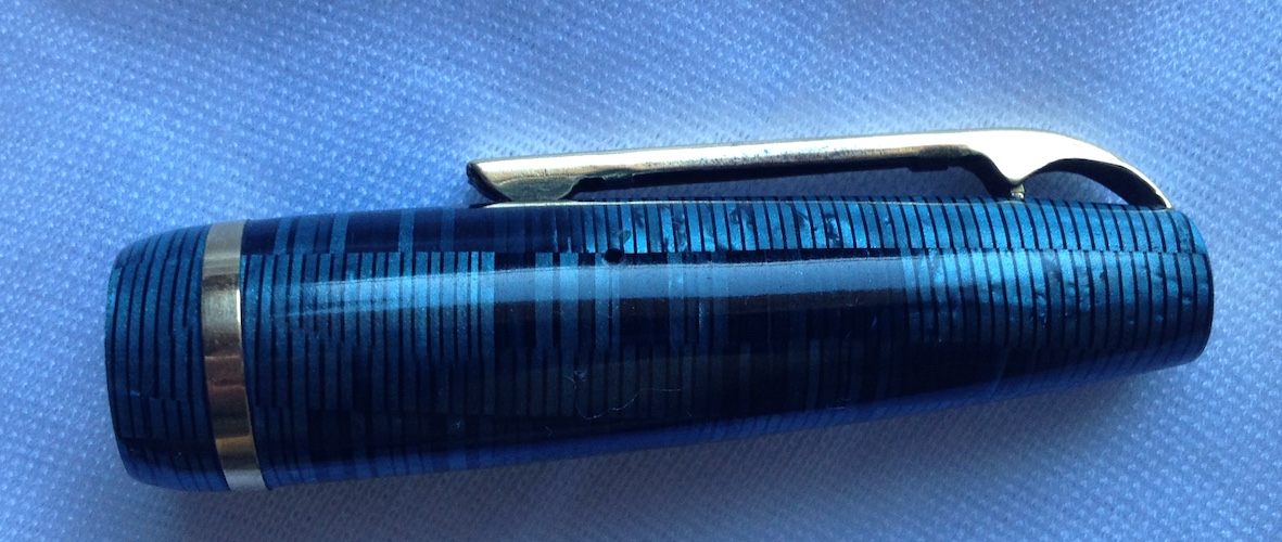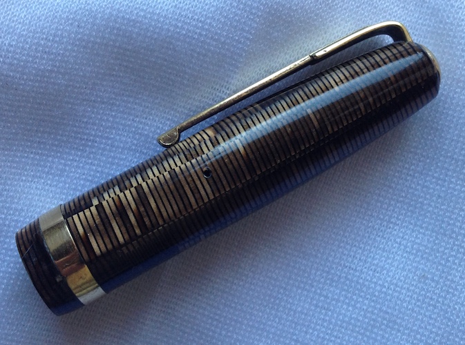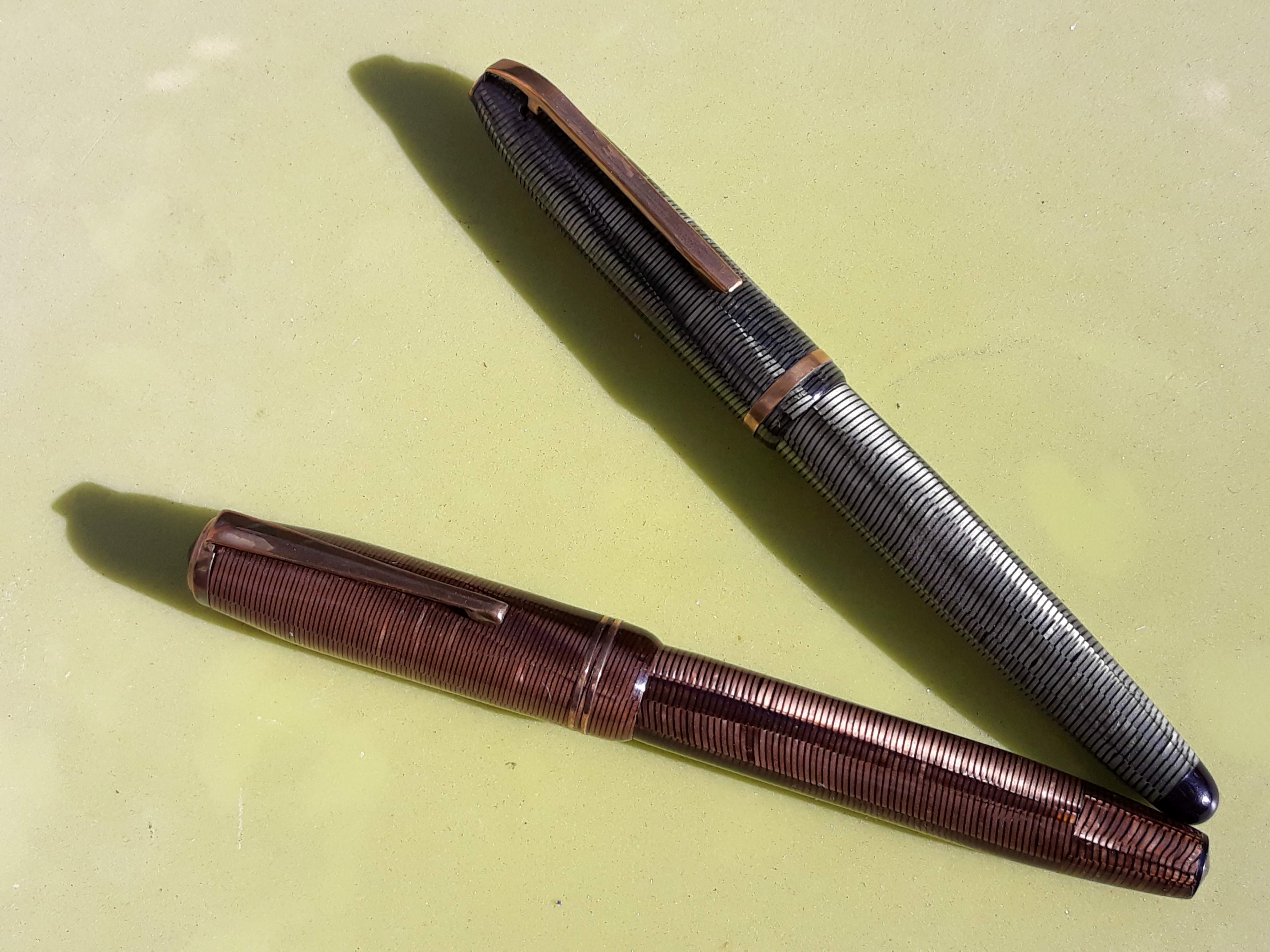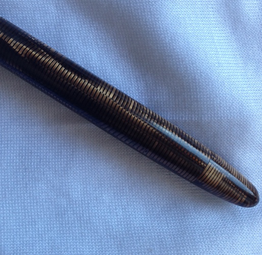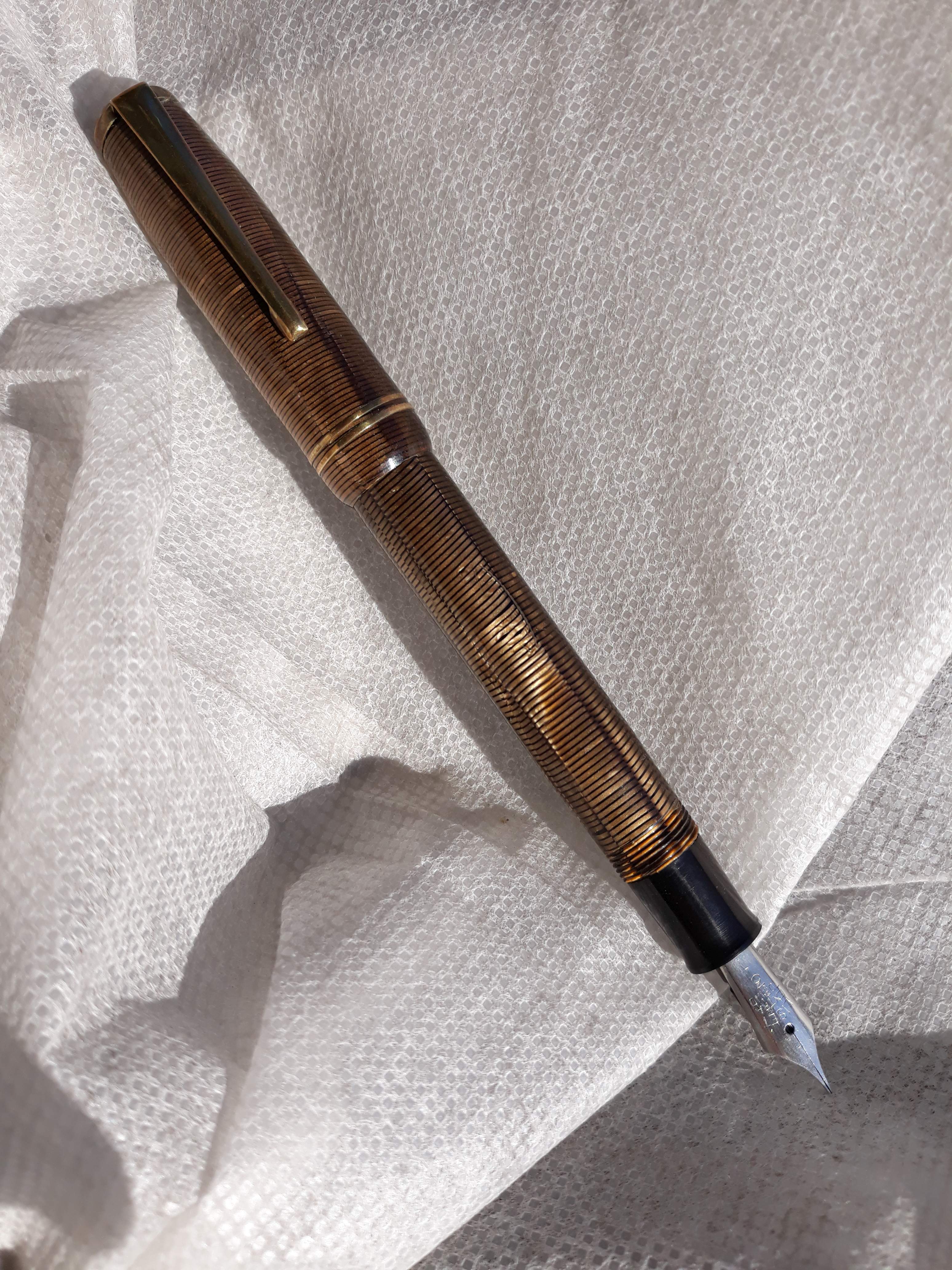 Permettetemi di aggiungere una 'sospetta cugina' di questa ultima anellata verde; in realtà sono tutte figlie e figliastre della classica Vacumatic se non la prima, la più famosa ad 'anellarsi'. Il motivo sembra lo stesso ma in verticale è una Stilnova con il suo pennino in oro.