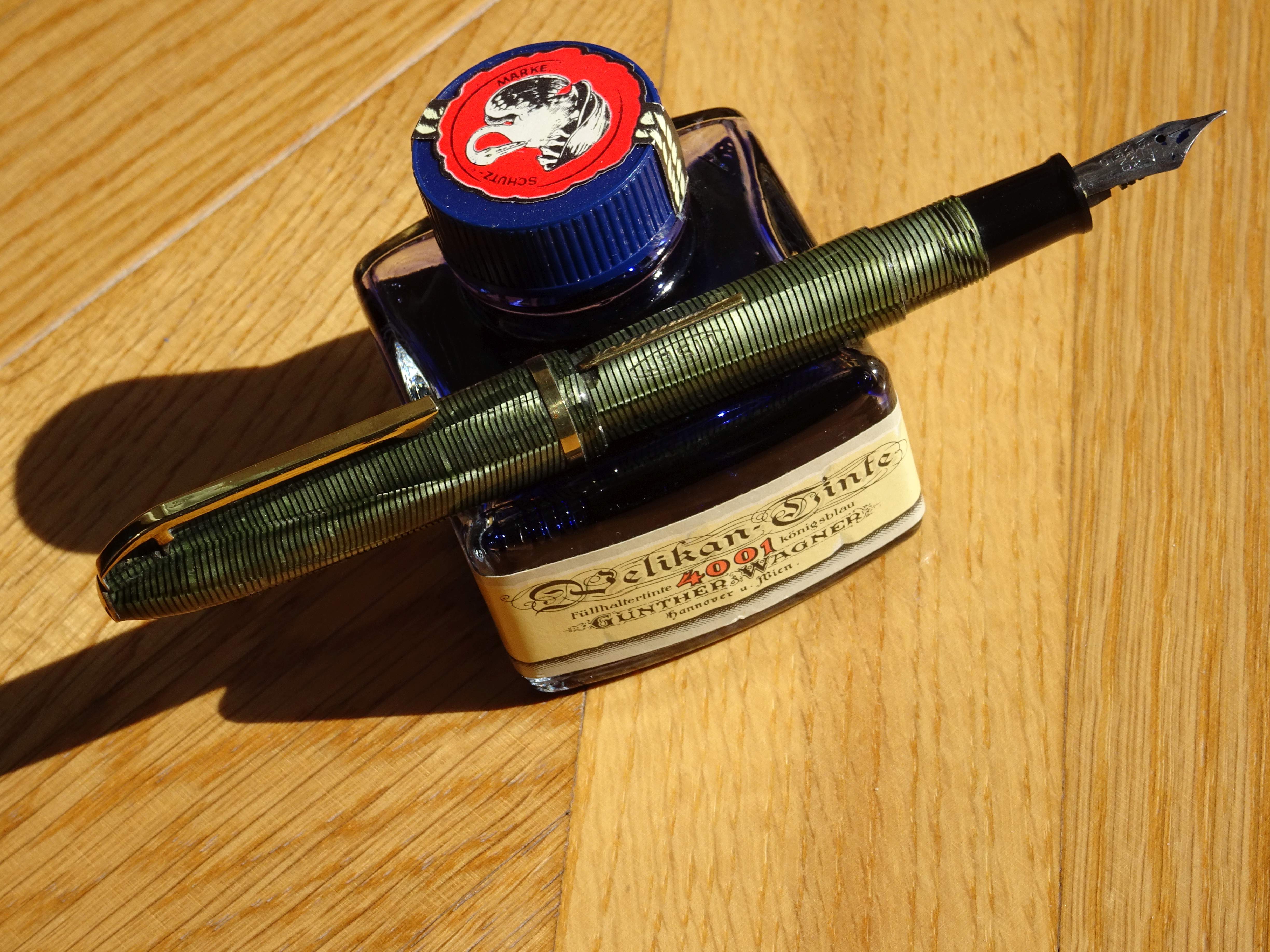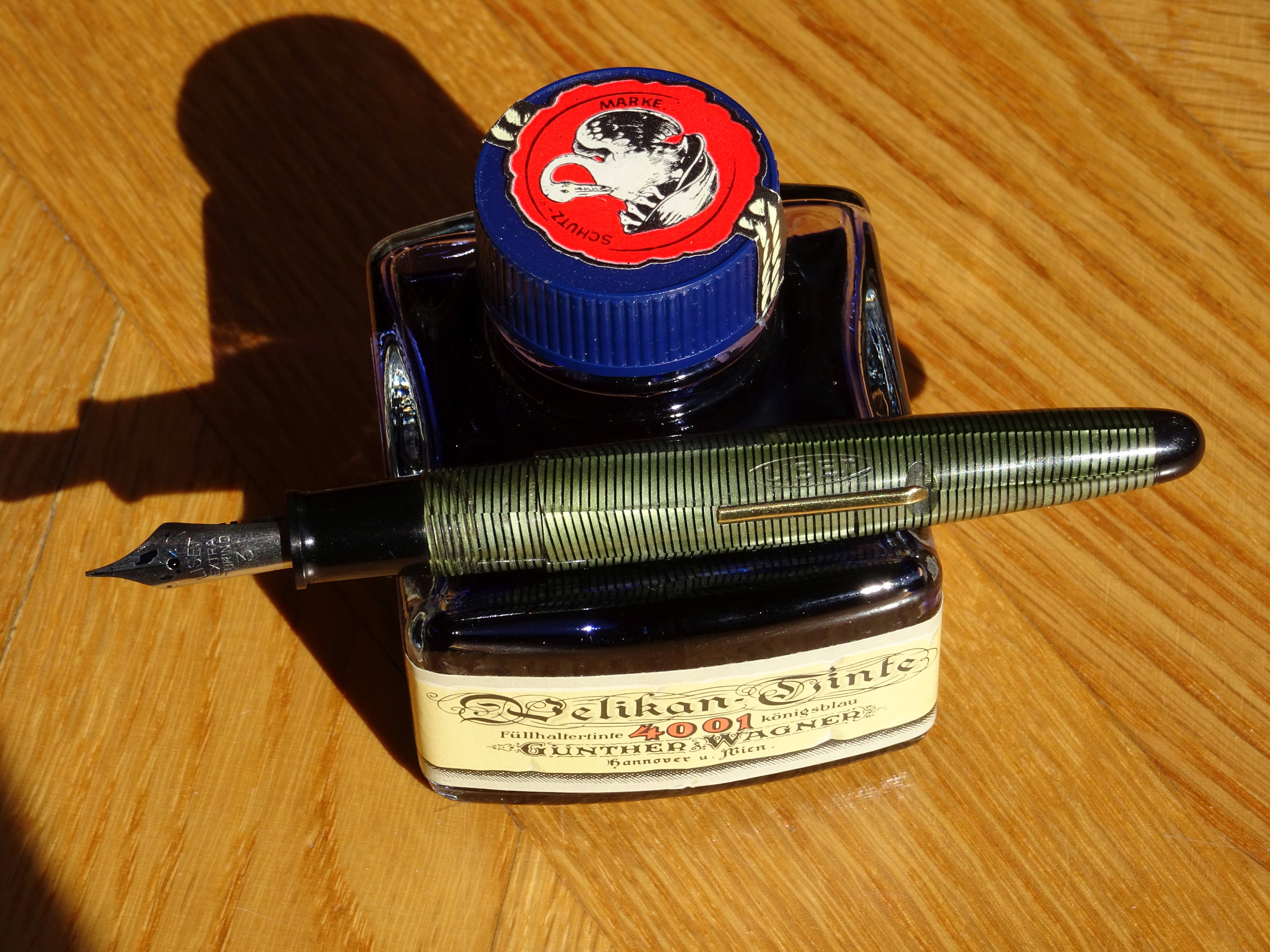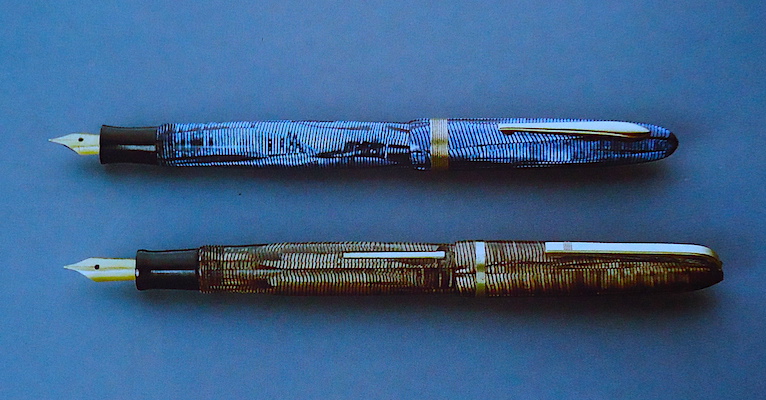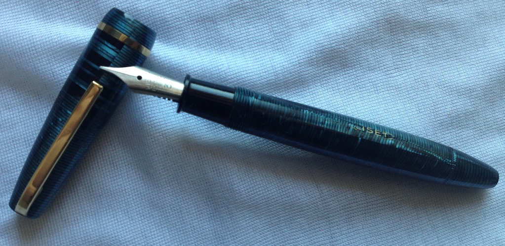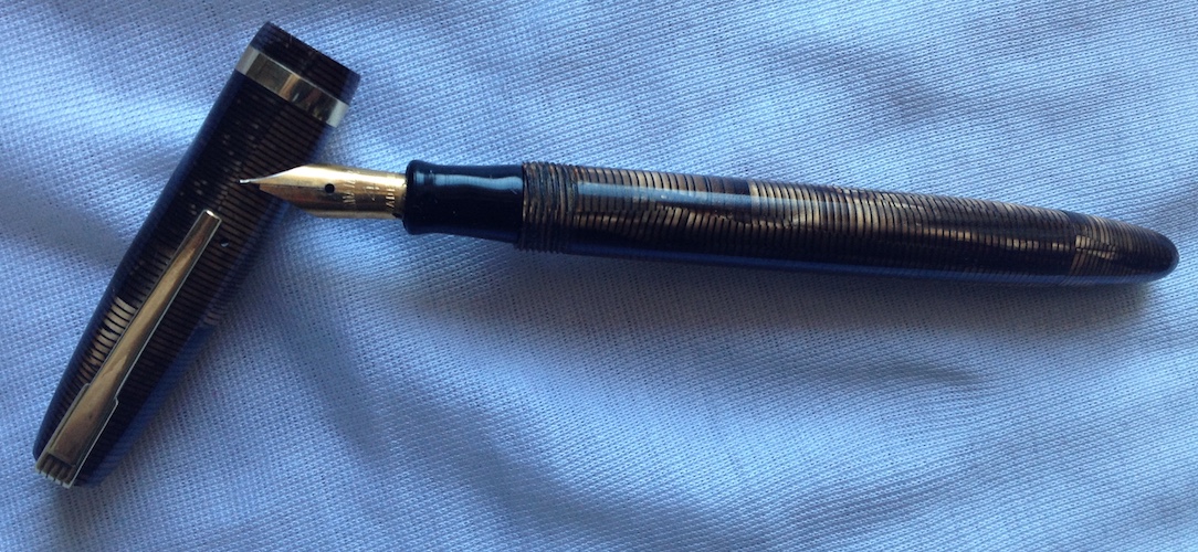 Permettetemi di aggiungere una 'sospetta cugina' di questa ultima anellata verde; in realtà sono tutte figlie e figliastre della classica Vacumatic se non la prima, la più famosa ad 'anellarsi'. Il motivo sembra lo stesso ma in verticale è una Stilnova con il suo pennino in oro.