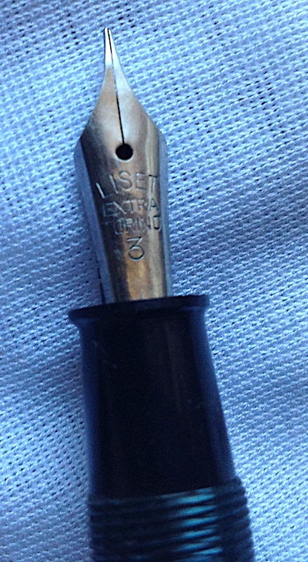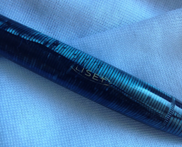 La Liset blu anellata, credo anni '50, è lunga 12,5 cm, il fusto ha una sezione di 12 mm e pesa 15 gr. Il pennino è un Liset Torino extra 3 (iridium?). E' in condizioni perfette di funzionamento. Il venditore è molto simpatico e competente.