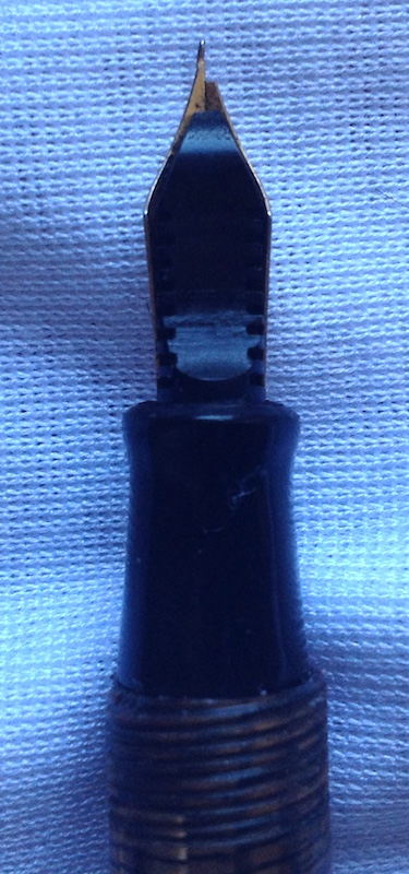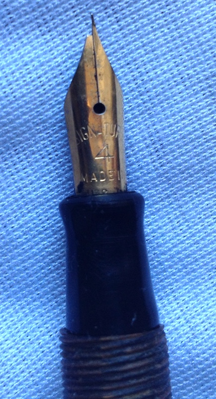 Quella marrone, la cui celluloide pare ricavata dallo stesso blocco anche se di colore diverso, è lunga 12,5 cm, ha una sezione di 11 mm e pesa 12 gr., ma la levetta ed il serbatoio sono mancanti. Il pennino, rotto, riporta la scritta Signature 4 Made in USA, a me ignota, ma potrebbe essere stato anche un rimpiazzo. Va ancora restaurata.