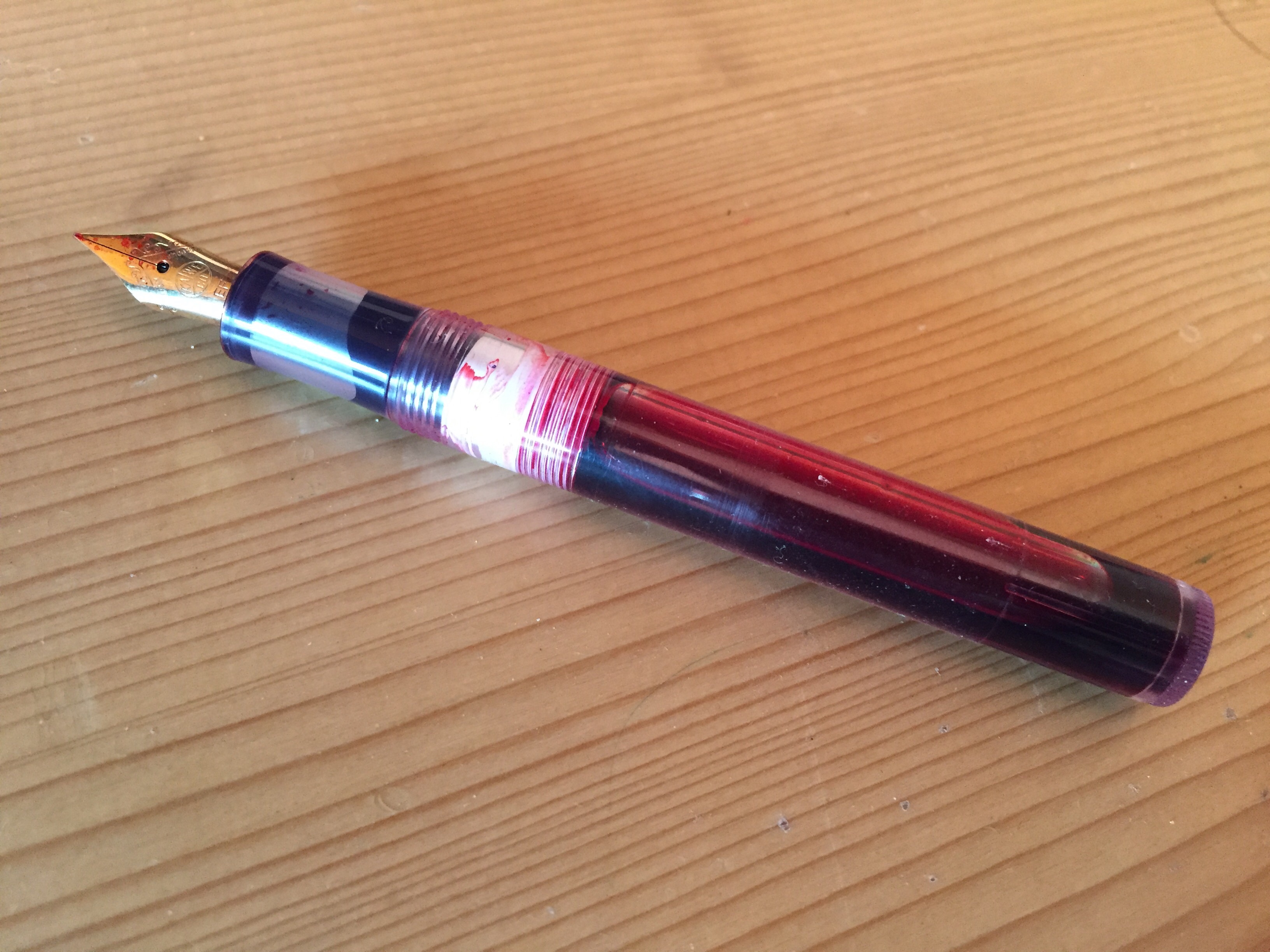prevista per l'uso come eyedropper (tanto da esserci il contagocce nella confezione): caricata con Diamine Chocolate Brown (fusto davvero capiente), all'inizio perfetta, arrivato ad 1/3 del volume, flusso esageratamente abbondante ma soprattutto leggera fuoriscita di inchiostro nel cappuccio ... idea abbandonata!