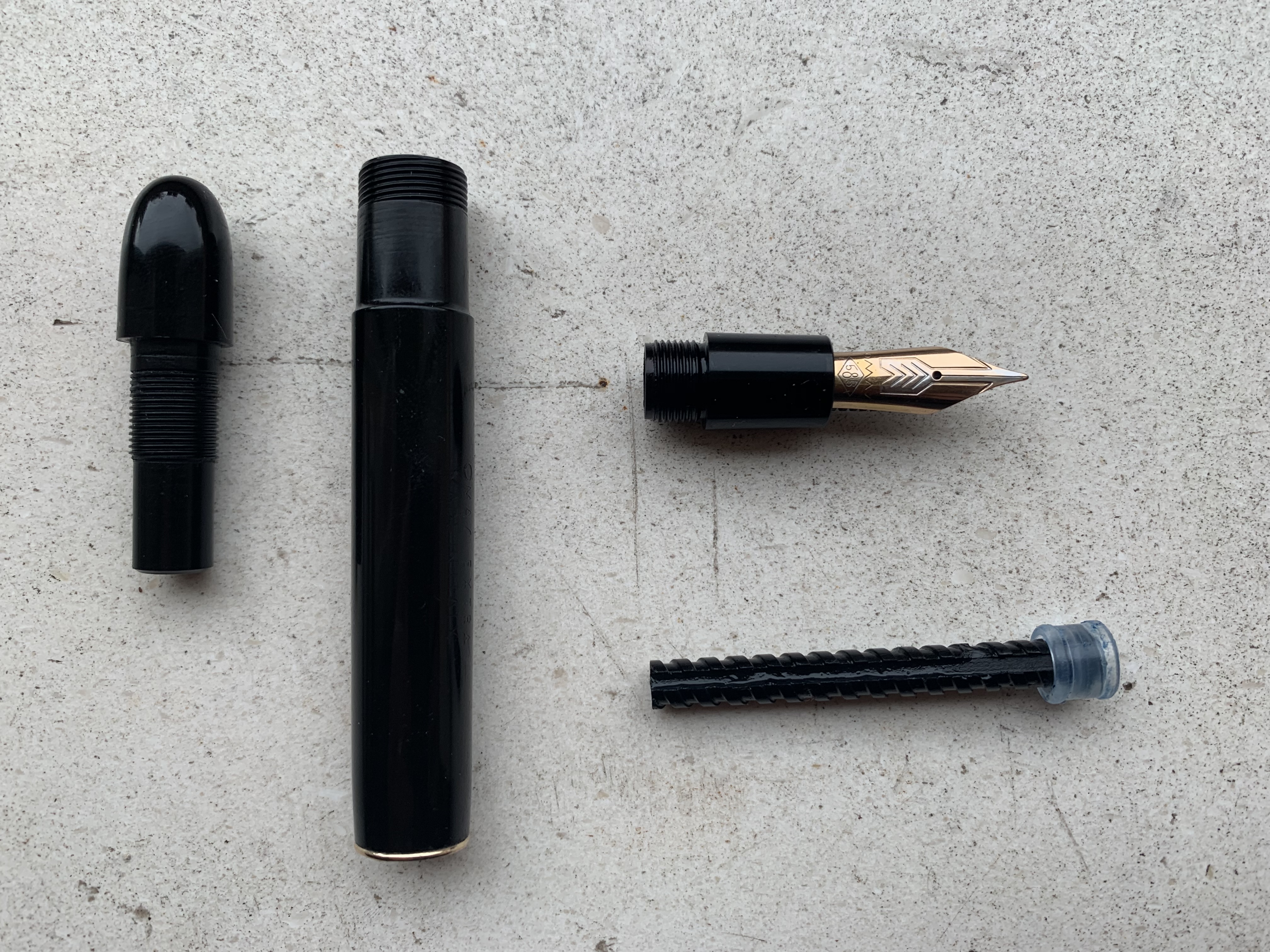 Per smontare la penna basta togliere la sezione e svitare il fondello fino a rimuoverlo. Poi una volta pulita e ingrassata, inserisci il pistone facendo andare la scalanatura dello stesso nella spinetta senza farlo scendere al punto di essere agganciato dal fondello. Riavviata il fondello lasciando un po' di filetto fuori e poi spingi il pistone in modo da farlo agganciare dal fondello. Io personalmente vado a tentativi per regolare la corsa, non ci ho mai perso più di qualche minuto in questo modo a riassemblare il tutto.