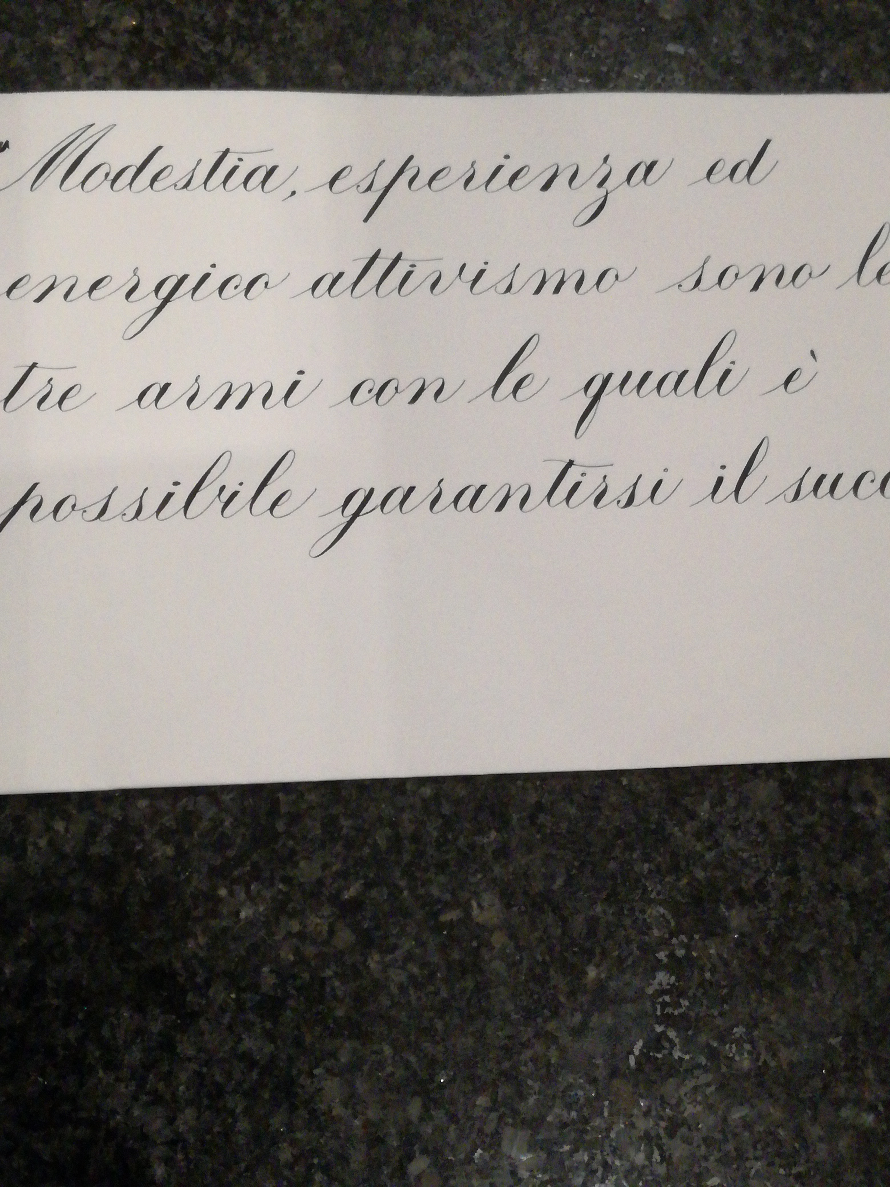 Dopo i mesi di corso di corsivo inglese ed i vari acquisti e tentativi fatti, ammesso quanto la mia esperienza sia limitata e parziale, ho trovato un'accoppiata vincente: carta Rhodia e inchiostro ferrogalligo (fatto a mano con ricetta collaudata negli anni).