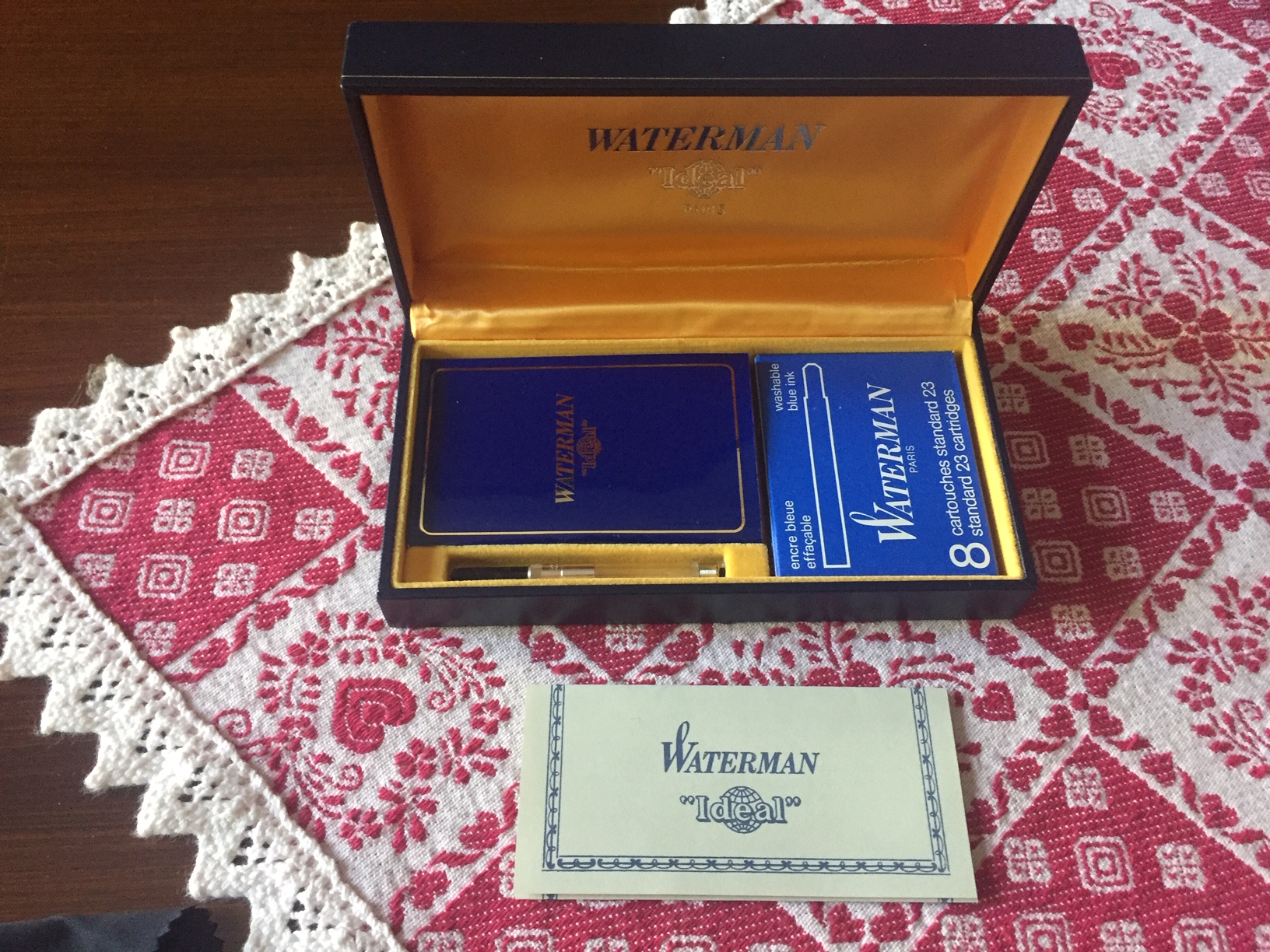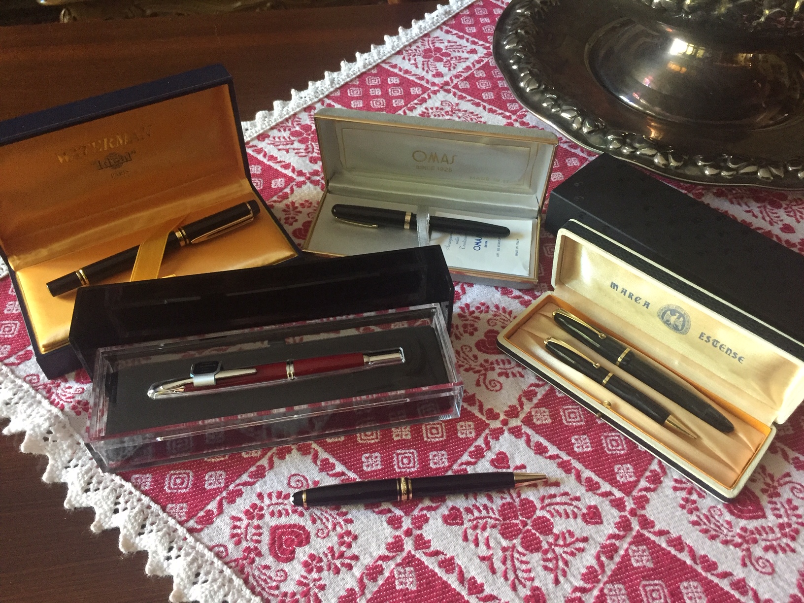 Ed ecco i nuovi arrivi del mese di settembre: stilografica Pilot Capless Red, pennino F in oro 18k, nuova mai inchiostrata con scatola contro scatola e garanzia Pilot Italia; Omas Extra 620 in ottimo stato, funzionante, pennino dorato Omas M, con scatola; penna biro Montblanc in ottimo stato, funzionante; stilografica Waterman Man 100, nuova, con corredo completo; parure stilo e matita meccanica Estense, funzionati (da sostituire il serbatoio inchiostro della stilo), pennino in acciaio misura F, con scatola in ottimo stato. L'Omas non sembra presentare problemi di restringimento della resina con cui è fabbricata, la stilo e la matita meccanica marca Estense sono in celluloide variegata nera, dalle foto fatte, purtroppo tale effetto non risulta evidente, e non hanno nulla da invidiare a penna più blasonate dello stesso periodo, peccato per il pennino non in oro.