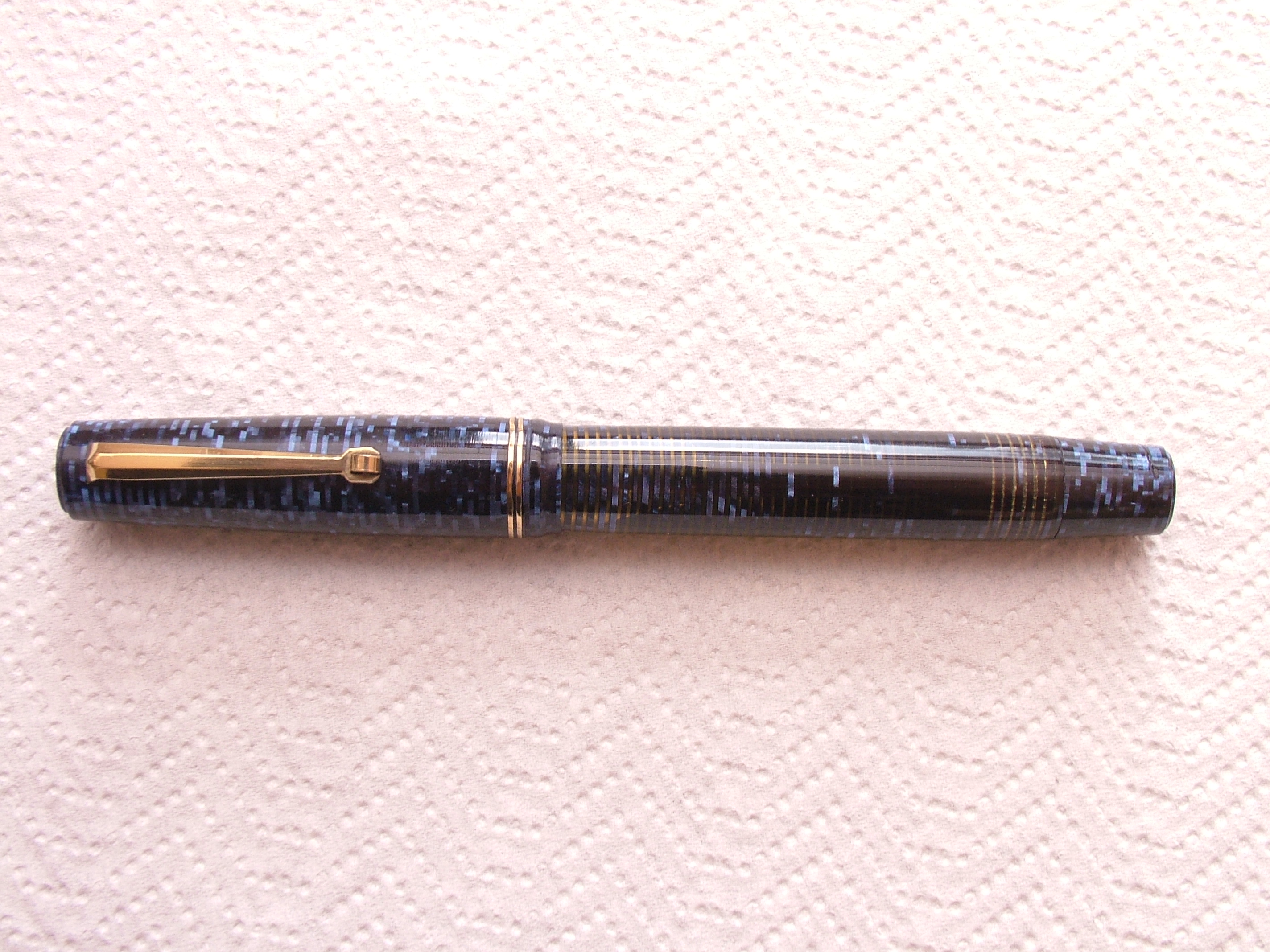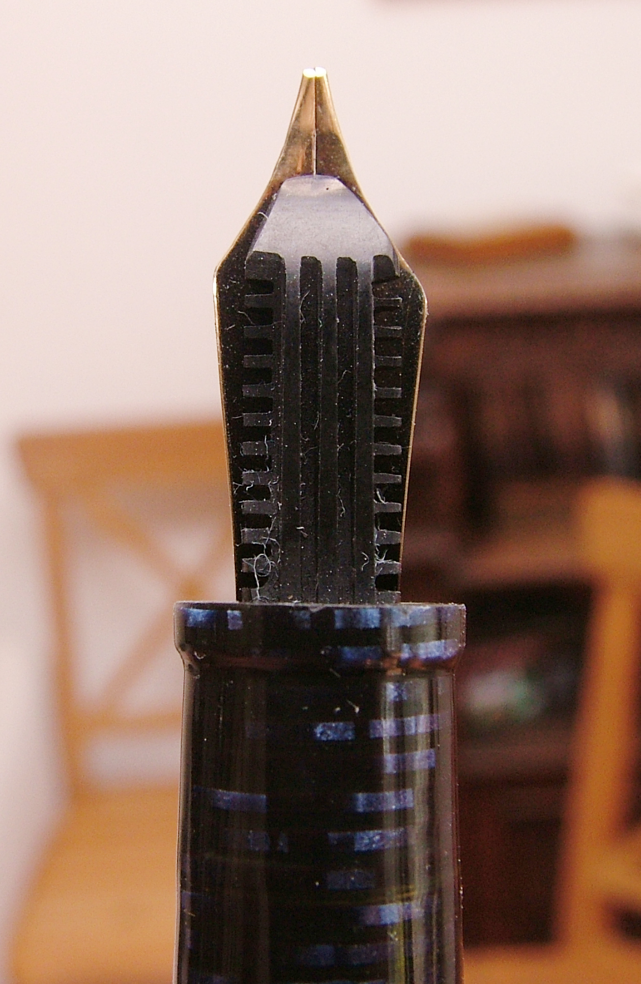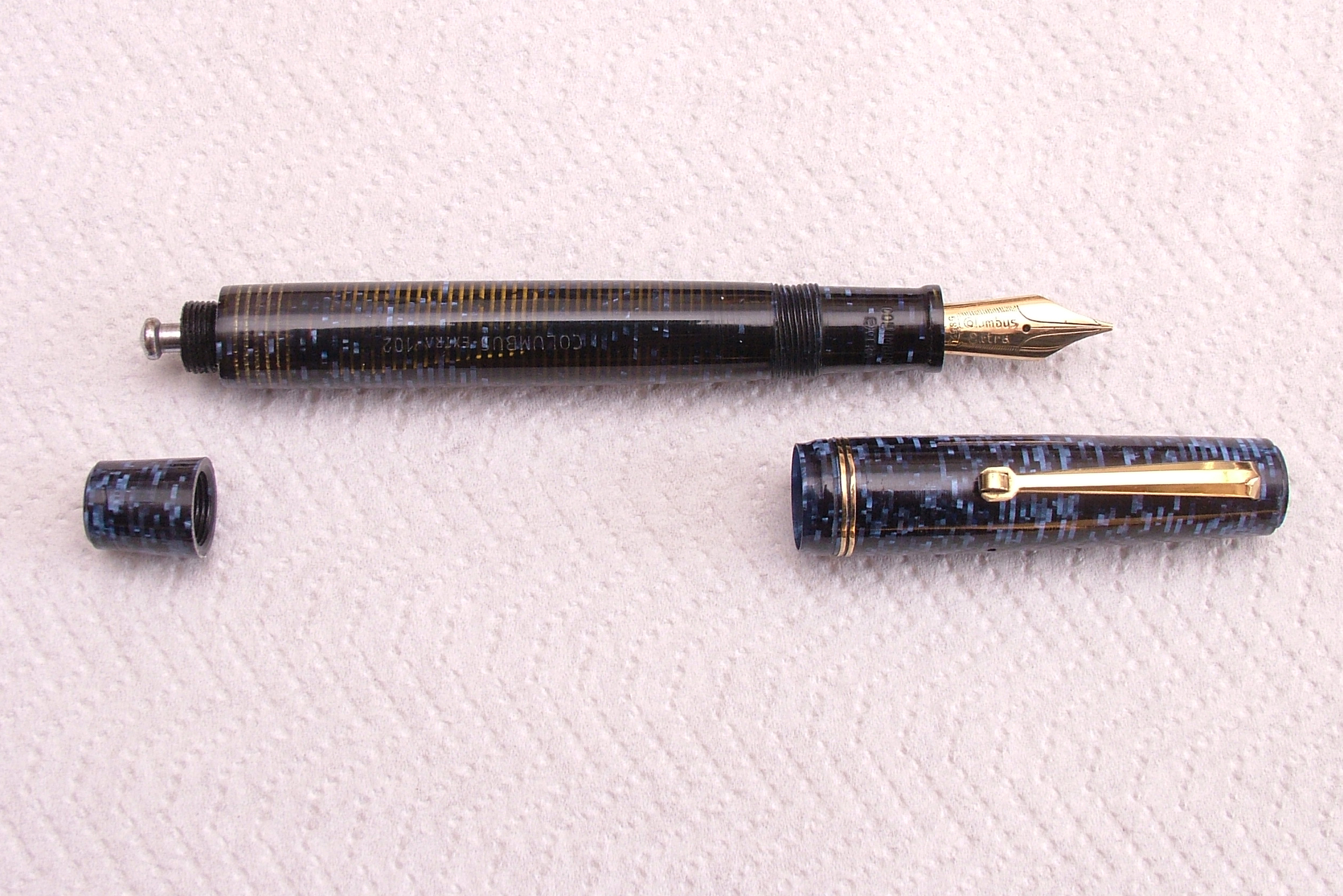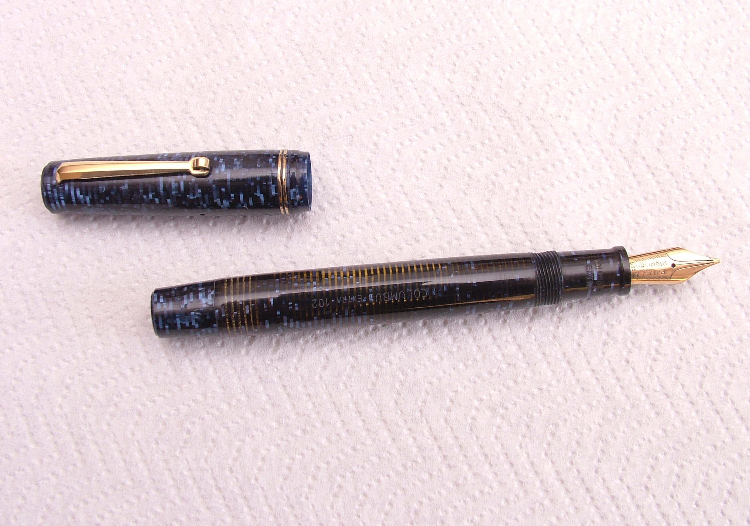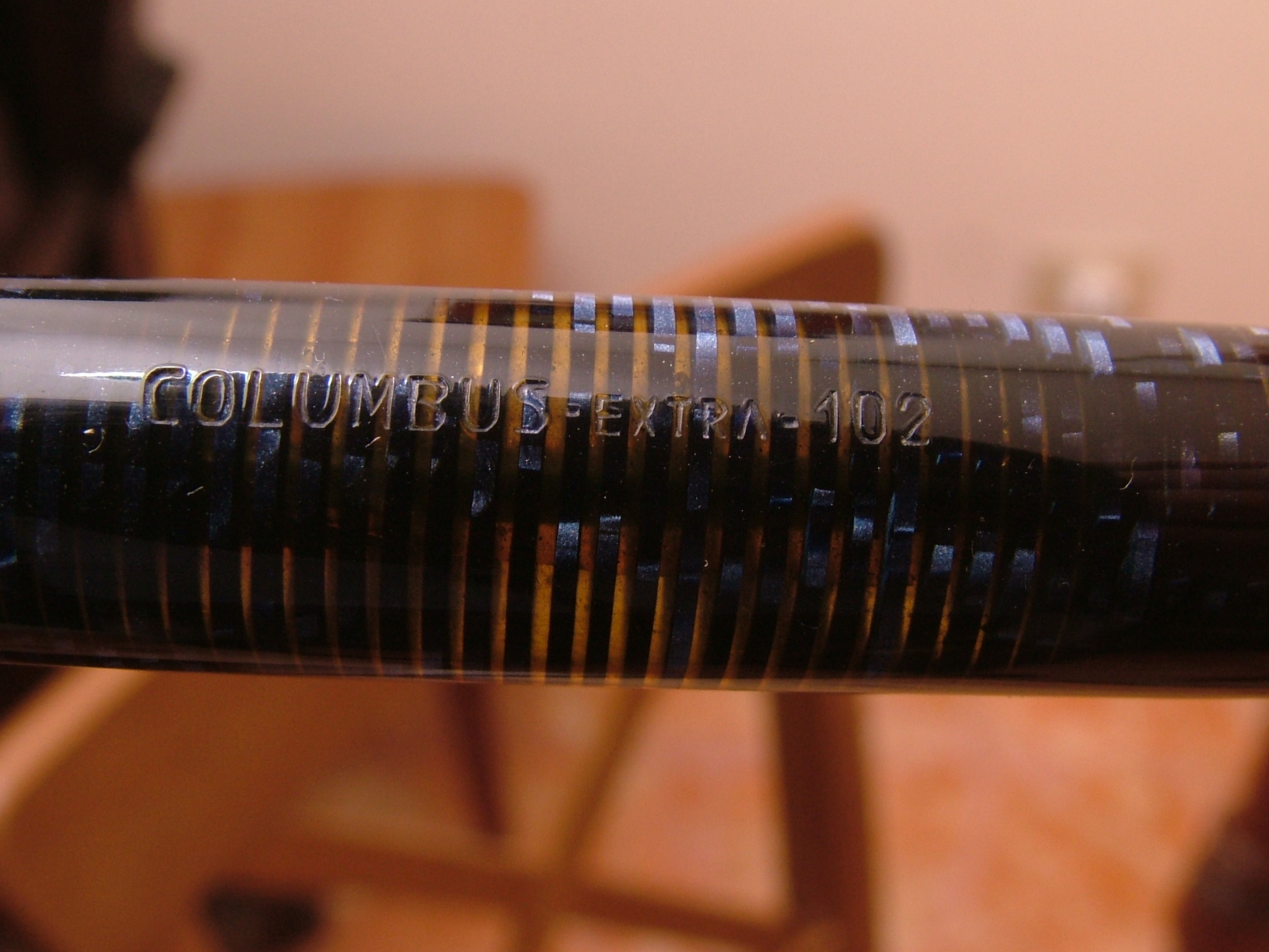 una Columbus Extra 102 anellata blu, trasparente con carica a siringa rovesciata.