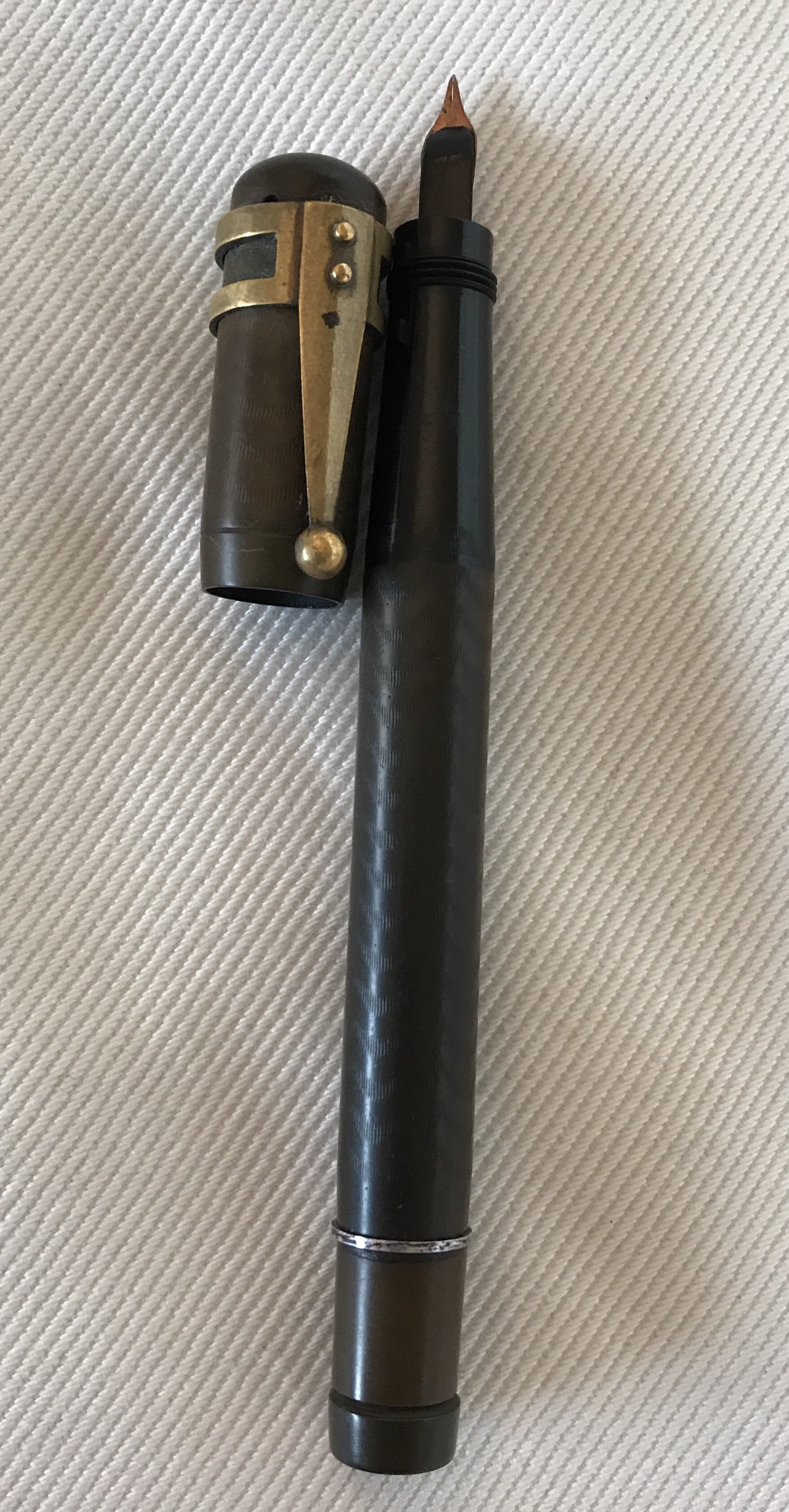 La sezione verso il fondo era stata malamente verniciata in nero, che ho grattato, facendo venire fuori uno strato di lega di metallo ricoperto di un altro metallo tipo rame, molto sottile, in parte scrostato. Ho esaminato bene la penna ma non c'è traccia di terminale smontabile come nelle altre safety pen, in quanto il punto dove ci dovrebbe essere la giunzione tra corpo penna e parte terminale è coperto da questa banda metallica. Ho provato a scalzare la banda metallica e ho notato che viene via a strisce, come se fosse un filo arrotolato... strano.