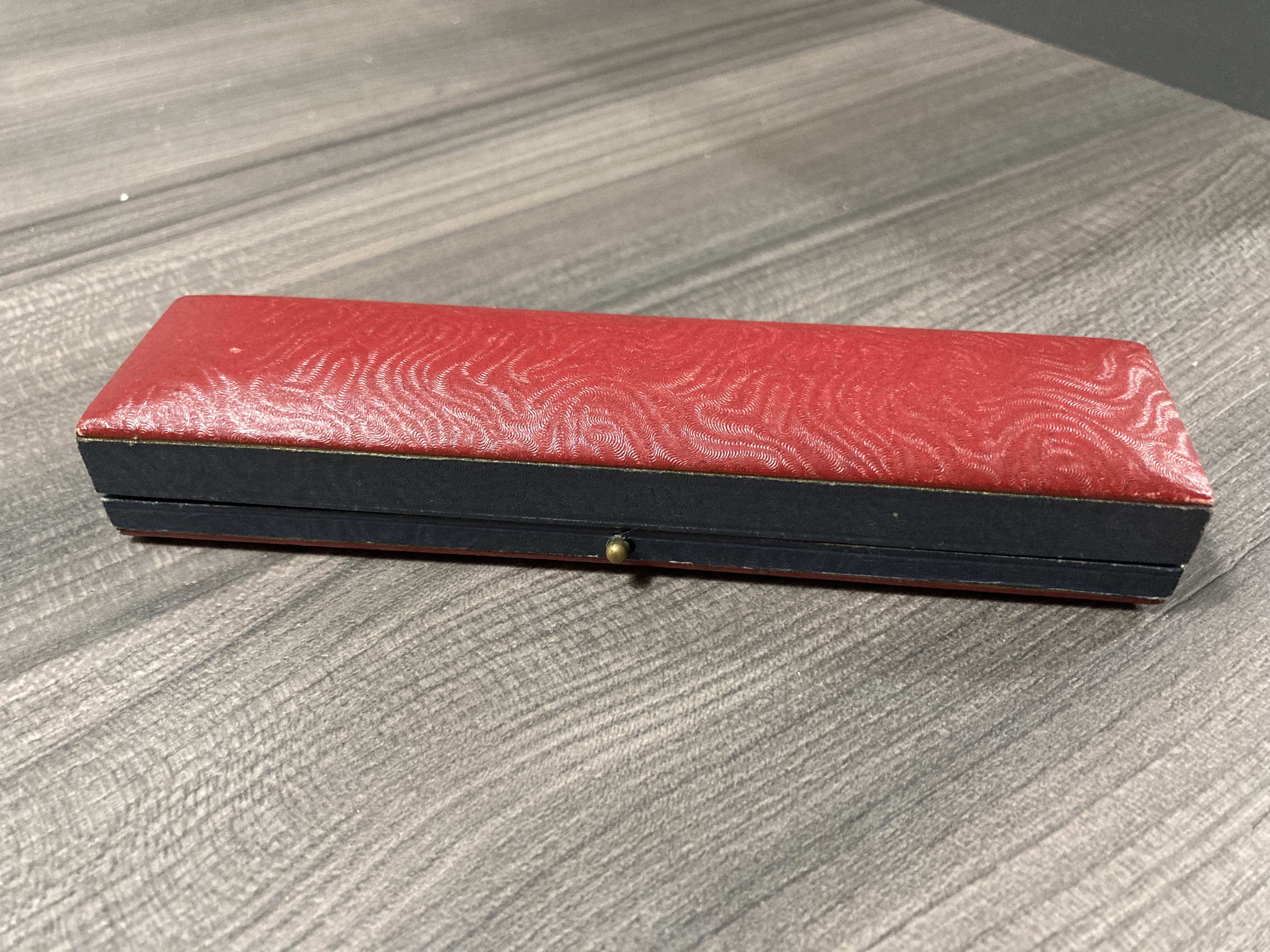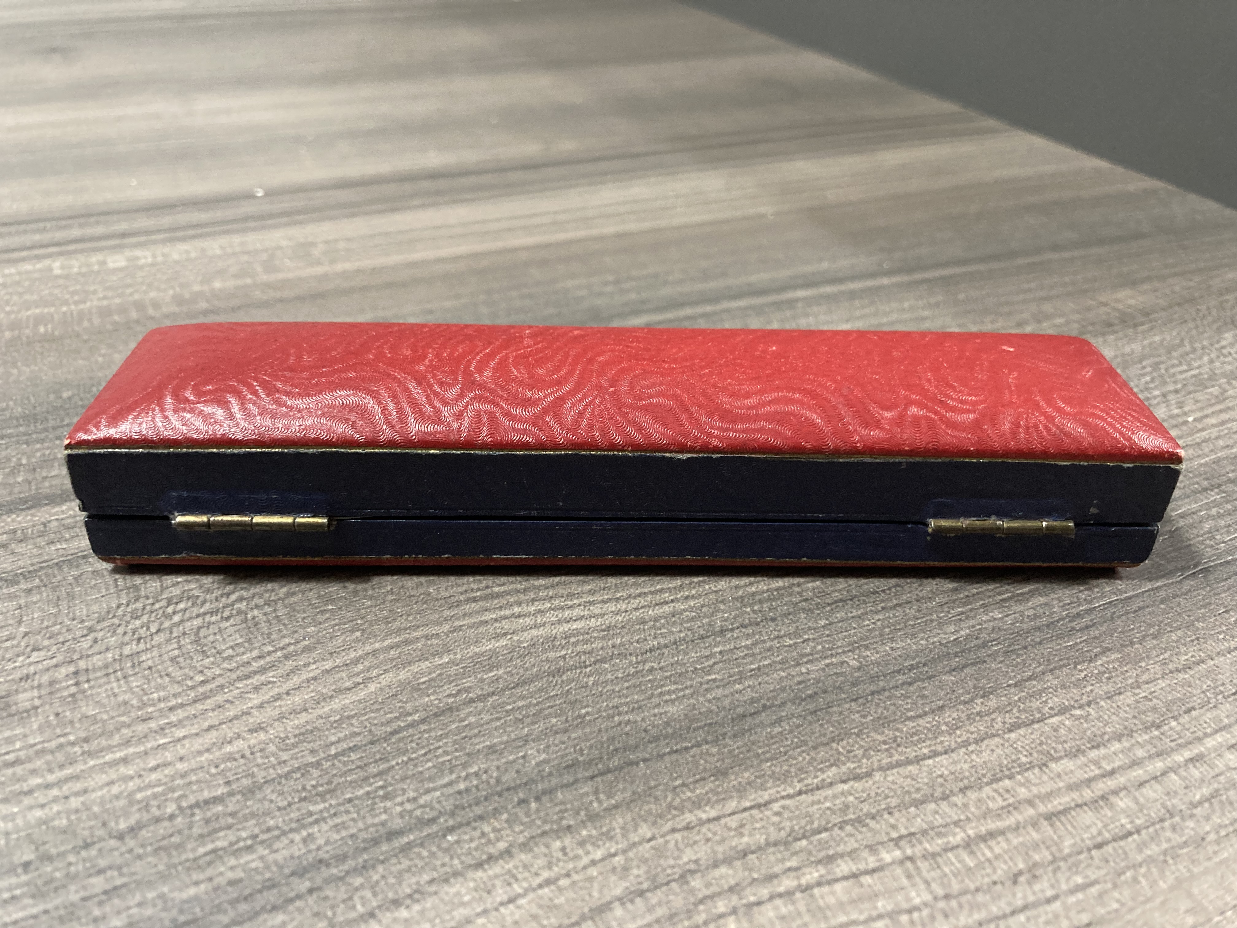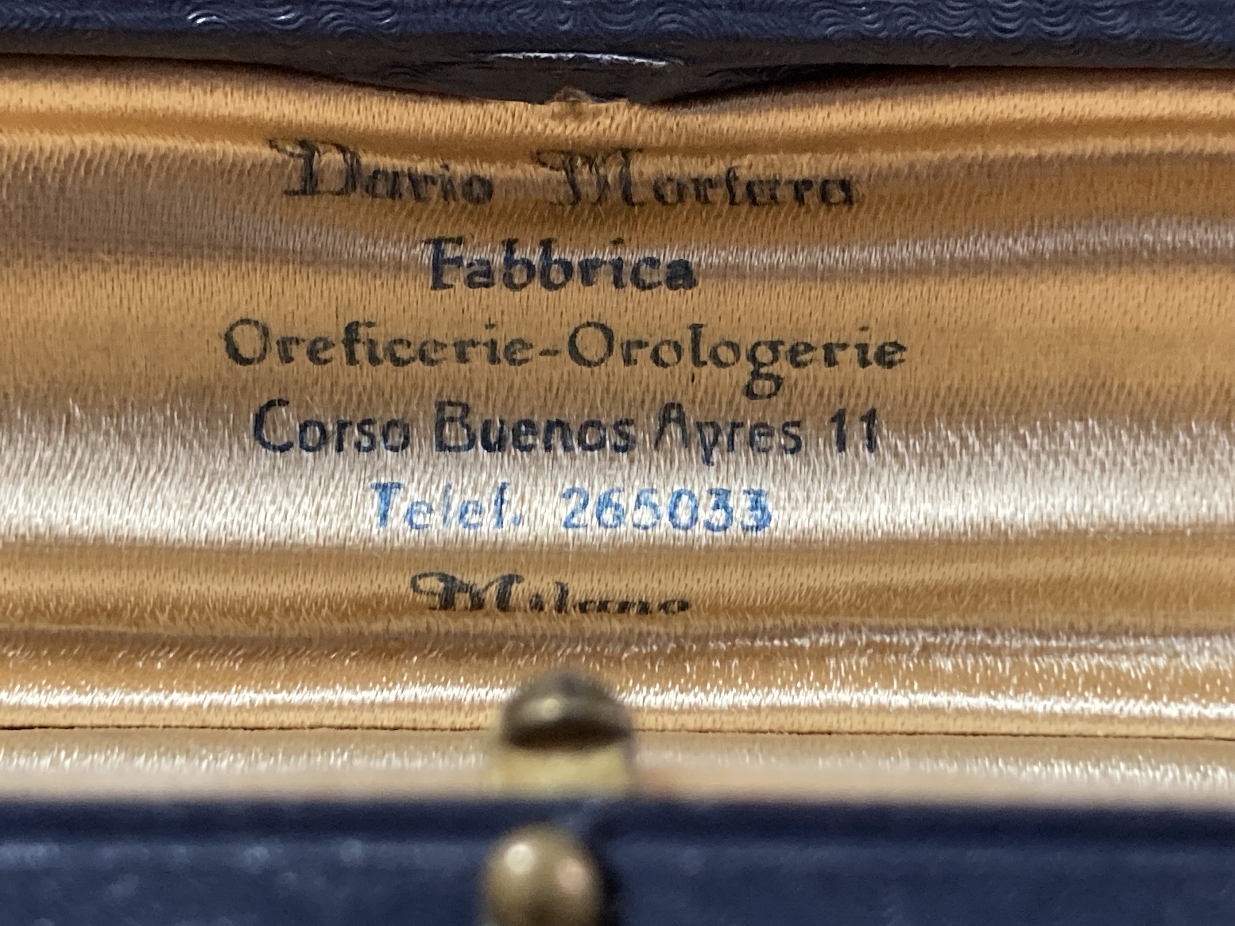 La scatolina non rientra nella casistica sin qui conosciuta, ma potrebbe comunque far parte del corredo originale di questa penna, con un'informazione in più sul punto vendita. Confermi che il cognome sul coperchio è MORTARA (come la cittadina)?