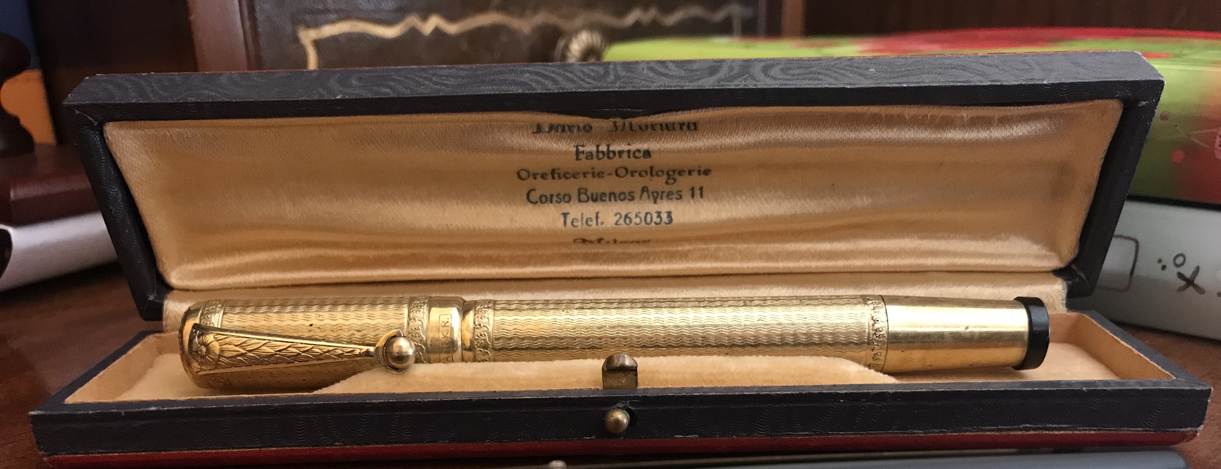 Buongiorno a tutti, vi mostro questa penna che ho ereditato e che ha la caratteristica di avere il pennino rientrante, girando il fondello del fusto. Non ho idea di come caricarla, o meglio ne ho letto in rete qualcosa ma non ho mai provato davvero. Porta l’incisione “Europa” e dovrebbe risalire agli anni ‘20-‘30 del secolo scorso. Mi piacerebbe capire se è un oggetto raro o meno e se può avere un valore non tanto economico ma a livello storico e collezionistico.