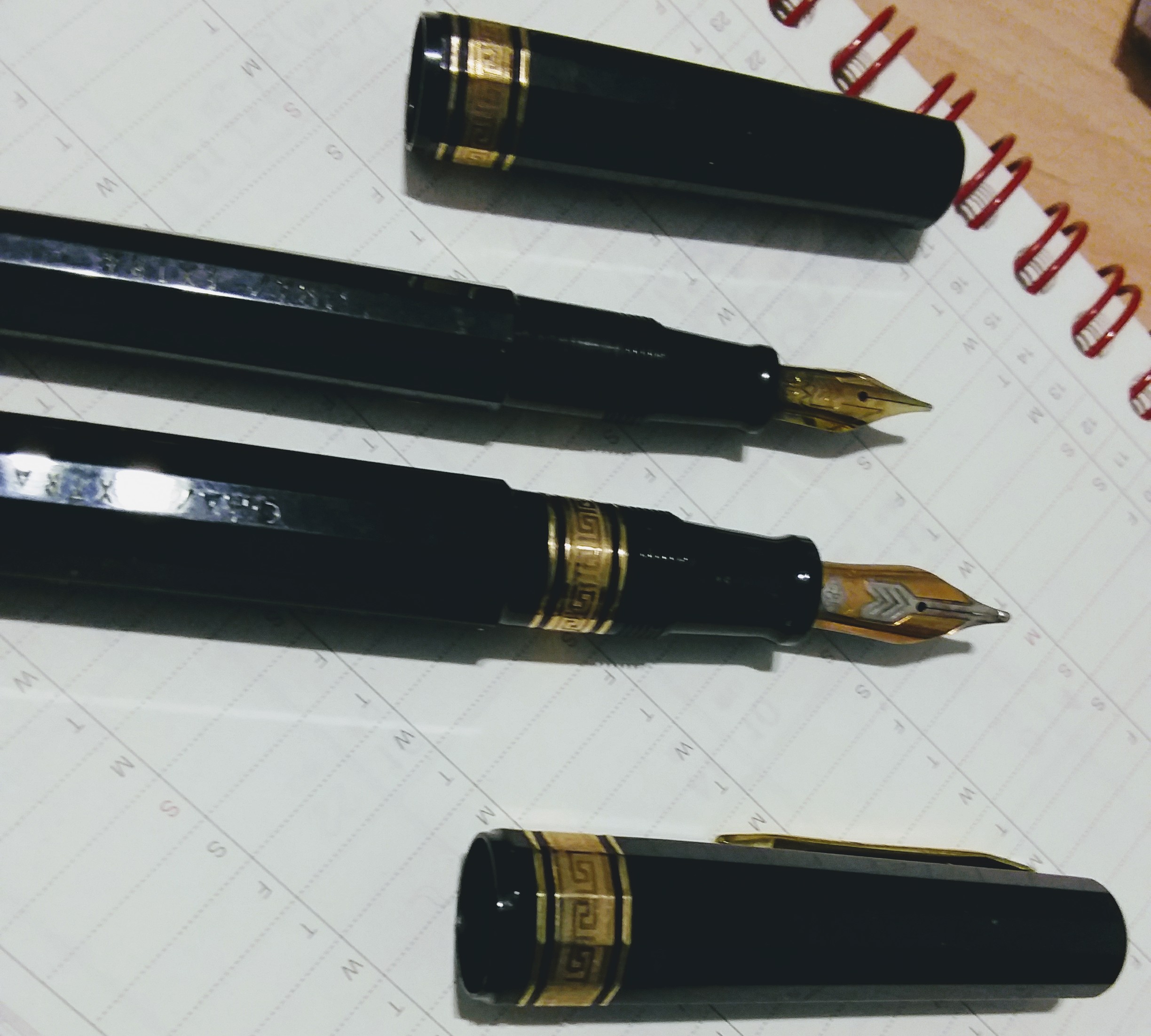 A Natale mi è stata regalata una Omas extra che sembra la sorella maggiore di quella già in mio possesso ( che Sanpei mi aiutò a identificare, Omas extra degli anni 90, 556F) con una differenza che potete vedere in foto. Secondo voi la più piccola è nata così o si è "sgrecata" nel tempo? E la grande è coeva o di altro periodo?