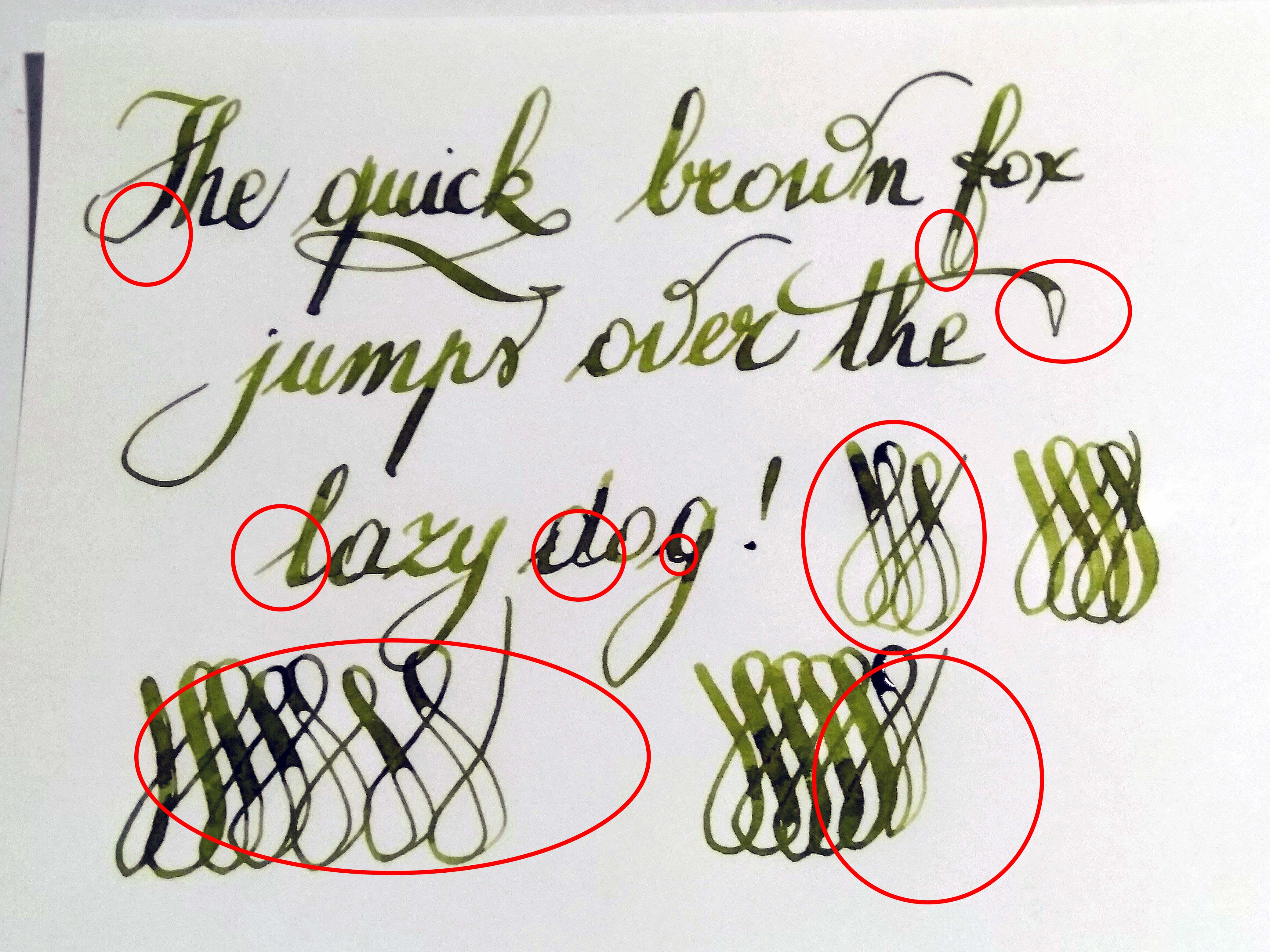 Quindi, puoi diminuire un poco il flusso con un inchiostro più denso, oppure sostituendo il pennino con uno più rigido.