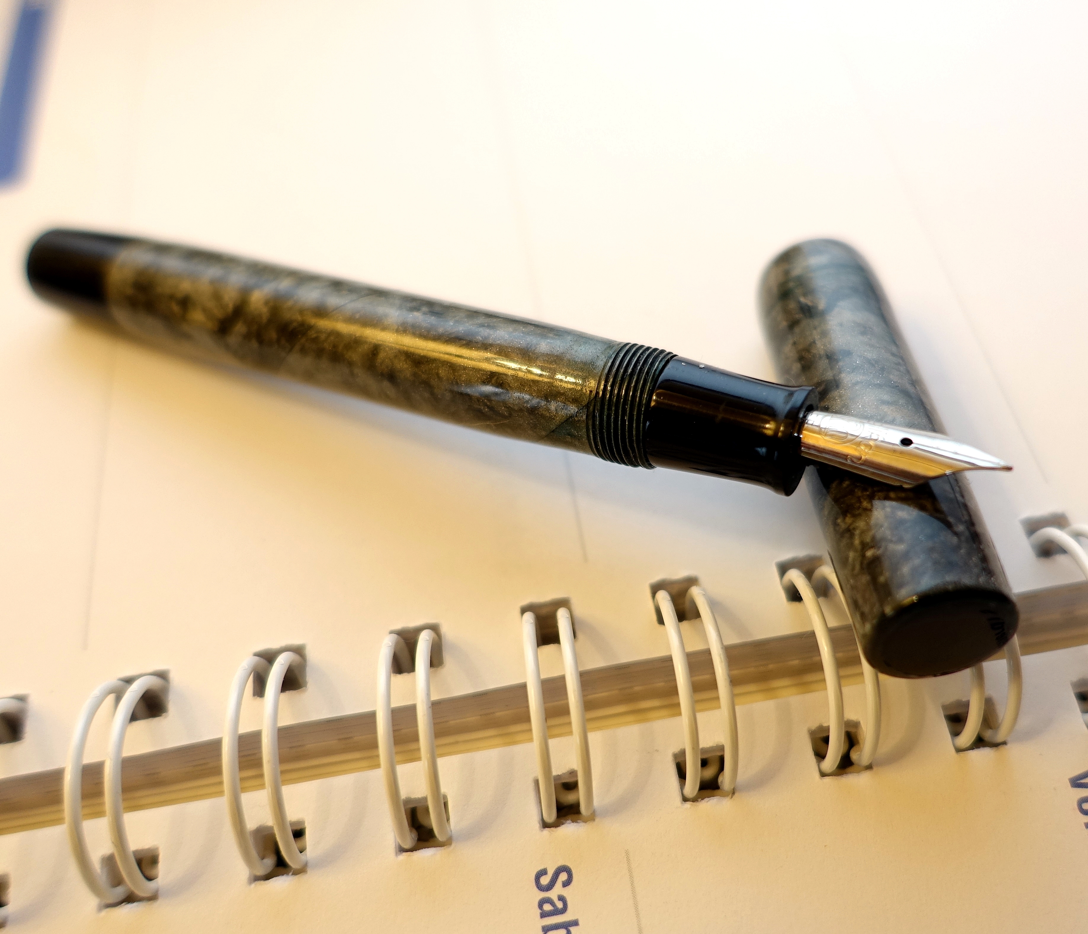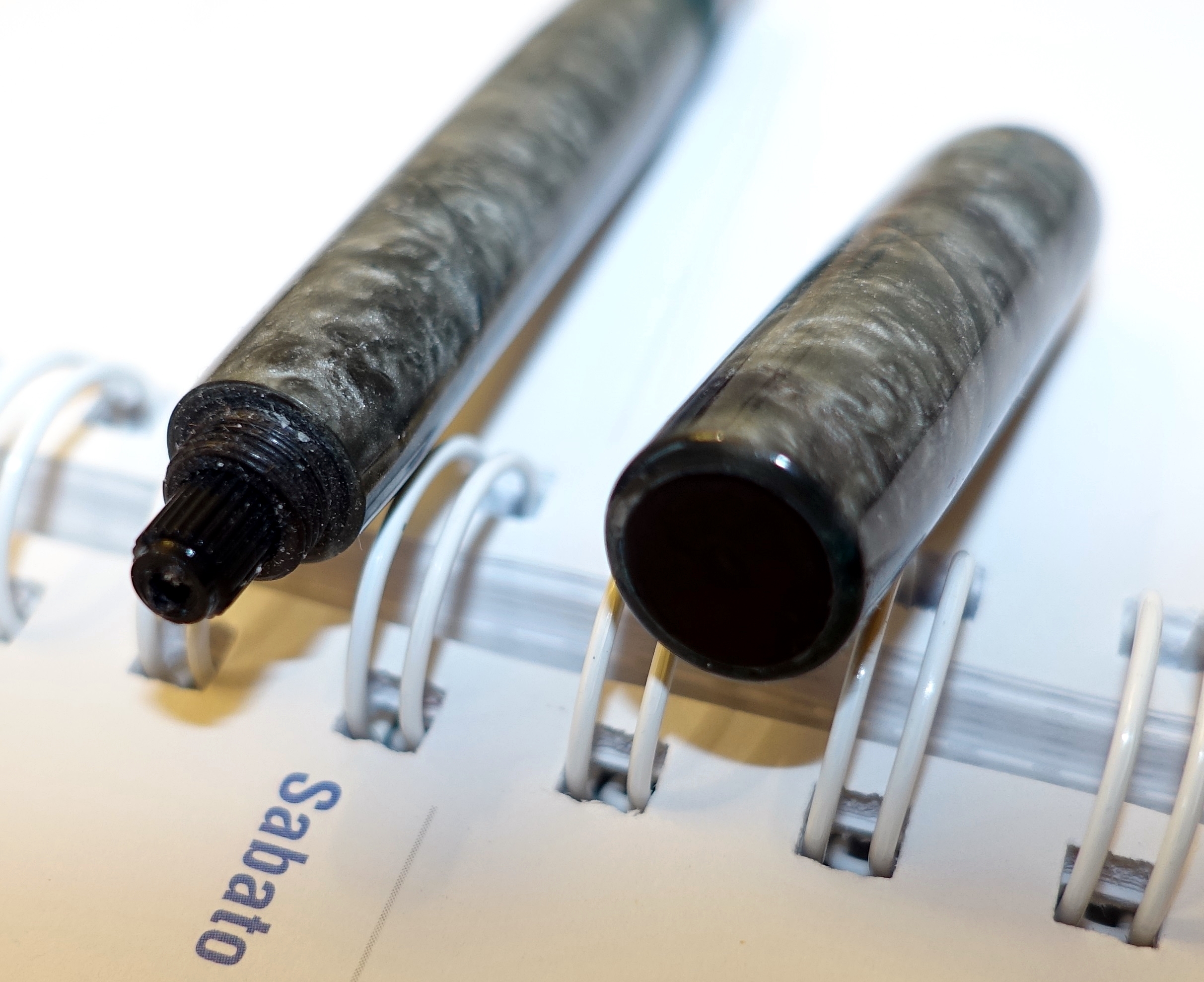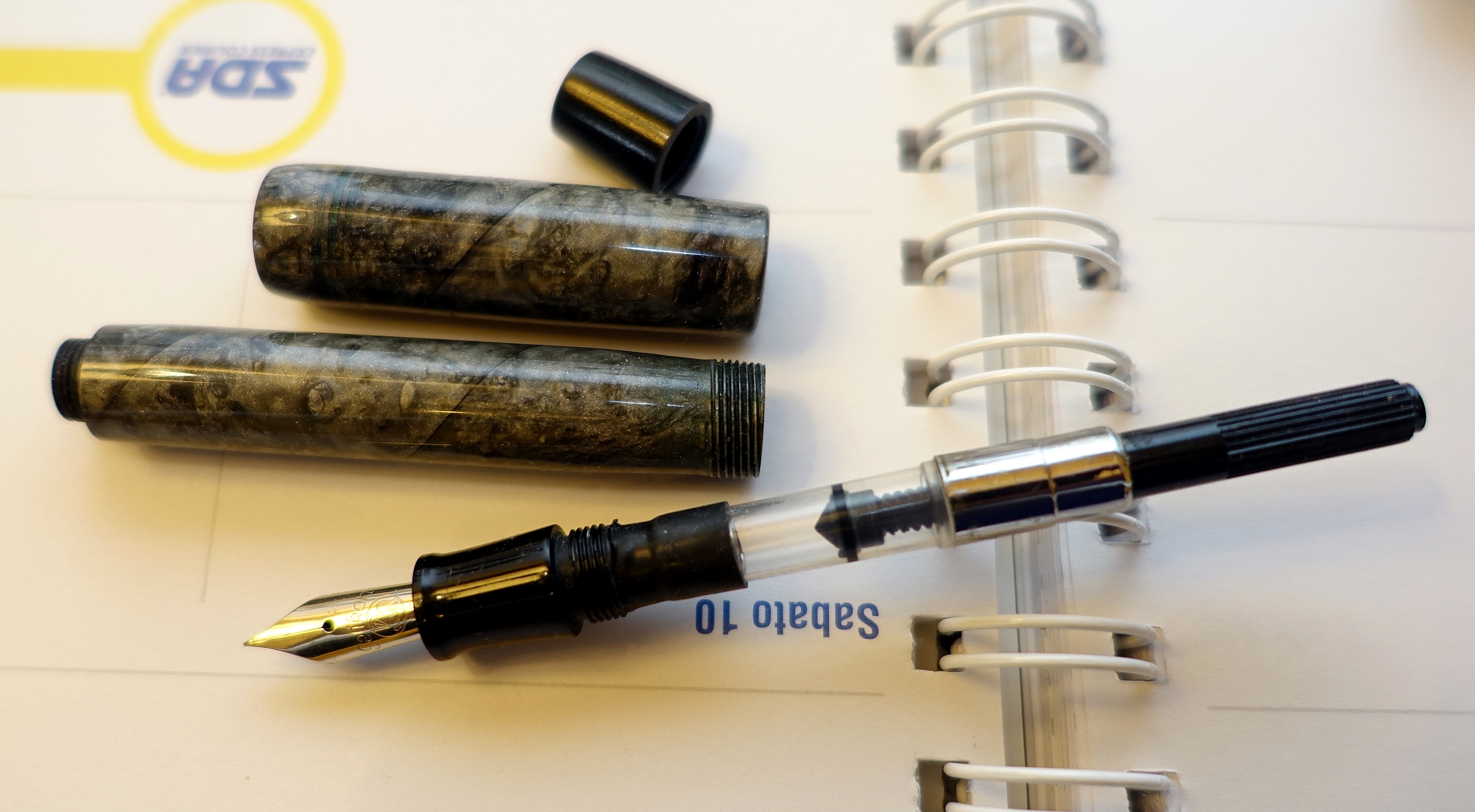 Il risultato è quello che vedete, fortunatamente non ho dovuto scervellarmi più di tanto, tutte le quote combaciavano, il converter si è inserito con la giusta tenuta, per sicurezza ho messo un po' di gommalacca sulle superfici di contatto che in questo caso è esterna, per maggiore sicurezza ho aggiunto un pezzo di sacchetto in lattice per sigillare ulteriormente, ho allargato un poco il foro del pulsante comando della vecchia barra, e per finire ho messo un vecchio pennino di una Pelikan 120.