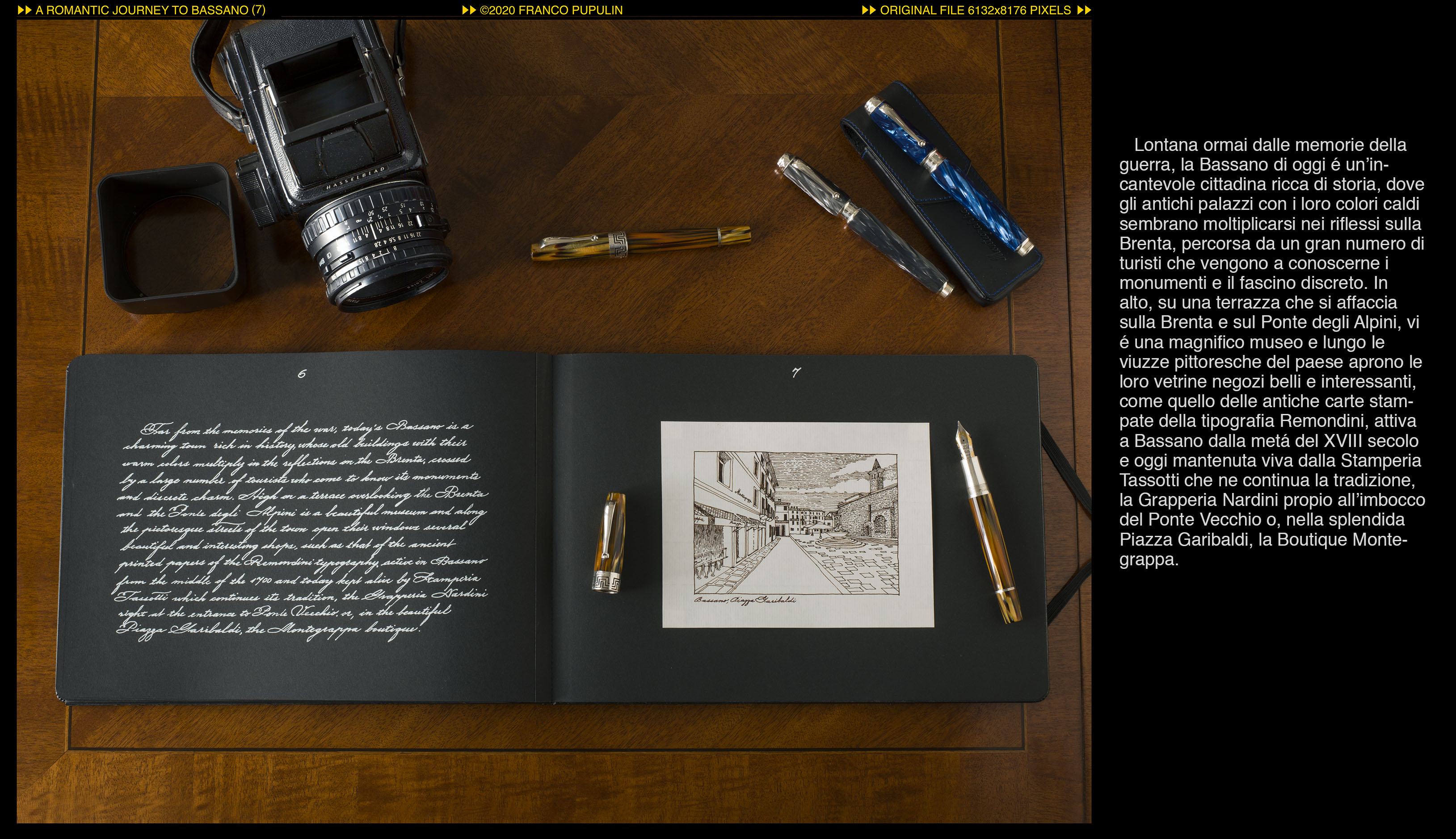 Inizialmente, l’album avrebbe dovuto essere solamente un classico album di fotografie con le loro didascalie. Poi è diventato una specie di racconto illustrato, e il racconto è stato scritto in grafia corsiva. Il risultato d’insieme, con quell’album nero, con le fotografie e gli schizzi, e quel testo corsivo scritto in bianco, mi è infine parso sufficientemente “romantico” da suggerire il titolo del lavoro: “Un viaggio romantico a Bassano del Grappa e alla Montegrappa”.