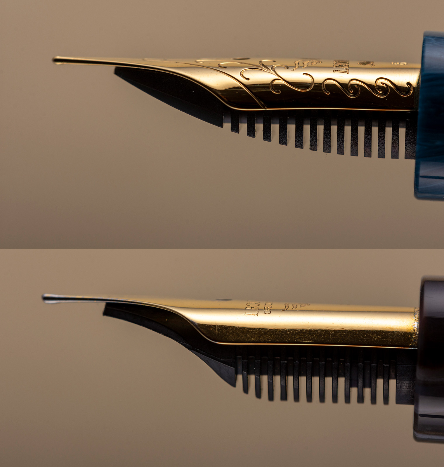 Esteticamente preferisco la grafica semplice usata nel pennino Bock che lo rende differente da quello di altre marche, anche l’incisione della scritta è fatta meglio nel pennino Bock, nel pennino Jowo i decori mi ricordano quelli presenti su altri pennini, inoltre, incisione e decori mi restituiscono una sensazione di troppo carico.