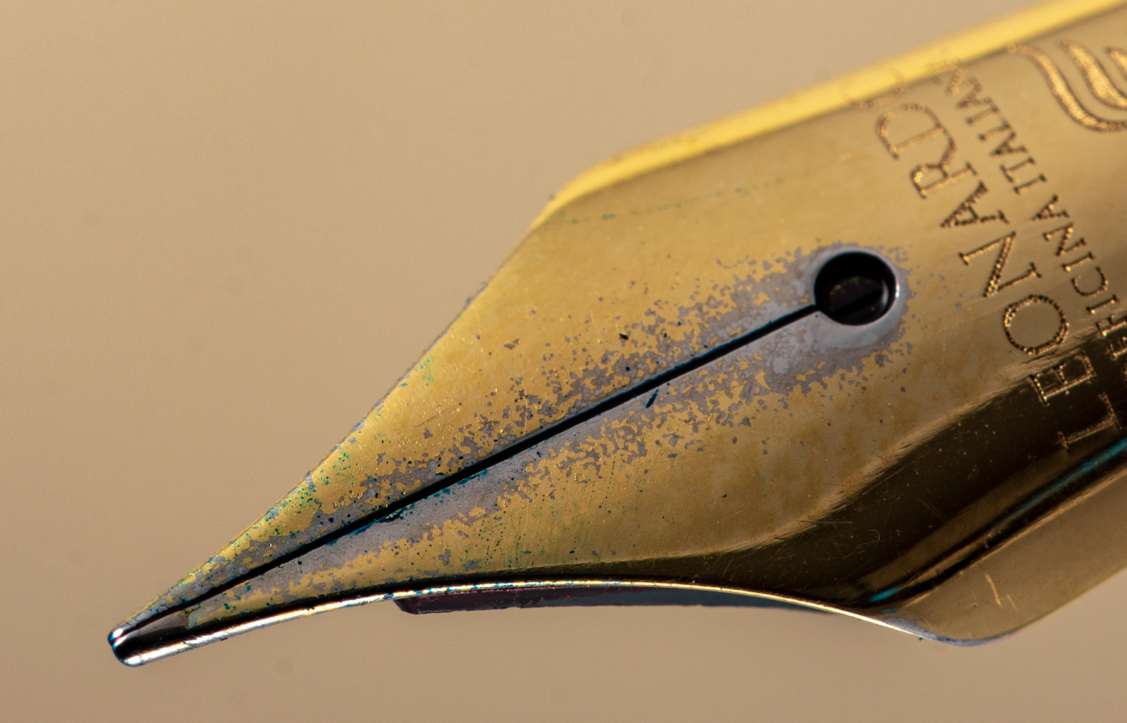 su questo pennino è stata fatta una placcatura con un procedimento per niente accurato, quando si calmeranno le acque penso che manderò la penna in assistenza per il cambio del gruppo di scrittura Bock.