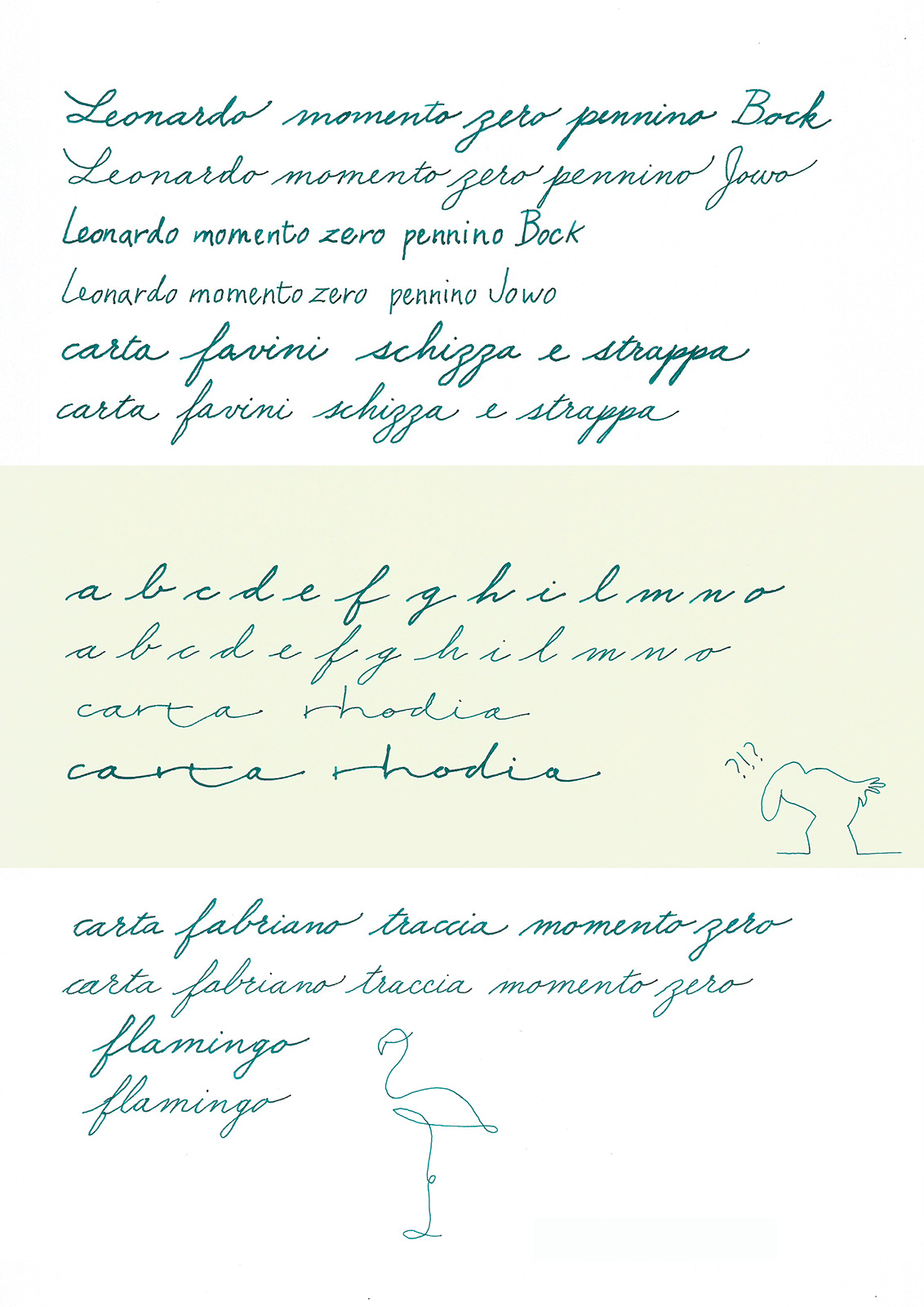 Veniamo alle prove, ho usato carta formato a4 per calligrafia da 70 g/m², non conosco la marca, ma tiene l’inchiostro molto bene, inchiostro Jacques Herbin Emeraude de Chivor.