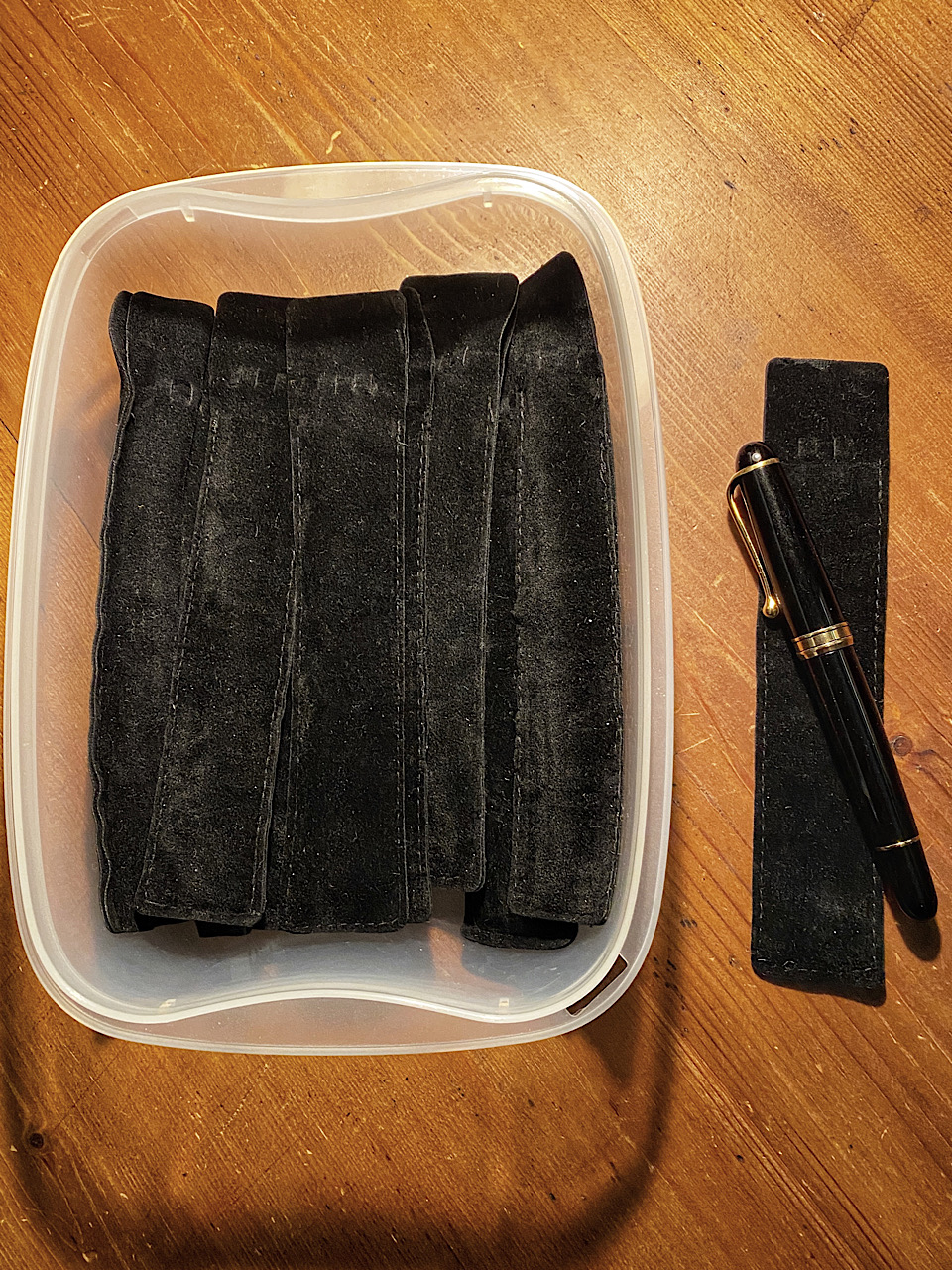 Cercavo un astuccio per riporre le penne in casa, quando non inchiostrate. Per ora vorrei evitare il classico vassoio con la vetrinetta perché non saprei dove metterlo, ma dei vari astucci come quelli scolastici ho il timore che il materiale non sia adatto e faccia guai. Non ho capito neanche se quelli in pelle siano buoni per le penne o procurano anch'essi dei danni. Dalle discussioni del forum mi pare di capire che anche gli elastici alla lunga posso allentare le clip o lasciare traccia sul fusto. Qualcuno ha suggerimenti per prodotti di qualità che non costino troppo?