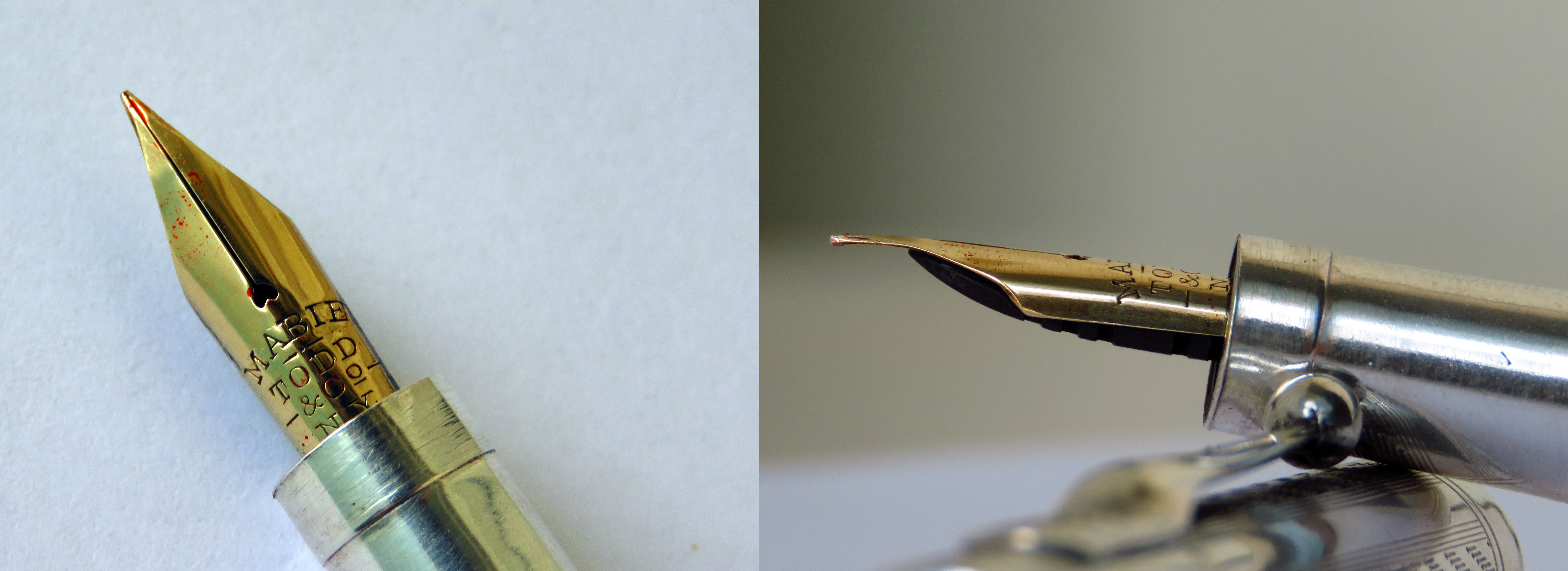 La spiegazione che mi sono dato riguardo il taglio dei rebbi molto lungo è dovuta probabilmente all'ottenimento di un miglior flusso di inchiostro, più costante anche quando si preme e il pennino che si "solleva" dall'alimentatore continua ad avere un miglior contatto con lo stesso; anche perchè questi pennini nel momento in cui si fanno flettere non piegano all'altezza del foro di sfiato, ma molto in basso, quasi in punta.