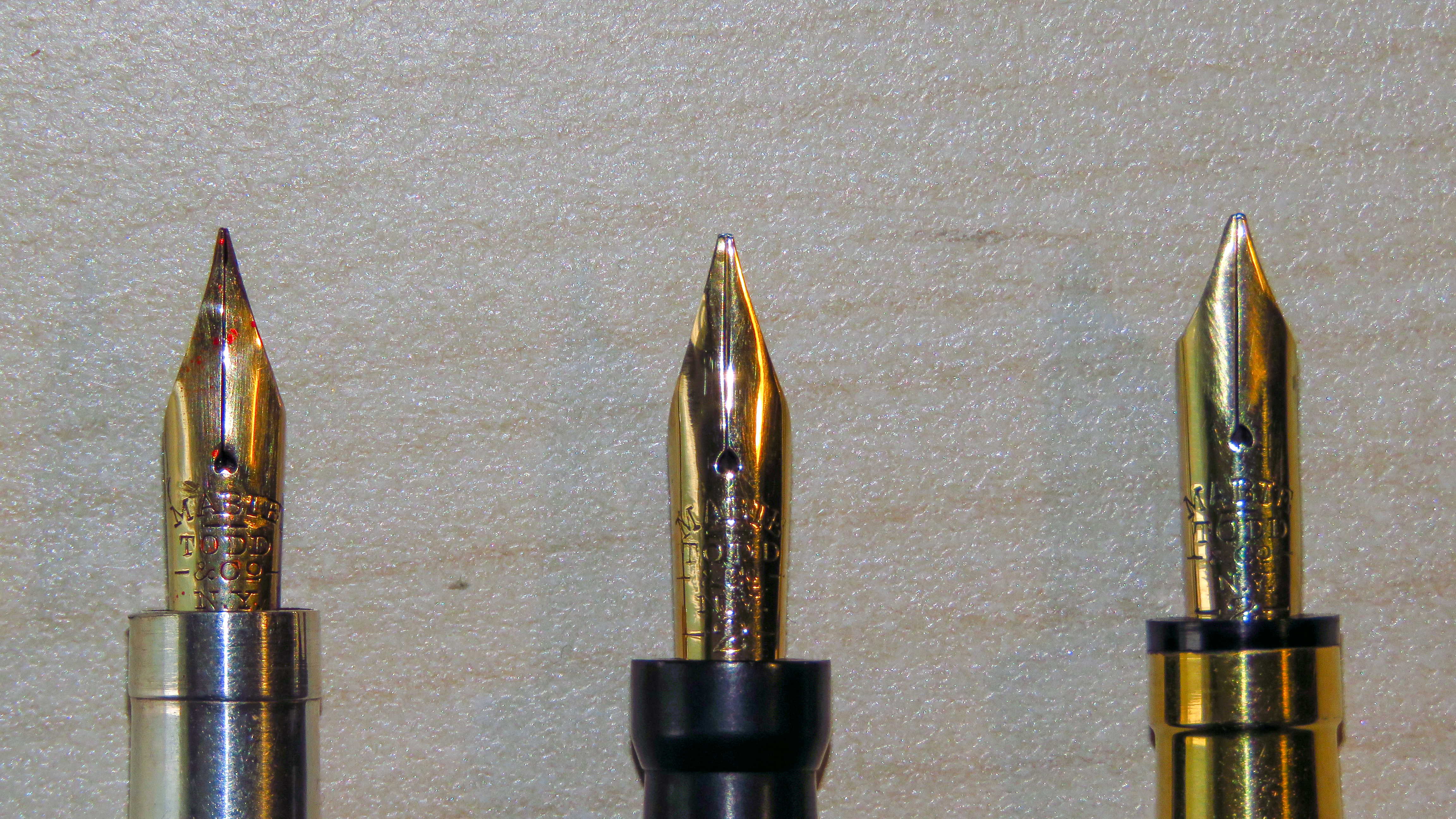 I primi due sono wet noodle, il primo è quello della penna mostrata in questa discussione, il secondo (che per altro è un T.U. ossia con la punta sollevata) è di una Self Filling; l'ultimo è della penna rivestita in oro ed è uno stub flessibile.