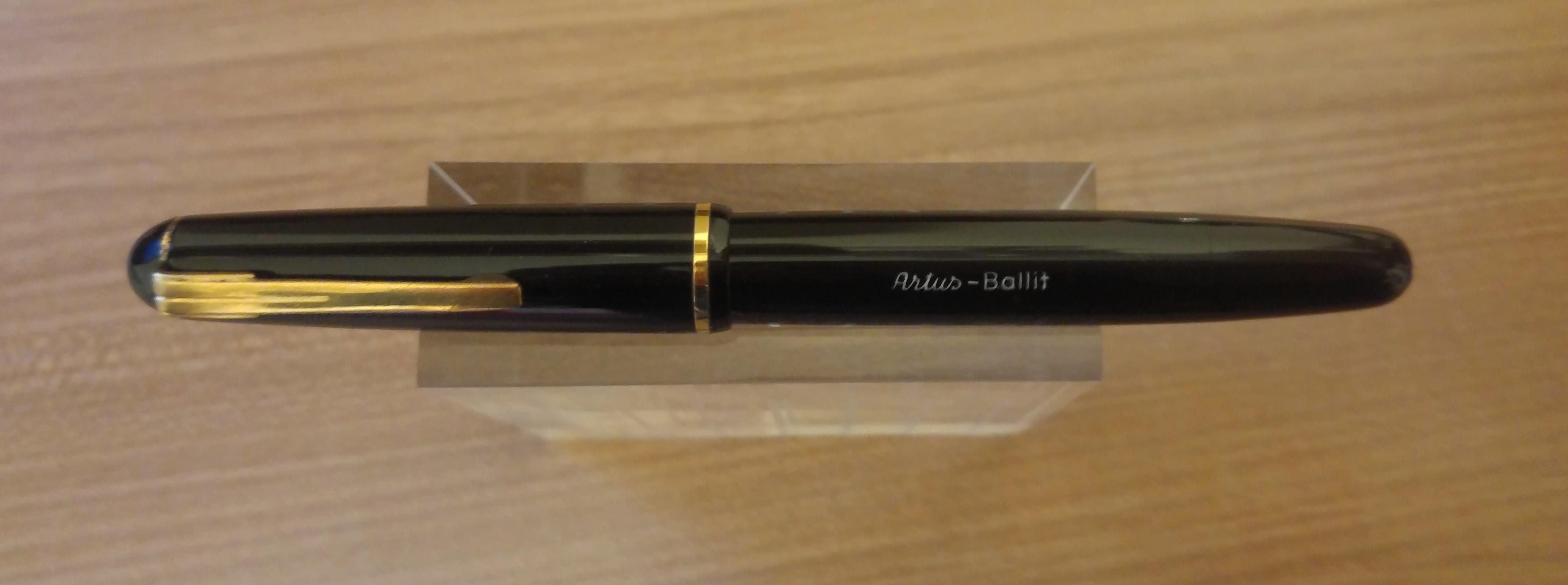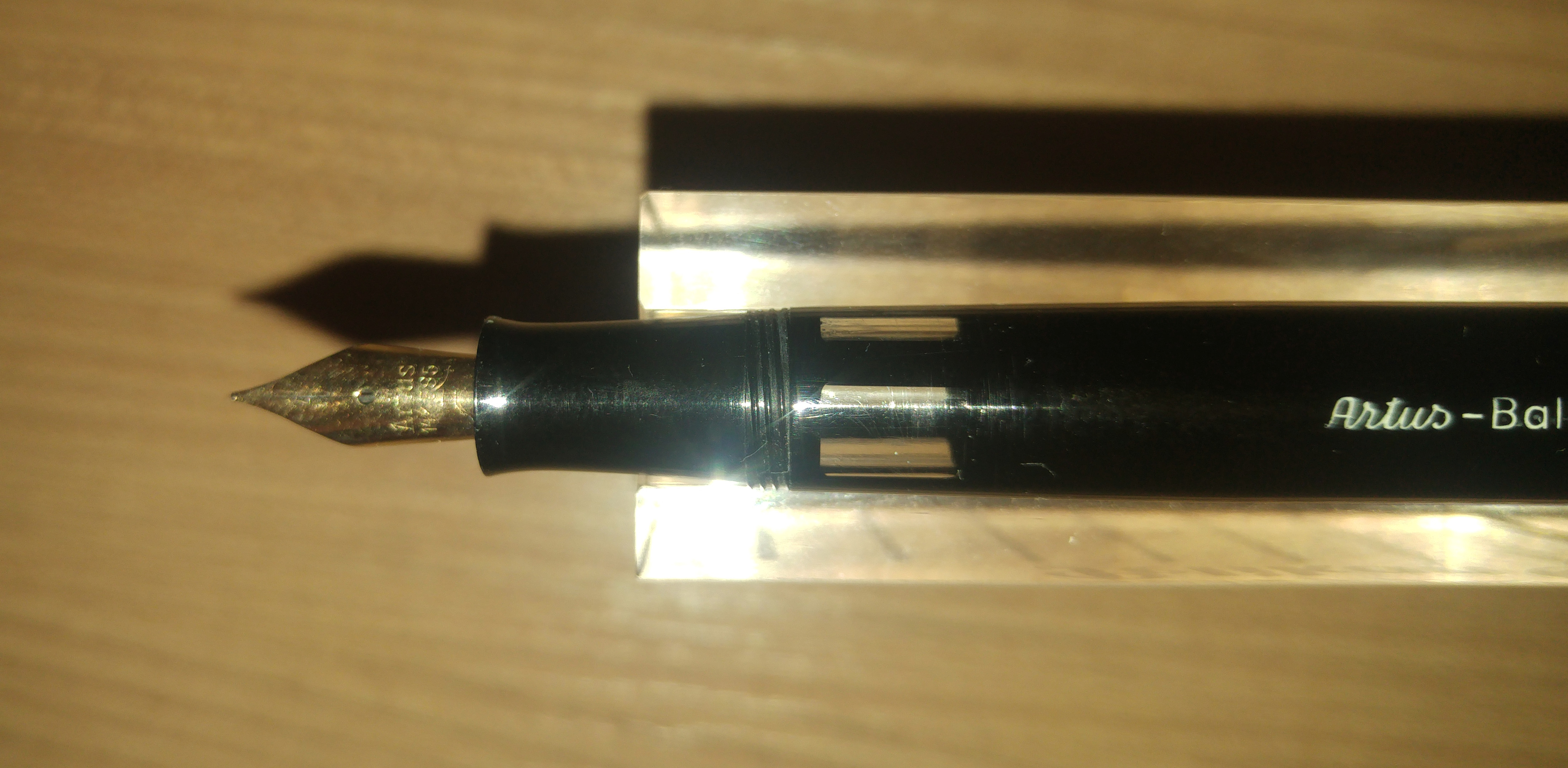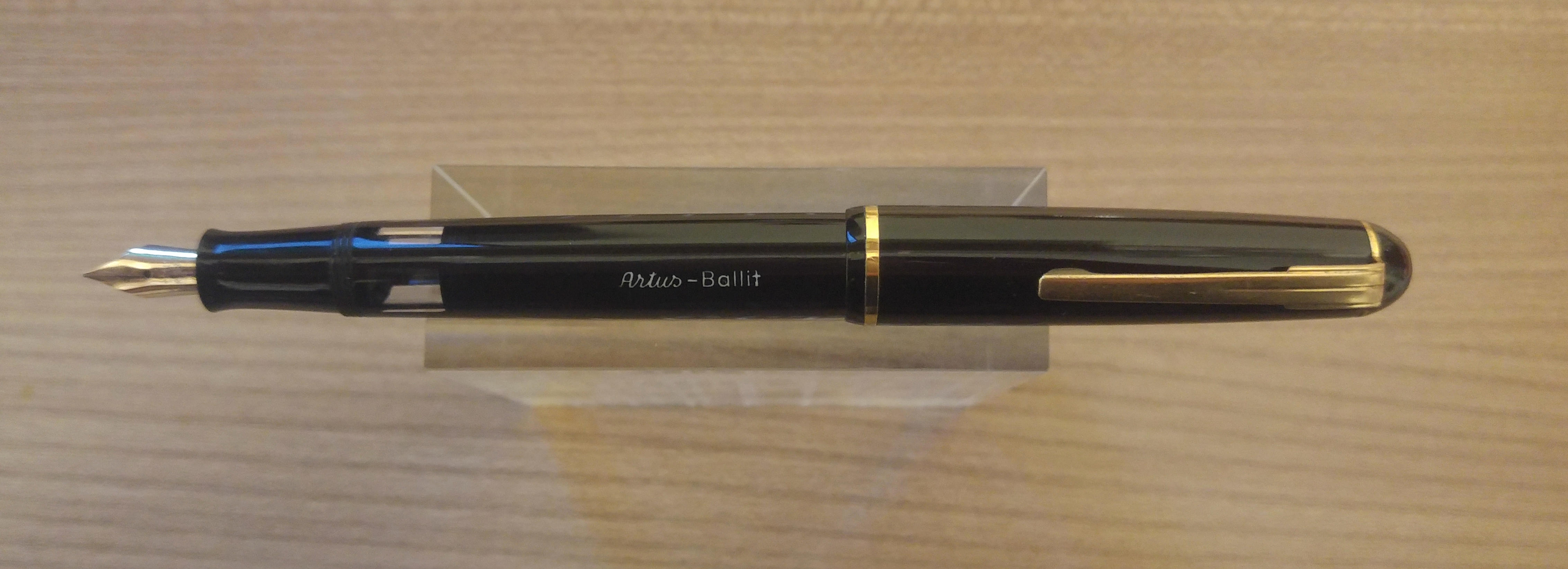 Secondo me ogni penna fa storia a se, questa è la mia Artus, una Ballit 22b, una penna su cui stavo commettendo un tragico errore di valutazione: pensavo che non valesse la pena rimetterla in sesto. Quando la trovai aveva un crack sul cappuccio ed un piccolo solco più visibile sul fusto nella zona della finestra d'inchiostro, poi ho provato il pennino con maggior attenzione e ne sono rimasto completamente stregato. Con tanta pazienza, il meglio delle mie capacità e un po' di cianoacrilico, sono inaspettatamente riuscito a rimetterla a nuovo, e non me ne separerò più.