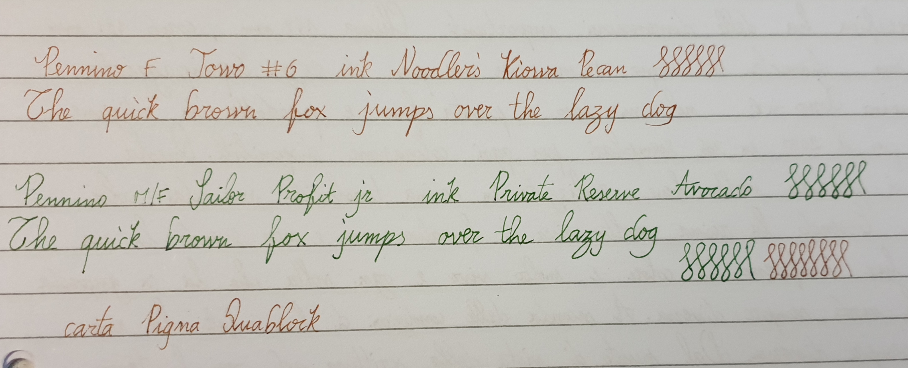Allego prova scrittura. L'inchiostro non è lo stesso ma non ho ancora mai caricato il jowo con qualcosa di diverso dal kiowa pecan (così come non ho mai messo questo inchiostro su altre penne) quindi non ho riferimenti su quanto la differenza di inchiostro possa influenzare il test.