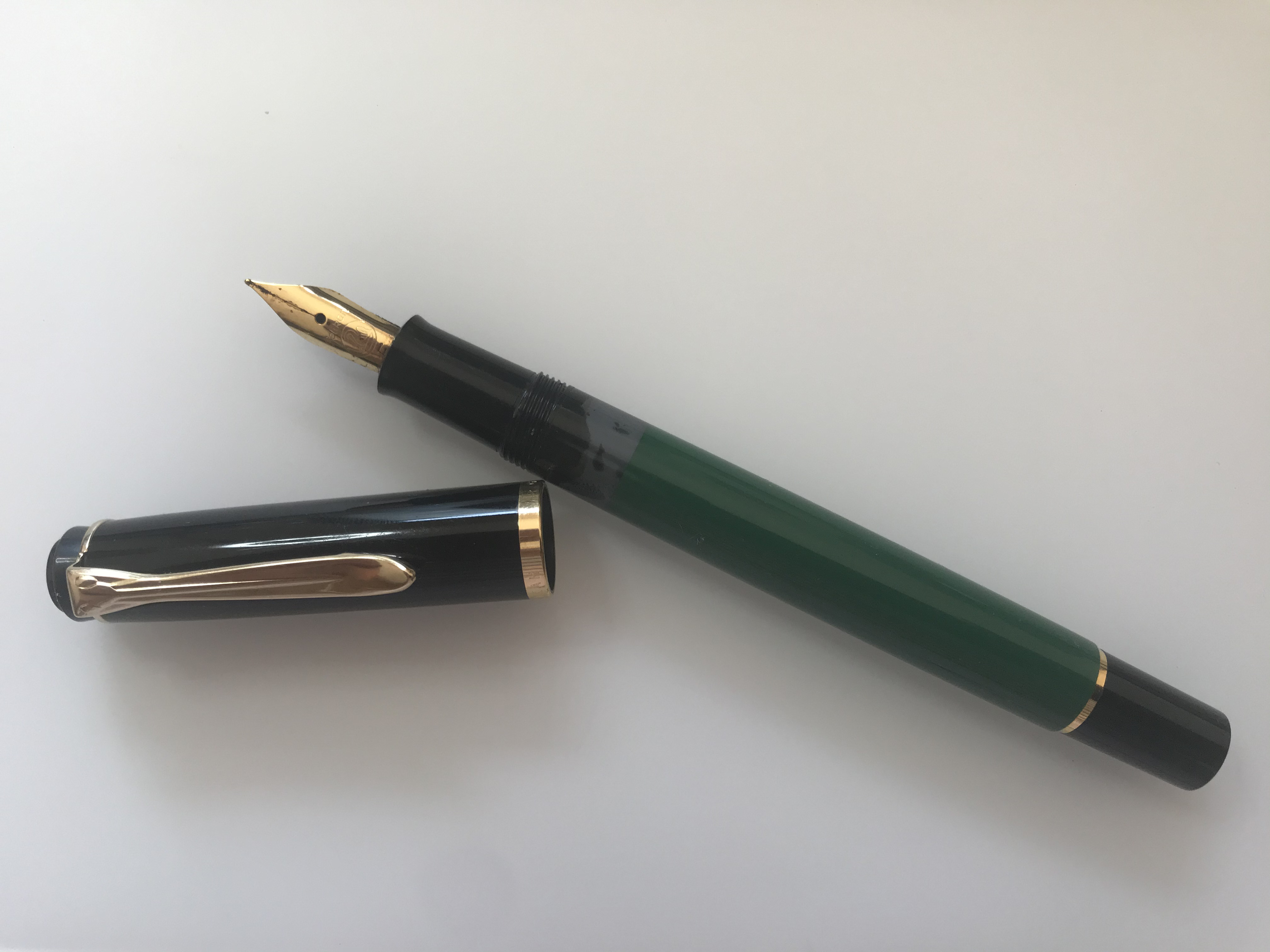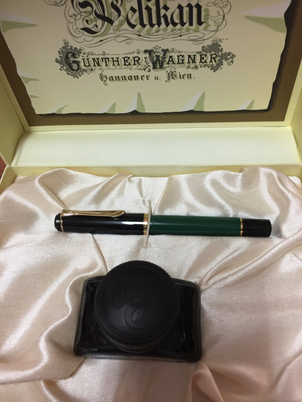 Trovo questa penna molto bella e ben funzionante, ho preso anche io il cofanetto tempo fa. Non so quanti pennini ho acquistato finché ho trovato il fine che mi piaceva. La prossima sarà la sorella più grande,la M251 che è più adatta alla mia mano. Dal punto di vista stilografico sono nato con il verde nero della Pelikan.