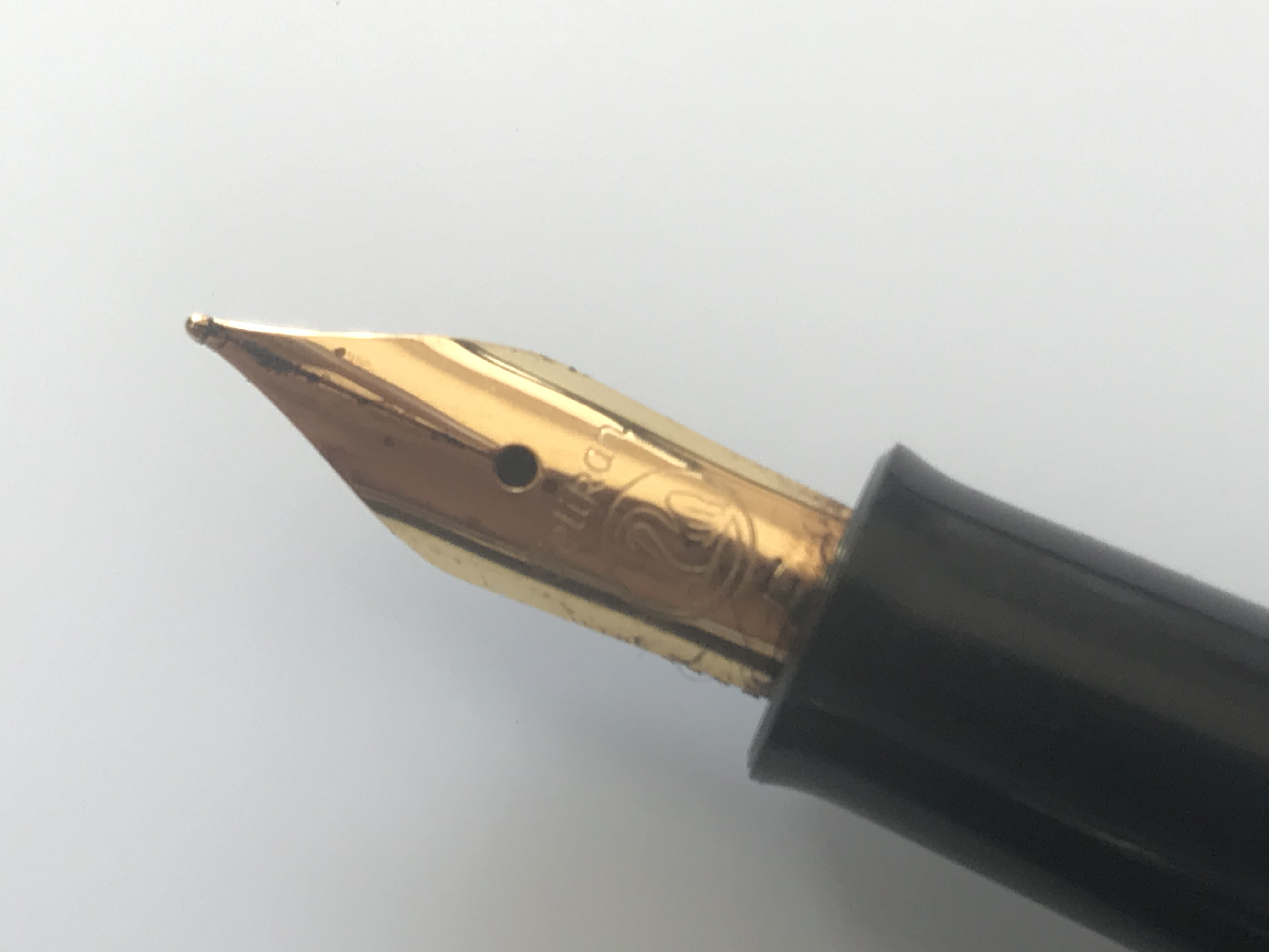 Il pennino è in acciaio dorato con punta in iridio. Disponibile in differenti formati, quello da me scelto è un F. Si tratta di un pennino non completamente rigido: non è un flessibile, tantomeno semiflex, e tuttavia presenta una certa morbidezza che rende la scrittura abbastanza comoda e fluida. Esteticamente si presenta come un comune pennino Pelikan, sobrio, con lo stemma del pellicano e l'indicazione della dimensione. Le performance sono abbastanza buone.