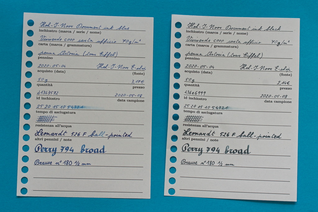 La seconda parte è su carta: stampo un modulo apposta sempre sulla stessa carta (da stampante, per notare gli eventuali problemi) in formato A6 e riporto le informazioni di base, prova di asciugatura e resistenza all'acqua, campioni di scrittura e il codice dell'inchiostro sull'elenco a pc. Il tutto viene forato e conservato in un raccoglitore a spirale apribile.