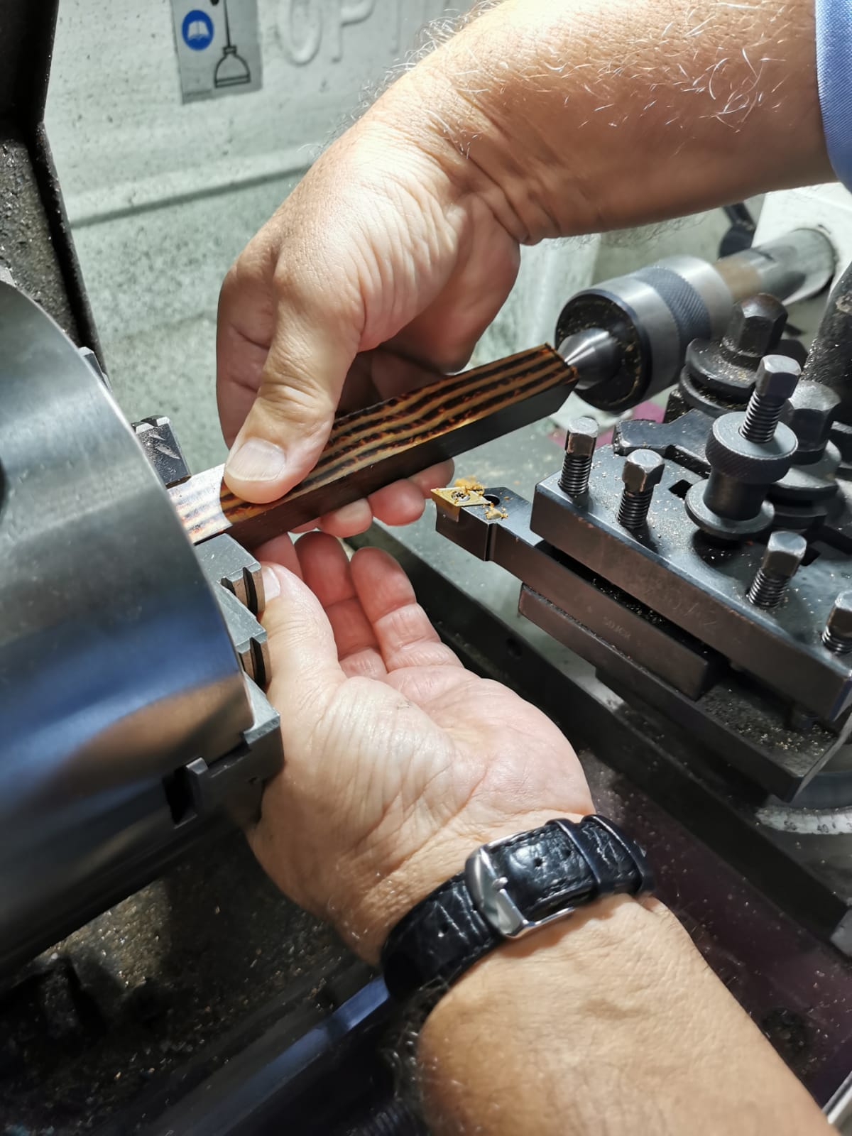 Qualche settimana fa ho chiesto a Salvatore se sarebbe stato possibile realizzare una penna con quelle bellissime barre, quando con il suo solito garbo mi ha risposto "ma certo Francesco", in quel preciso istante sono suonate per me le trombe del paradiso: una esclusiva Leonardo Officina Italiana fatta per me a mano in celluloide Arco Marrone. Una penna realizzata sul tornio da Ciro e Salvatore Matrone e su cui avrei avuto anche la possibilità di scegliere qualche dettaglio: what else?