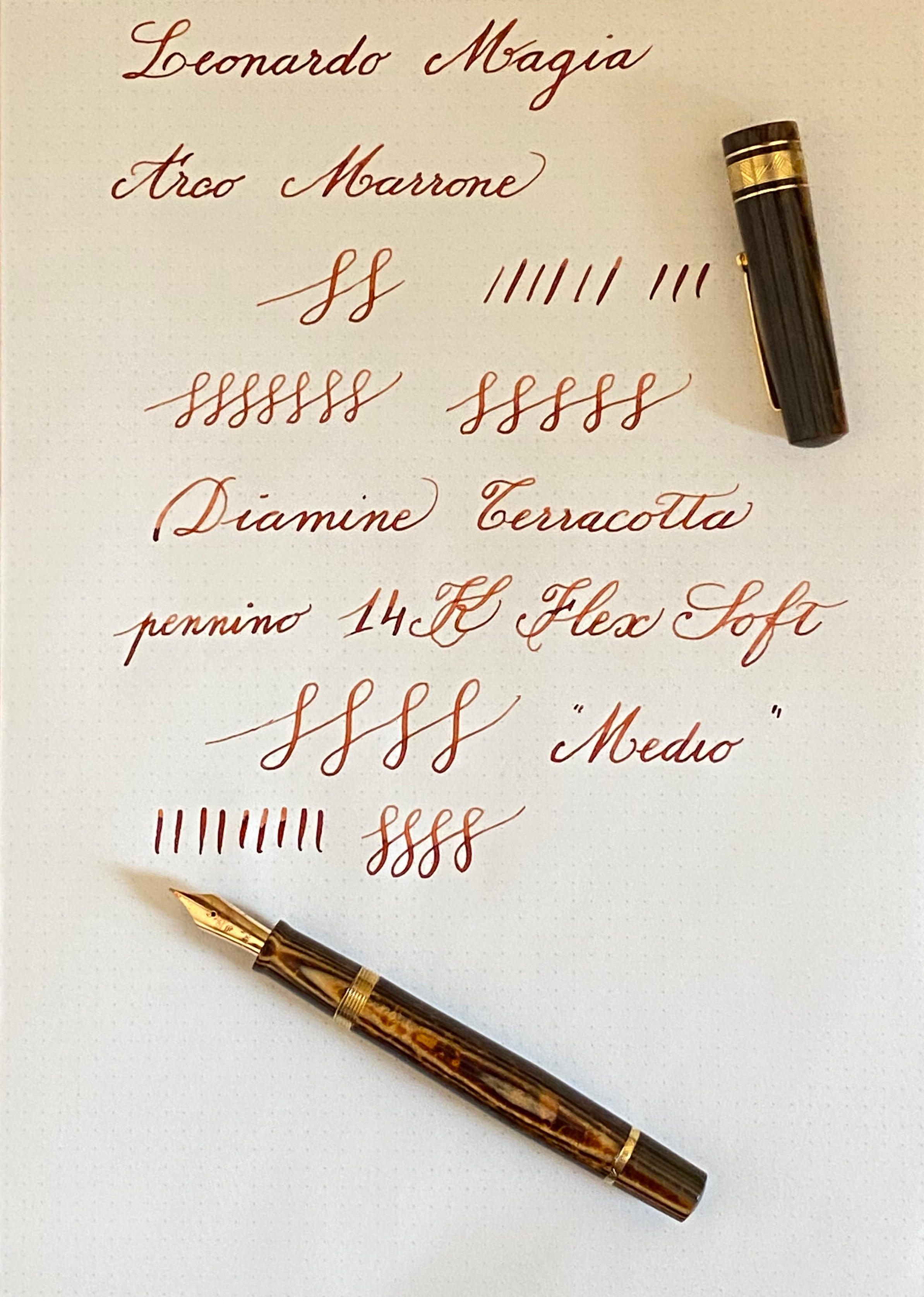 Era arrivato nei laboratori di Salvatore qualche giorno prima ed ho avuto la possibilità di provarlo su un prototipo: è stato amore al primo contatto con la carta. Mi ha impressionato per la sua morbidezza e la piacevolezza che restituisce quando scivola sulla carta, e poi flette bene, si riesce a modulare il tratto, il pennino risponde bene con delle variazioni tutto sommato veloci. Ma scrive come un pennino vintage ? Magari come un fuoriclasse tipo un flessibile Omax Extra Lucens ? No, no ha la stessa variazione di tratto e la stessa reattività, ma a parte il fatto che l'ho messo a confronto con un assoluto campione, un riferimento inavvicinabile anche da molti suoi contemporanei, c'è anche da dire che con il FlexSoft partiamo da una gradazione M, nel caso dell' Extra Lucens partiamo da un tratto EF. Però non è difficile come un pennino vintage, anche nelle mani di un principiante è un pennino rotondo che si governa bene, scrive con un bel flusso abbondante ma non eccessivo ed ha un tratto che non perde un colpo. Il solo difetto che ha questo pennino è che, ad oggi, è realizzato solo in gradazione M, cosa che in generale preferisco amando i tratti corposi e che rendono giustizia a qualsiasi inchiostro, ma che reputo sarebbe perfetto in gradazione EF così da poter gustare meglio le variazioni di tratto. Chissà magari in un futuro vicino potrebbero essere disponibili anche nelle gradazioni più sottili. Lo scorso Natale ebbi il piacere di provare il Calligraphy nib di Montbalnc, non saprei dire se uno è migliore dell’altro, dico solo che scrivono entrambe bene e entrambe restituiscono, a loro modo, il piacere di una scrittura che ricorda un flessibile vintage, tuttavia mi sento di dire che questo pennino farà a sua volata parlare di sé. Credo che le case che realizzano pennini hanno recepito la richiesta degli appassionati e si stanno adoperando per accontentarli.