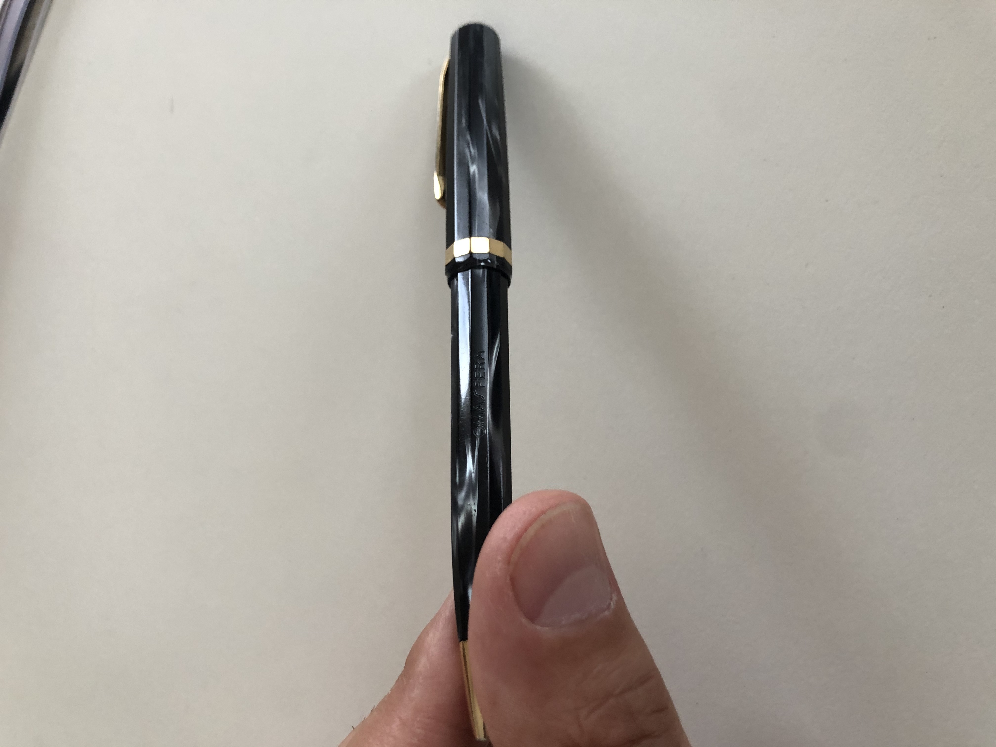 La stilo è molto rovinata sul fondello ed ha le verette sicuramente che si muovono, credo sia un modello anni 90 in resina di vegetale che in alcuni punti si è ristretta, probabilmente anche il fusto.