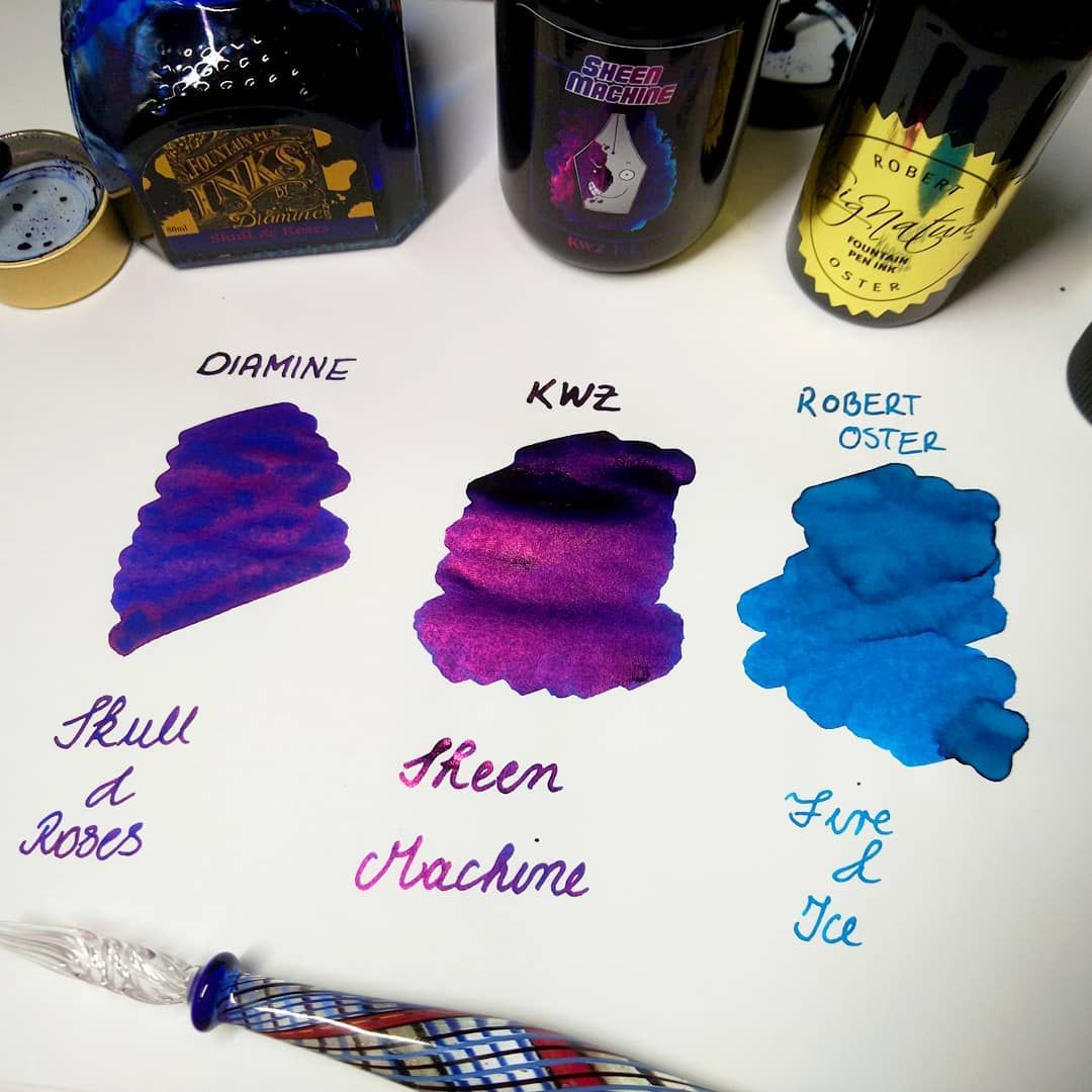 In questa foto si vede bene lo sheening nel Diamine e KWZ. Nel Fire and ice dovrebbe emergere un rosso. Comunque la Tomoe River è la carta migliore per lo sheen, a volte l’unica che lo fa emergere.