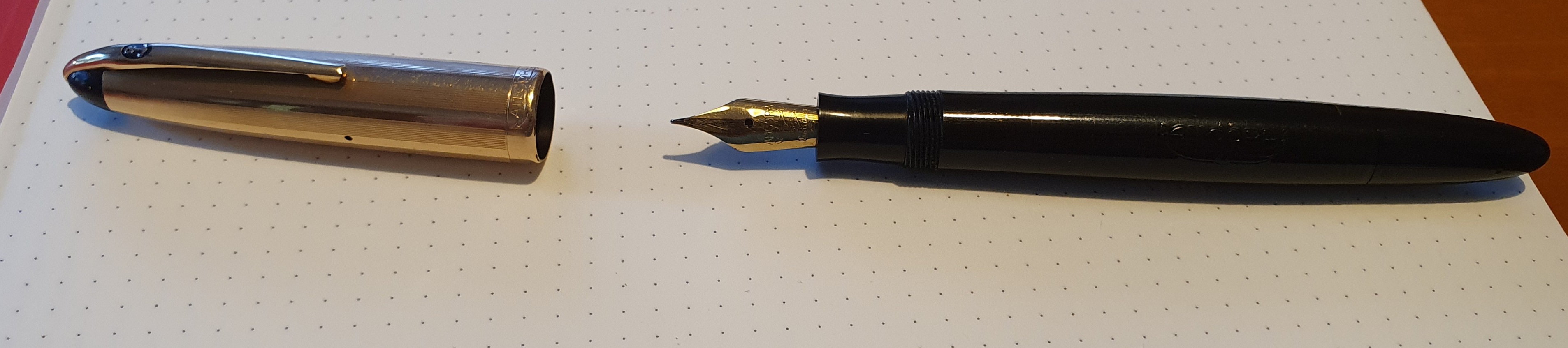 Non sembra resina nera ma celluloide anellata; da come descrivi il caricamento sembrerebbe qualcosa tipo vacumatic o semplice pulsante di fondo. Mah... Metti una foto di questo stantuffo. Grazie.