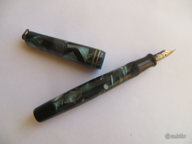 La tipologia di penna fotografata era molto comune negli anni '40 primi anni '50 del secolo scorso: celluloide, pennino d'oro per le top acciaio per le comuni, alimentatore in ebanite, caricamento pulsante di fondo o levetta; perchè celluloide ed ebanite? Perchè le materie plastiche non c'erano ancora. Il Prof. Natta il Moplen lo inventò fine anni '50! Una particolarità la tua penna è da signora: un anellino invece della clip. Ci si metteva una nappina per abbellimento oppure la si attaccava a una catenina al collo. Saluti.